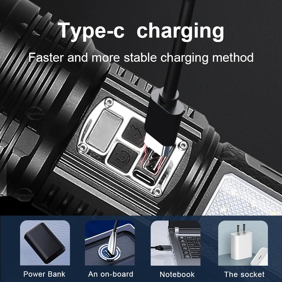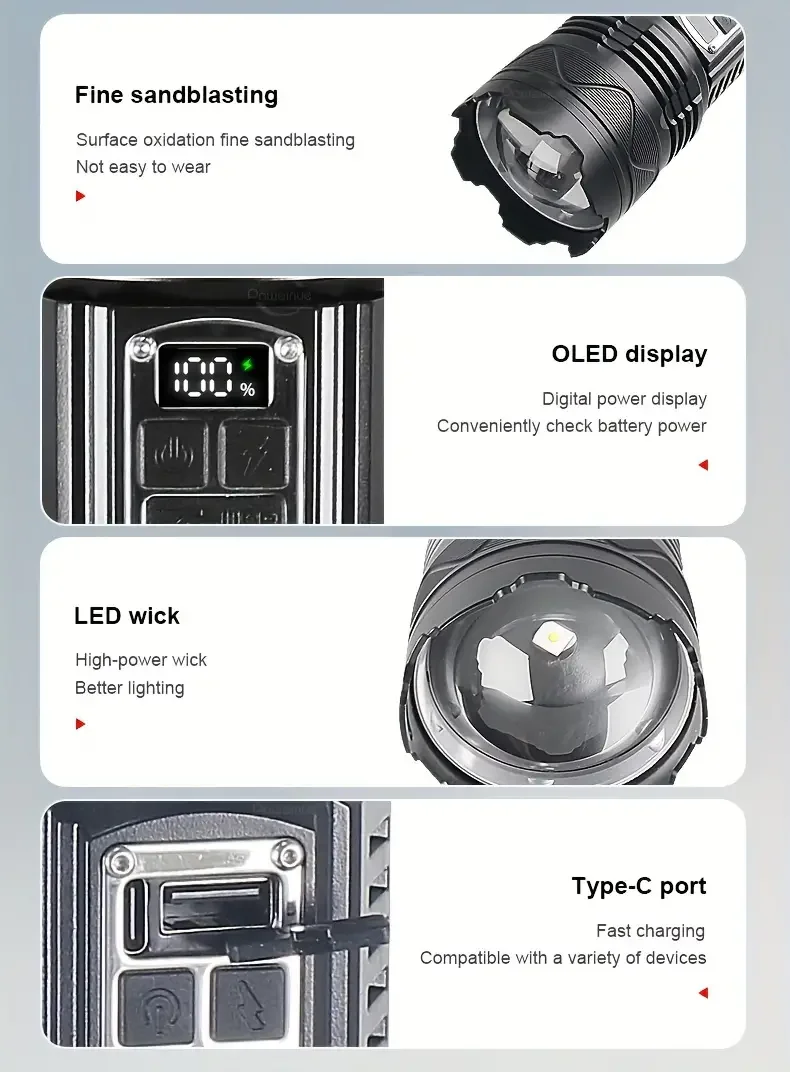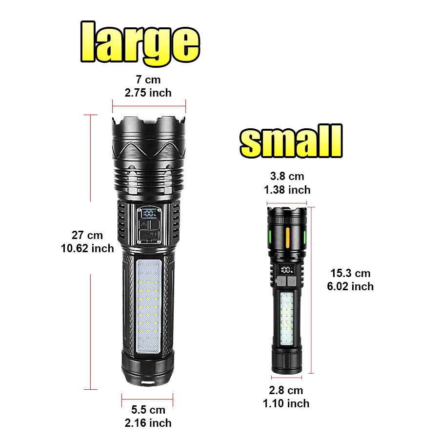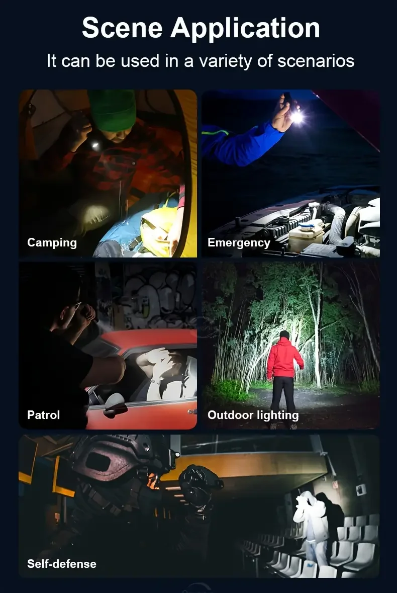2.[Usando tempo, banco de potência, atualização de display digital] A lanterna recarregável foi recentemente atualizada, reduzindo o tempo de carregamento e prolongando a vida útil.O display digital exclusivo da porcentagem da bateria também permite que você não se preocupe mais com a energia restante.A bateria integrada de grande capacidade e o carregamento rápido inteligente Tipo C também tornam o carregamento mais rápido.Também pode ser usado como fonte de energia móvel para carregar telefones celulares em emergências.