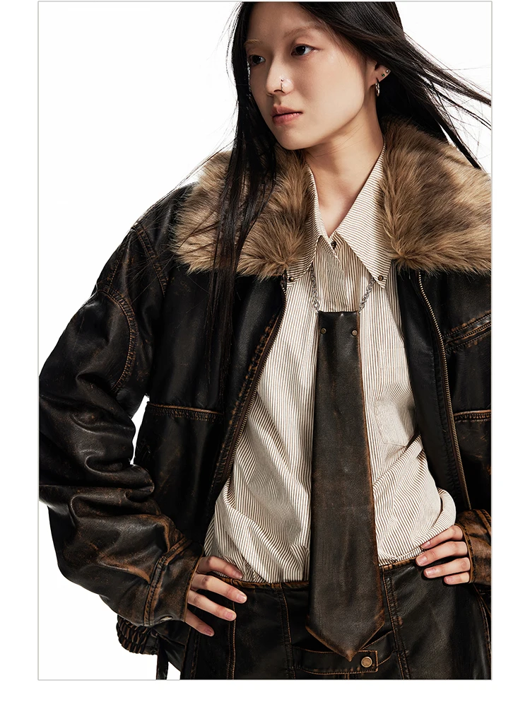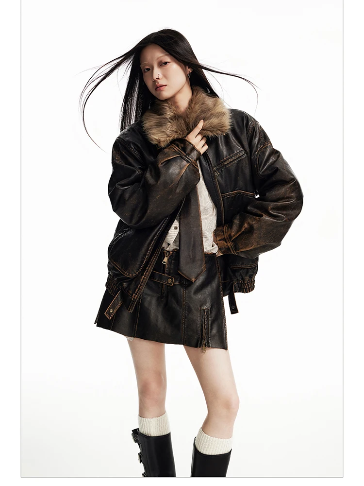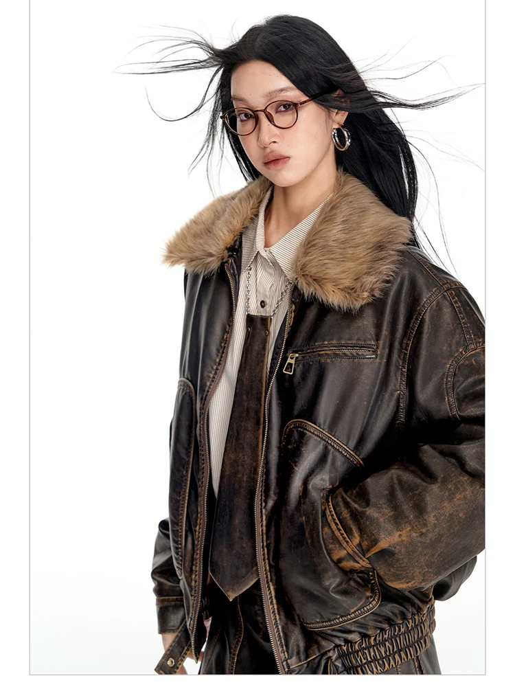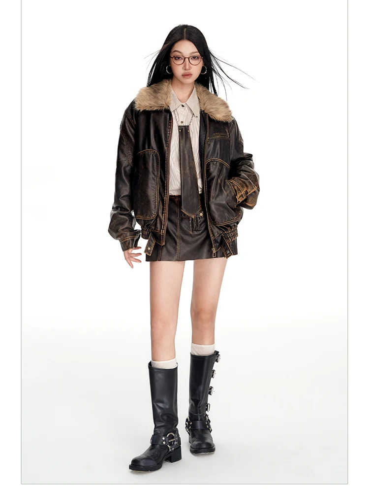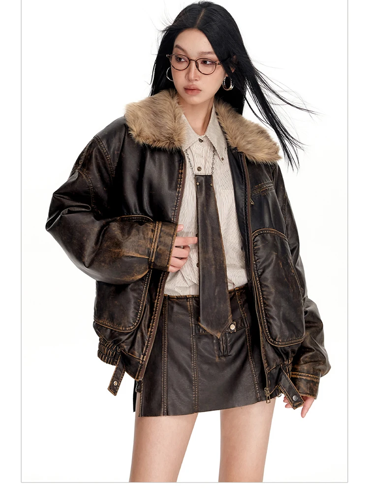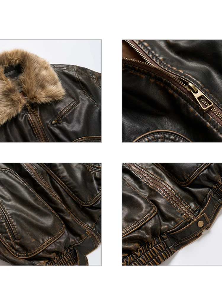 - > Lautaro primavera outono legal bonito vintage angustiado marrom jaqueta de couro do plutônio feminino gola de pele do falso roupas de grife de luxo