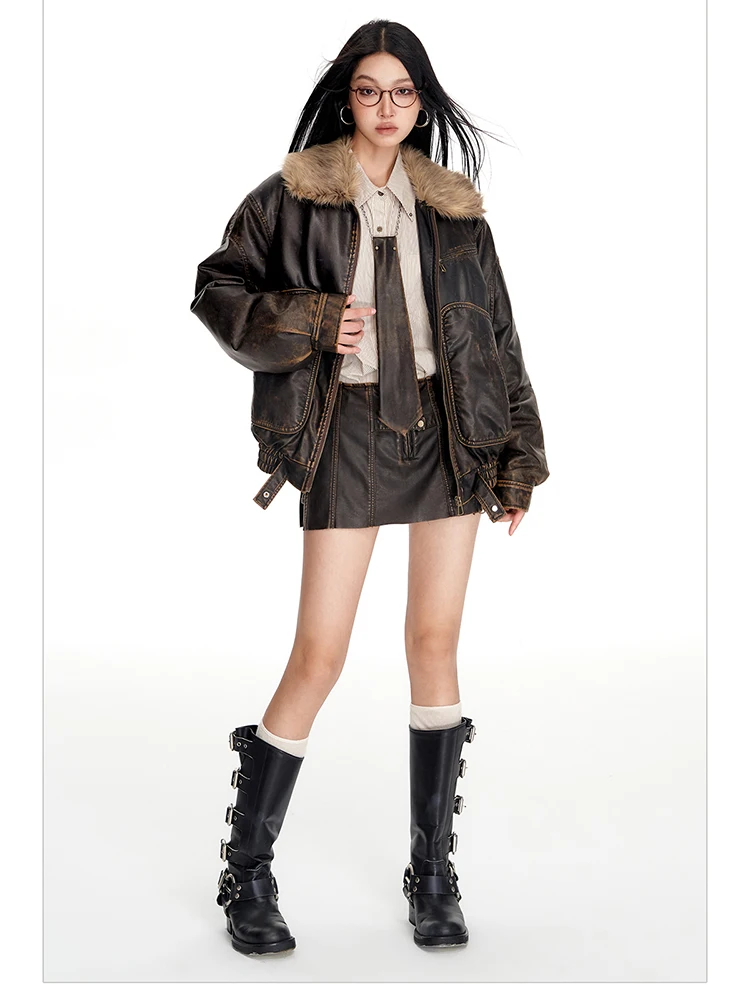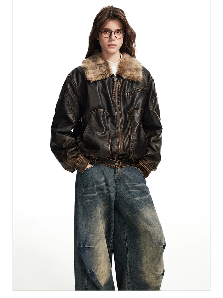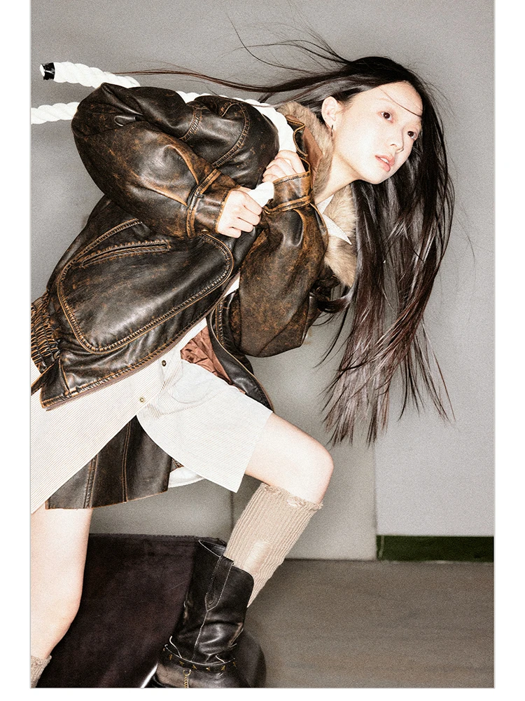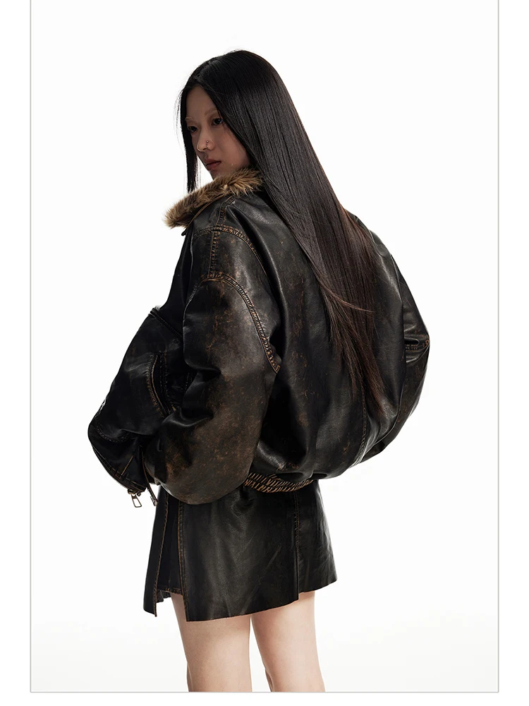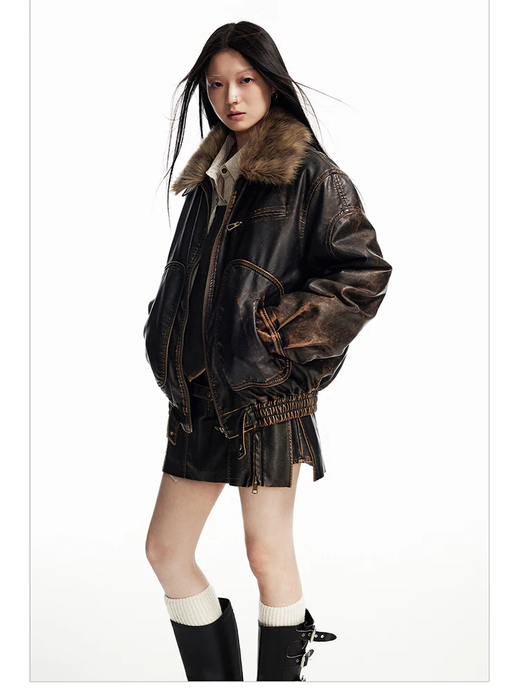 - > Lautaro primavera outono legal bonito vintage angustiado marrom jaqueta de couro do plutônio feminino gola de pele do falso roupas de grife de luxo