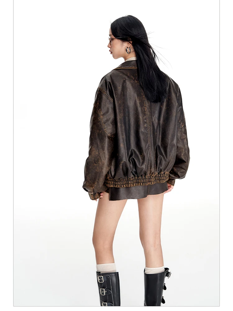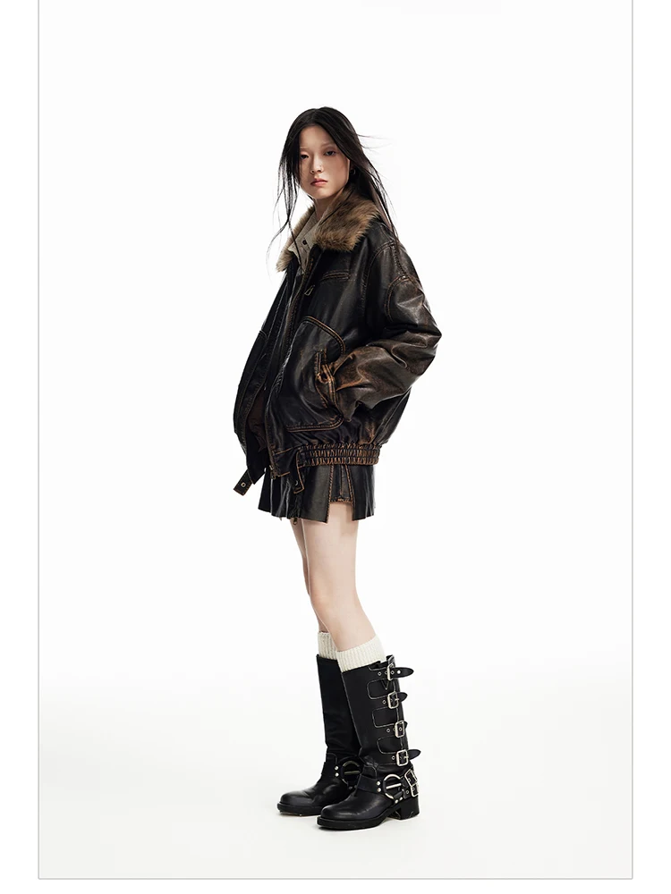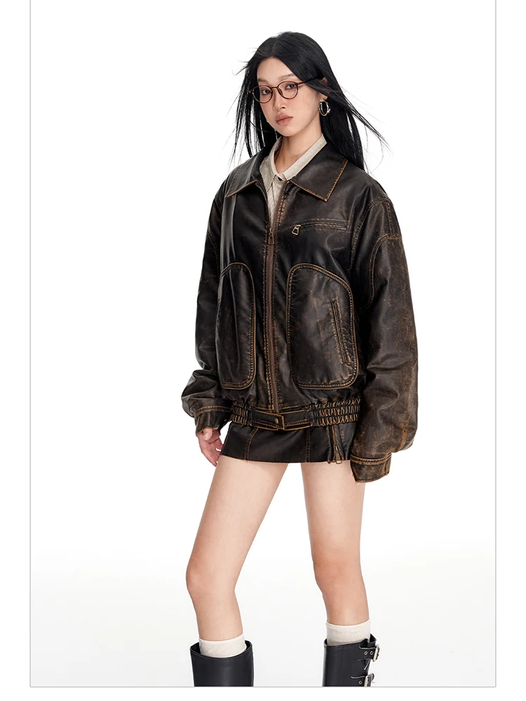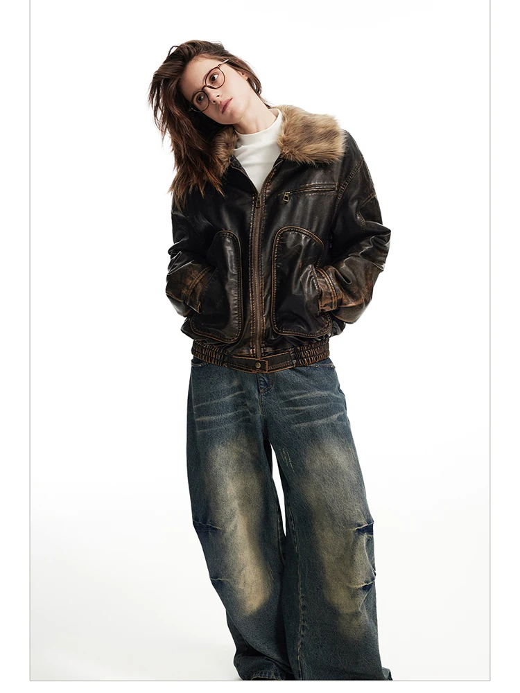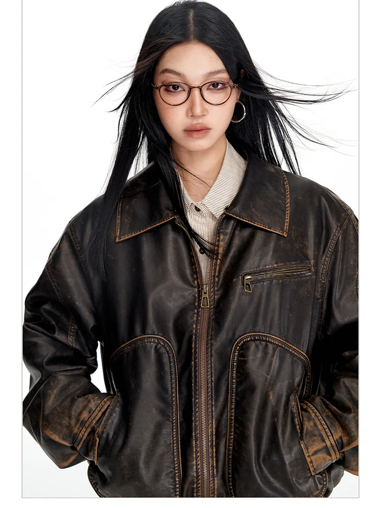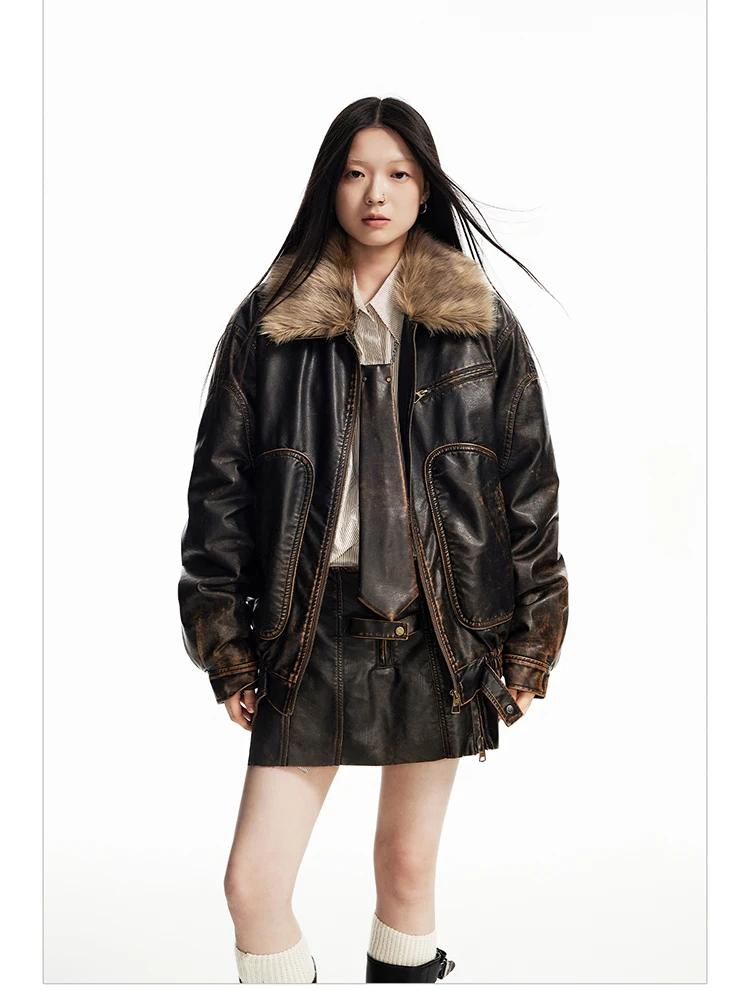 - > Lautaro primavera outono legal bonito vintage angustiado marrom jaqueta de couro do plutônio feminino gola de pele do falso roupas de grife de luxo
