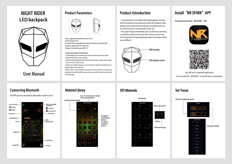【Como usar】Pesquise seu celular ou escaneie diretamente o código para baixar o aplicativo, conecte a fonte de alimentação móvel através da porta de dados USB integrada na parte traseira, ligue o Bluetooth e escaneie o código QR para conectar a mochila.Você pode conectar o dispositivo e usá-lo.