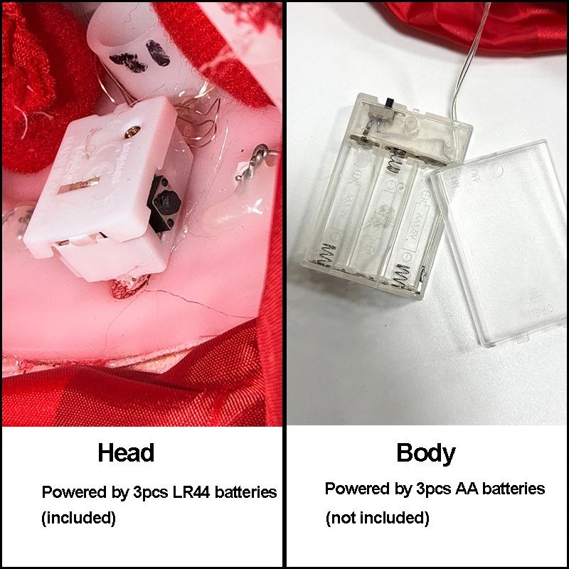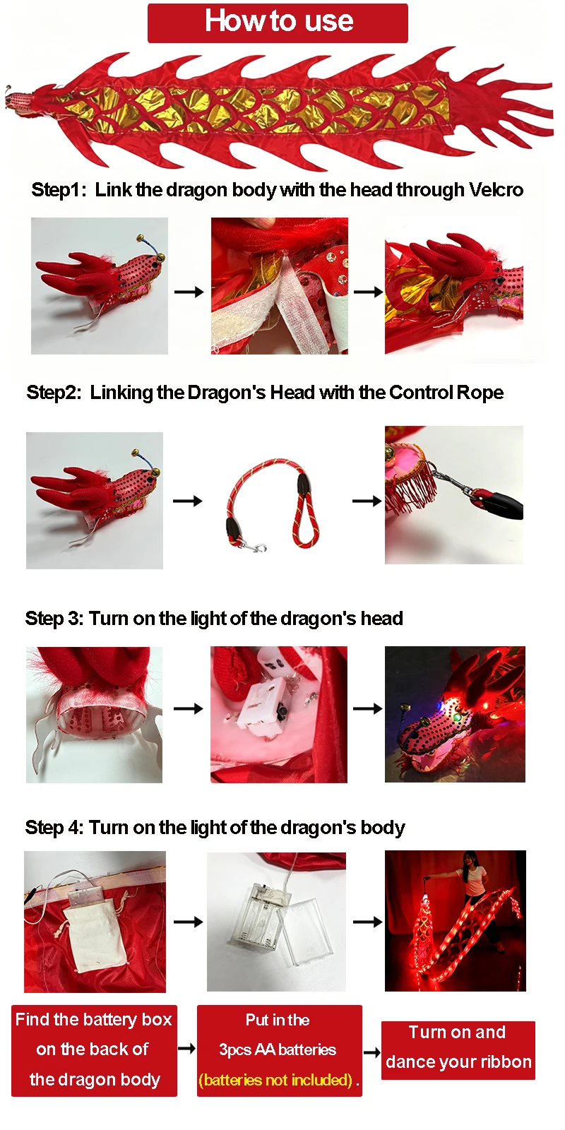 Alimentado por: baterias LR44 de duas seções Dragon Head (incluídas), corpo do dragão: 3 baterias AA (pilhas não incluídas).