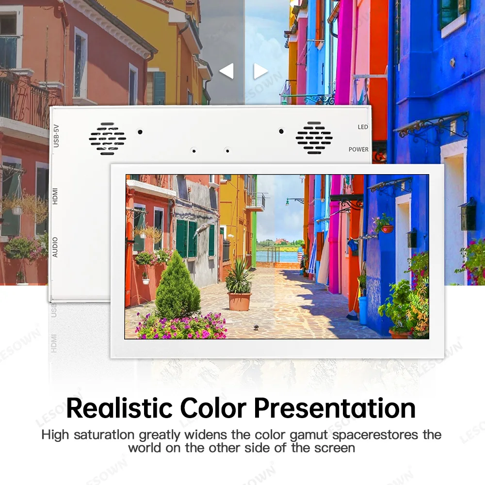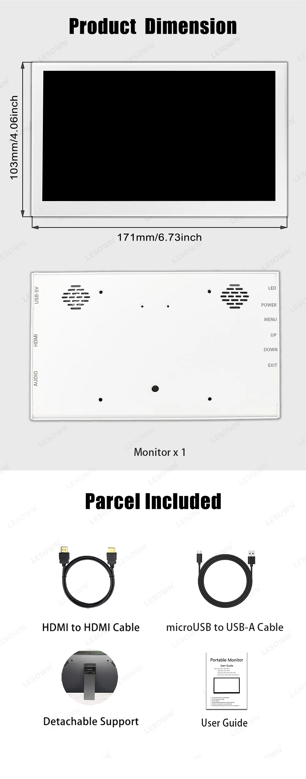 LESOWN-Mini monitor LCD touchscreen branco, display portátil com alto-falantes, IPS, minúsculo, pequeno, 7 Polegada, 1024x600, FHD, PC, laptop