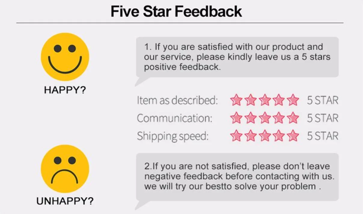 Se você está satisfeito com nossos produtos e serviços, por favor deixe o seu feedback positivo e 5 estrelas, este será o maior apoio para nós; Se você não satisfez nossos porducts, pls entre em contato conosco antes de deixar neutro (3 estrelas) ou negativo (1-2 estrelas) Feedback. Nós garantimos que vamos 100% love quaisquer problemas para você. Entre em contato conosco antes de deixar o feedback negativo ou abrir qualquer disputa no site. A comunicação é a melhor maneira de resolver os problemas.