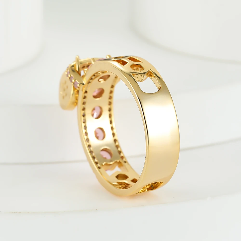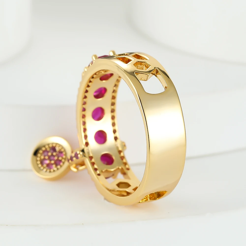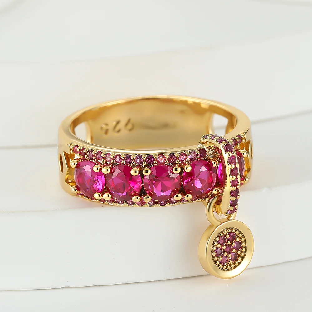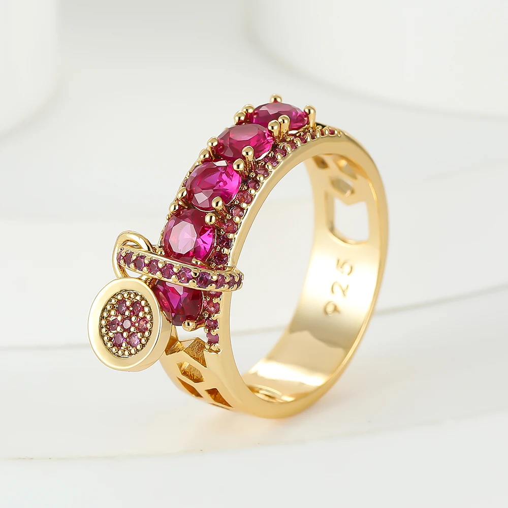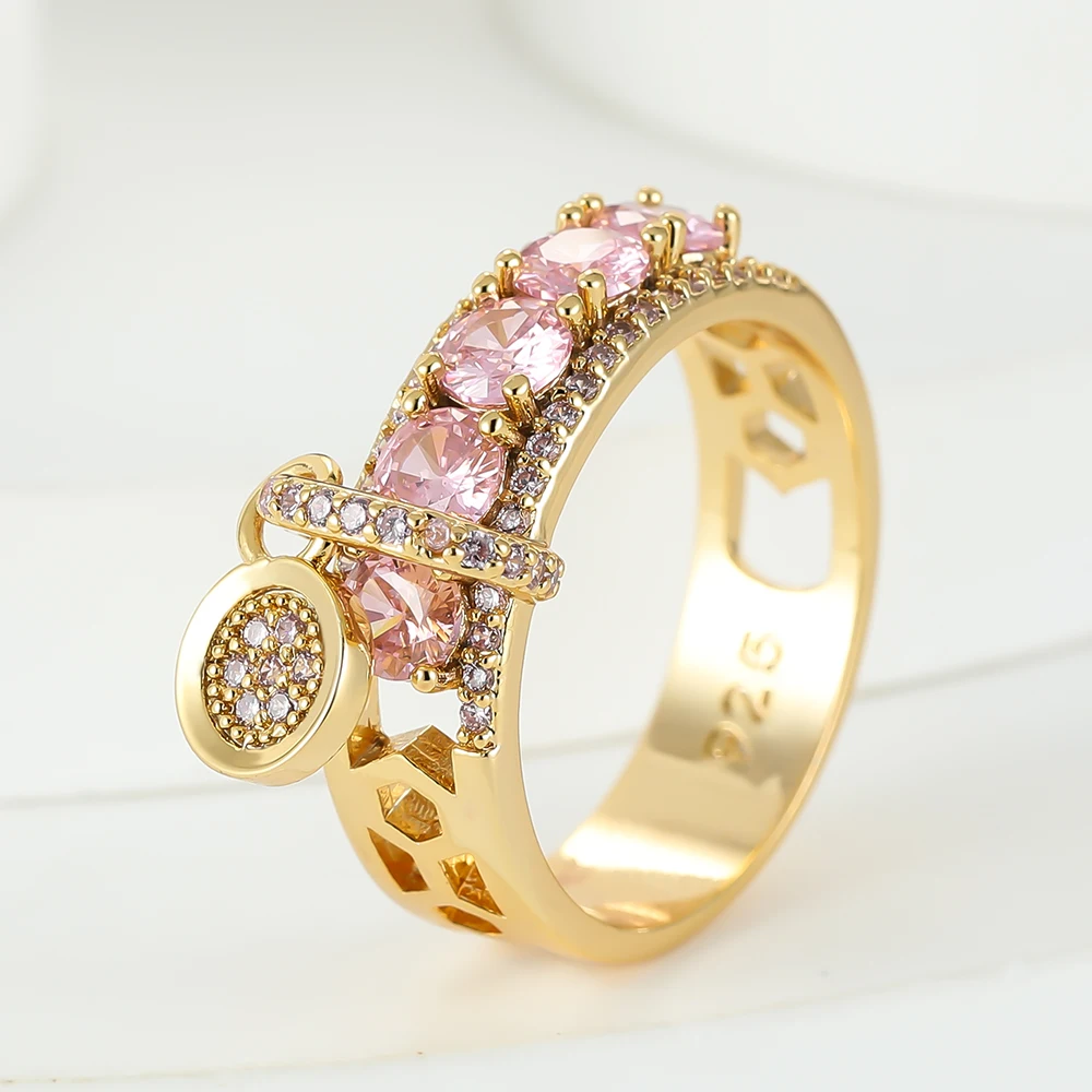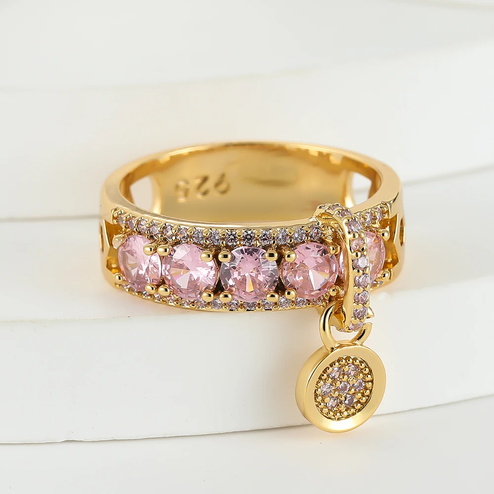 - > Luxo feminino rosa pedra vermelha anéis de casamento para mulheres jóias de noivado bonito rosa zircão redondo balançar anel presentes do dia de natal