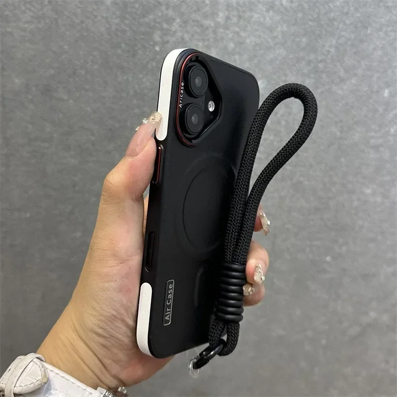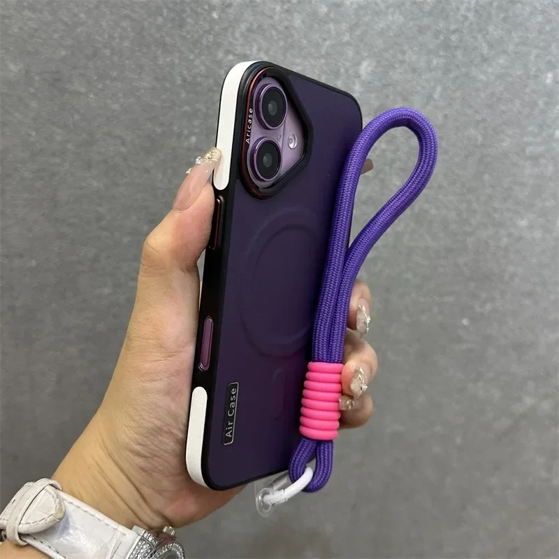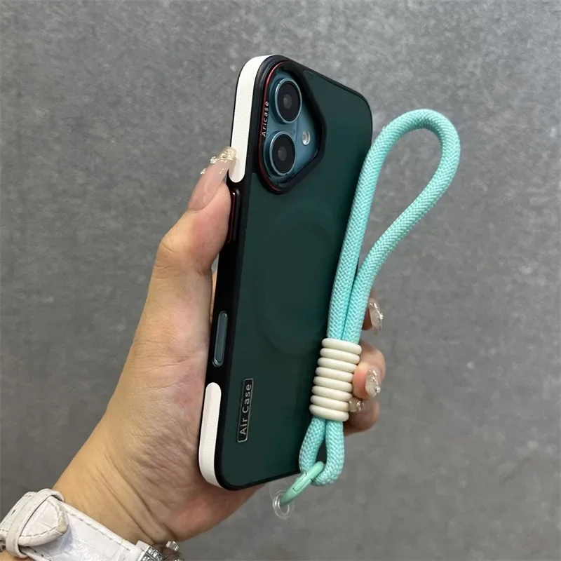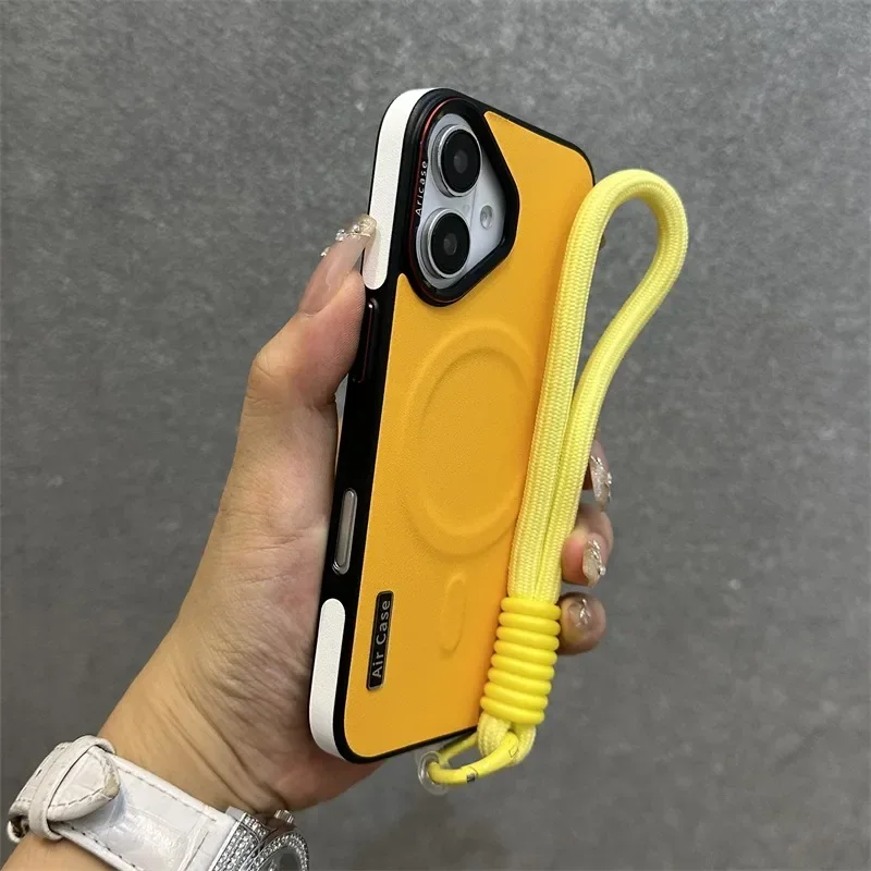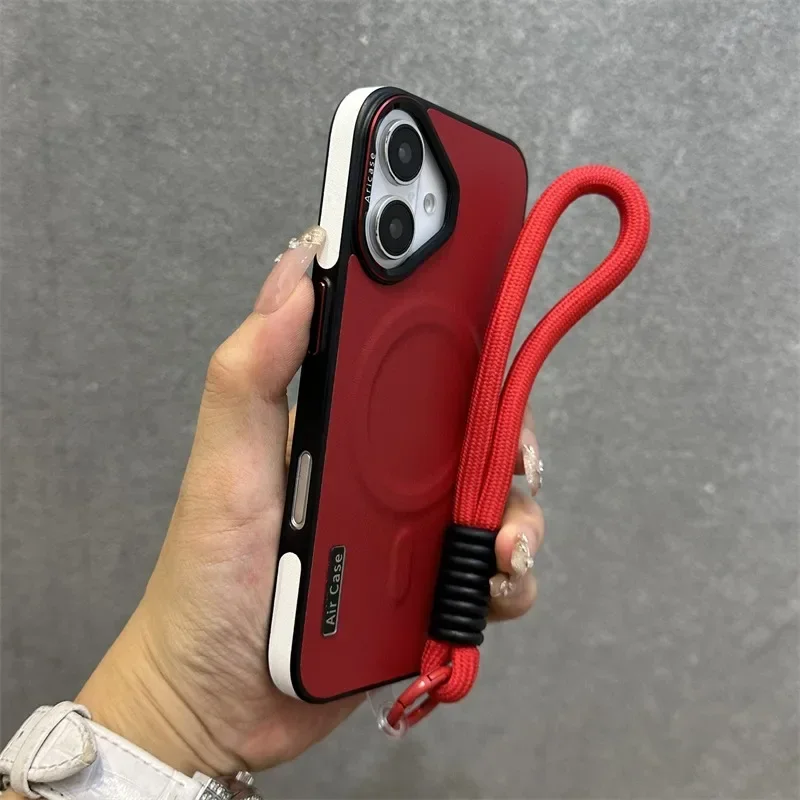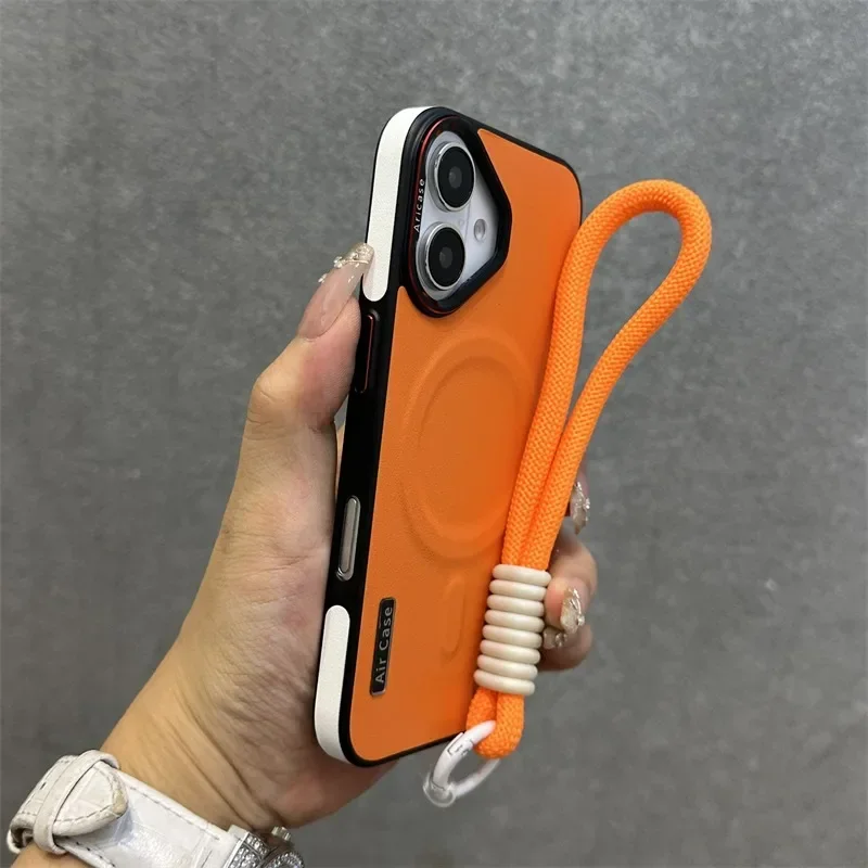 - > Luxo fosco couro magsafe caso para iphone 16 15 14 13 12 pro max carregador sem fio dupla cor pulseira de pulso capa macia