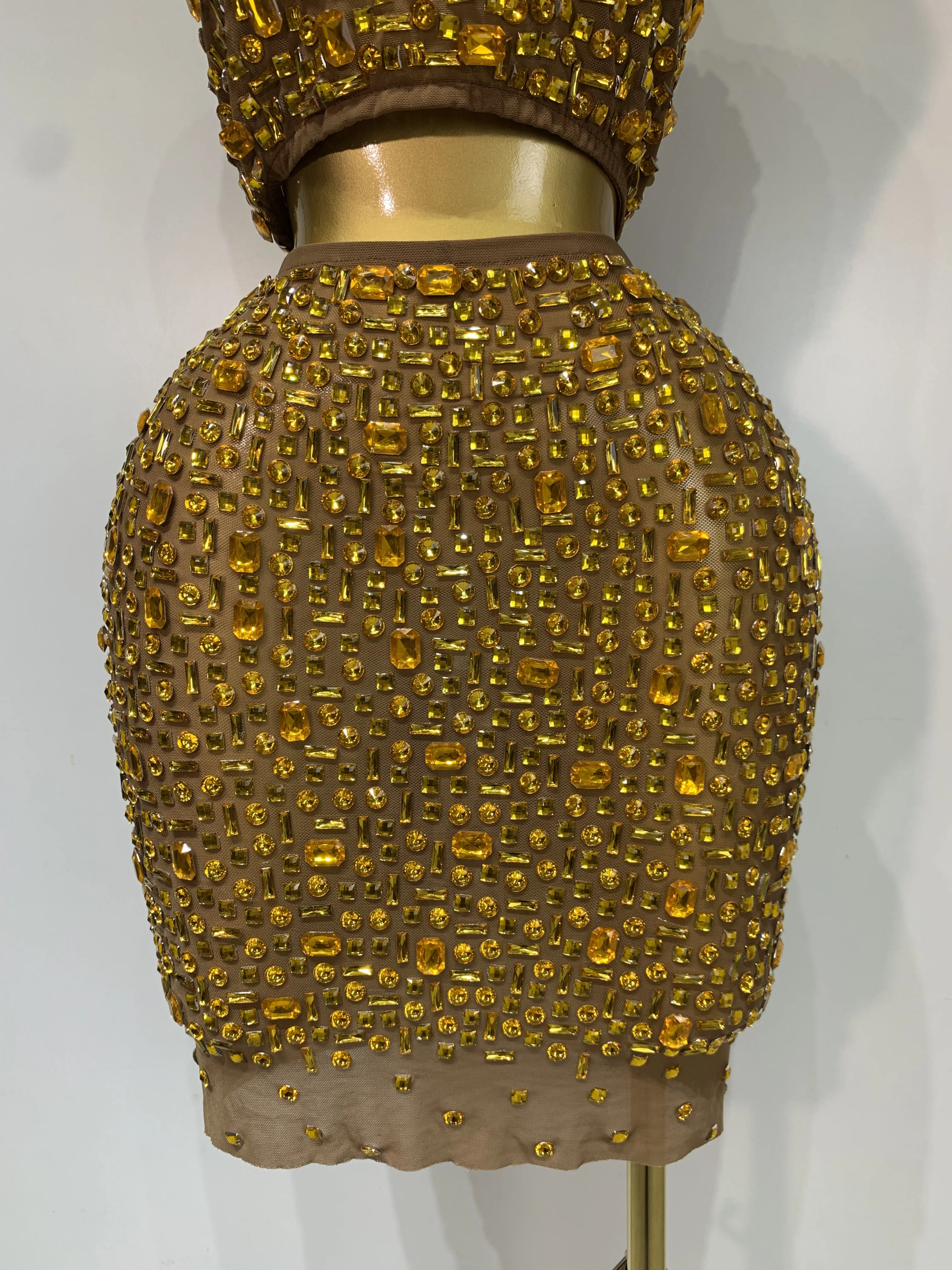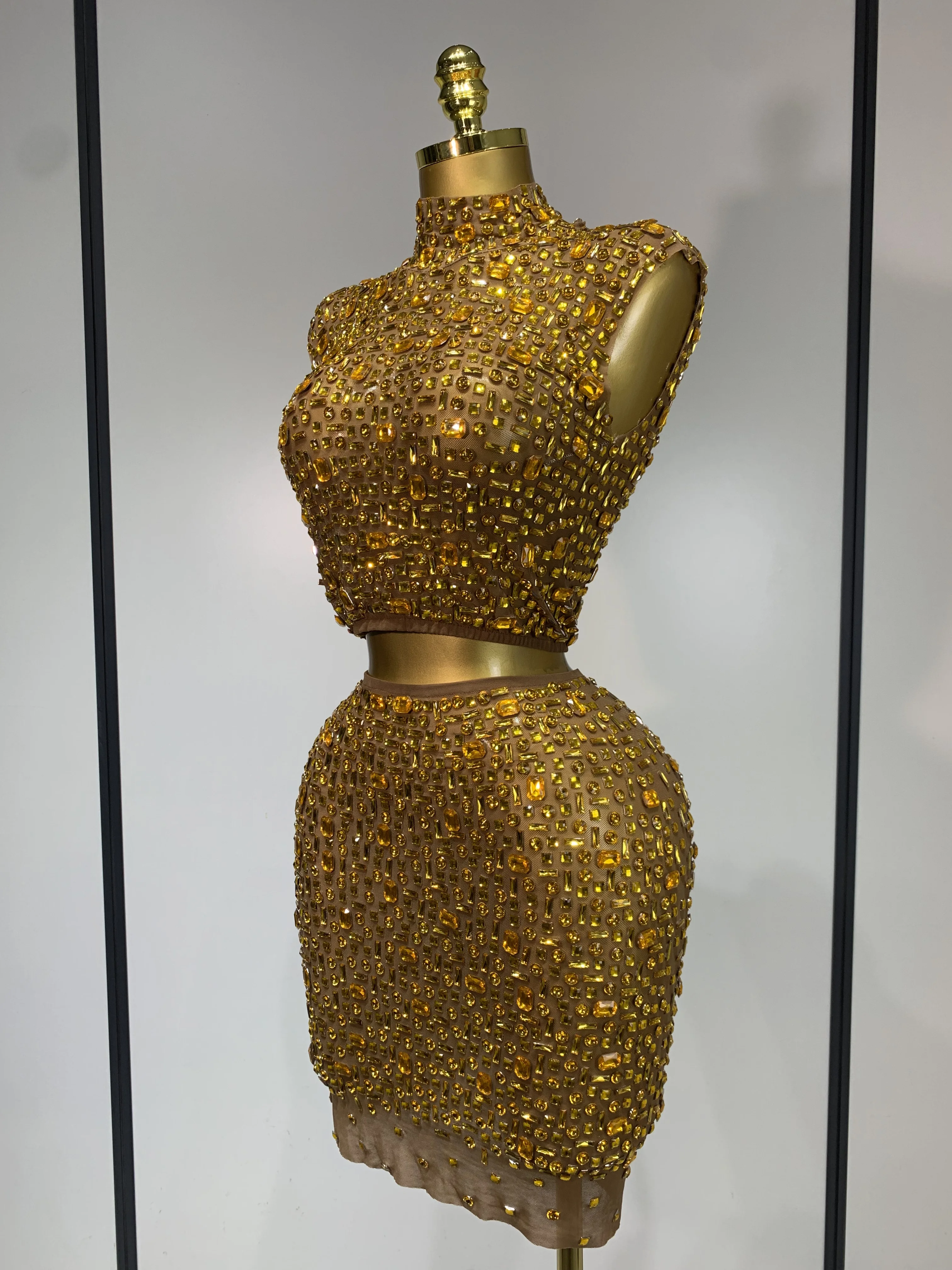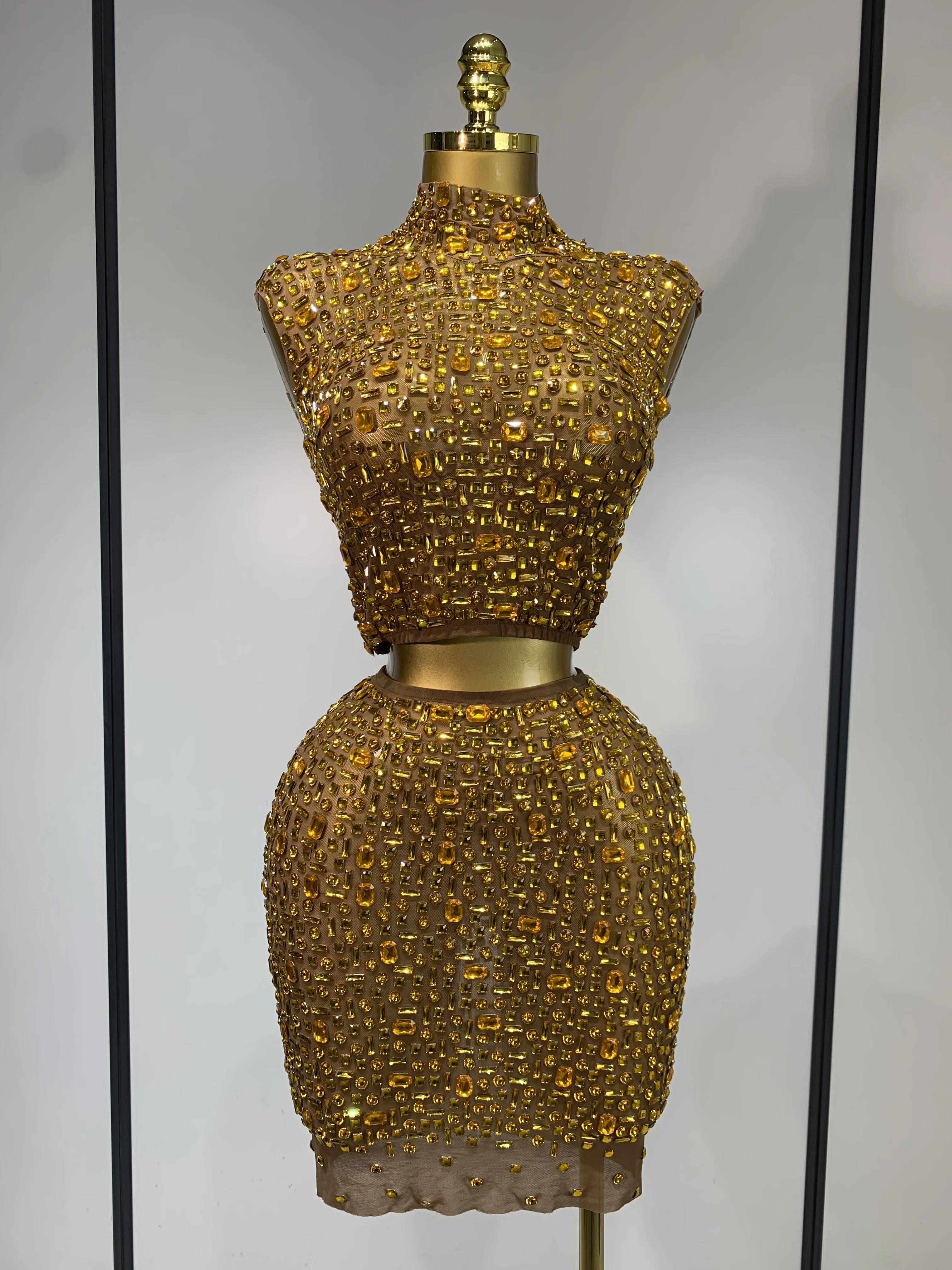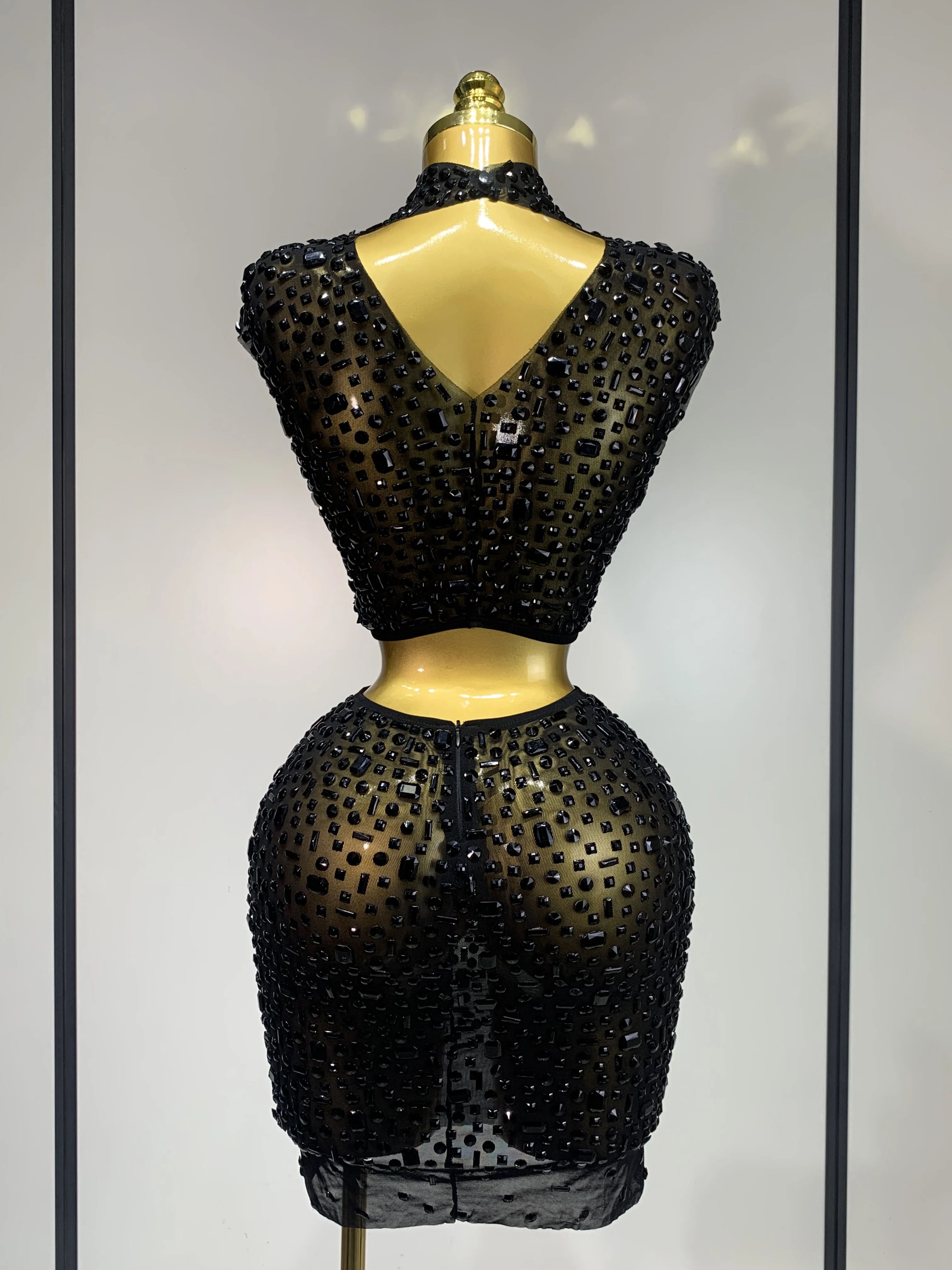 Luxo strass malha ver através celebrar aniversário vestido brilhante superior saia curta duas peças define desempenho traje de palco