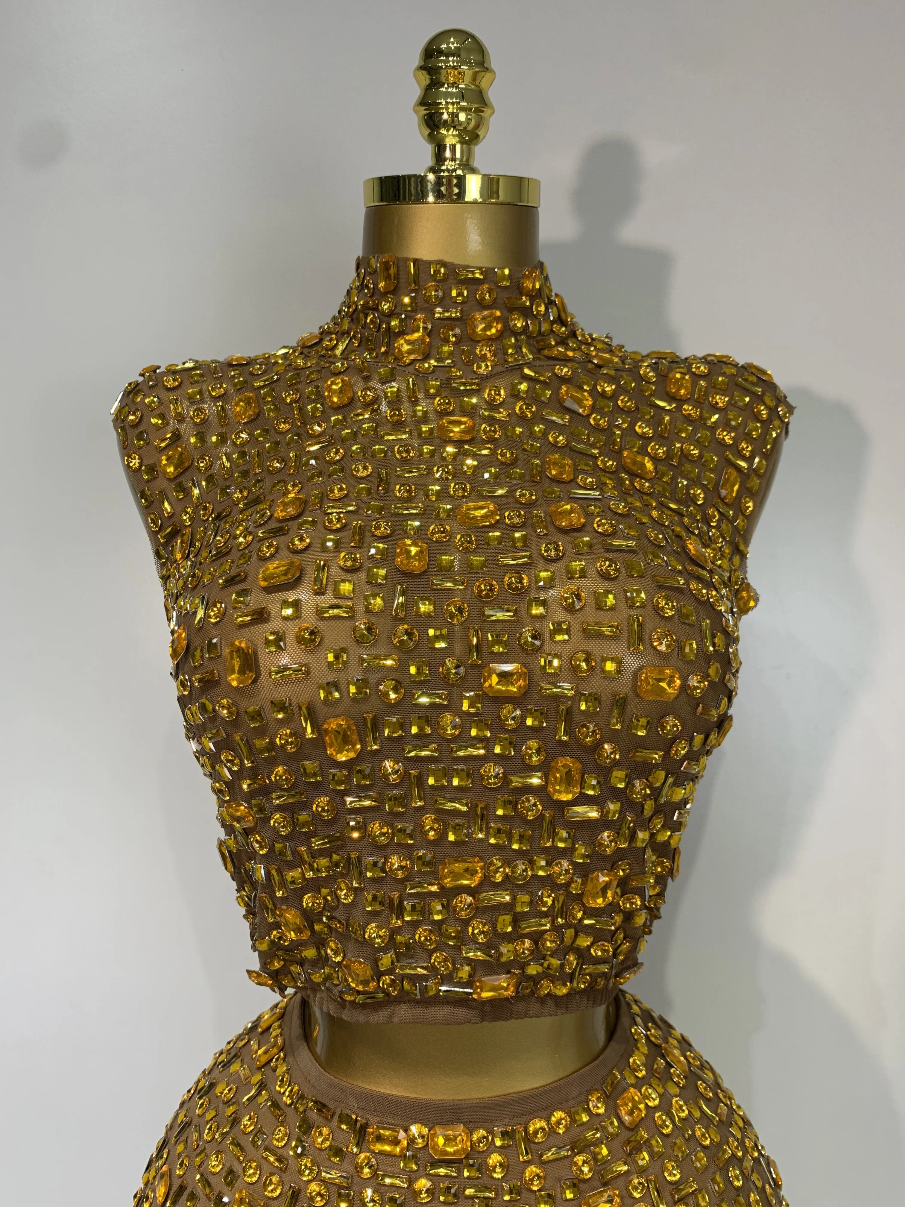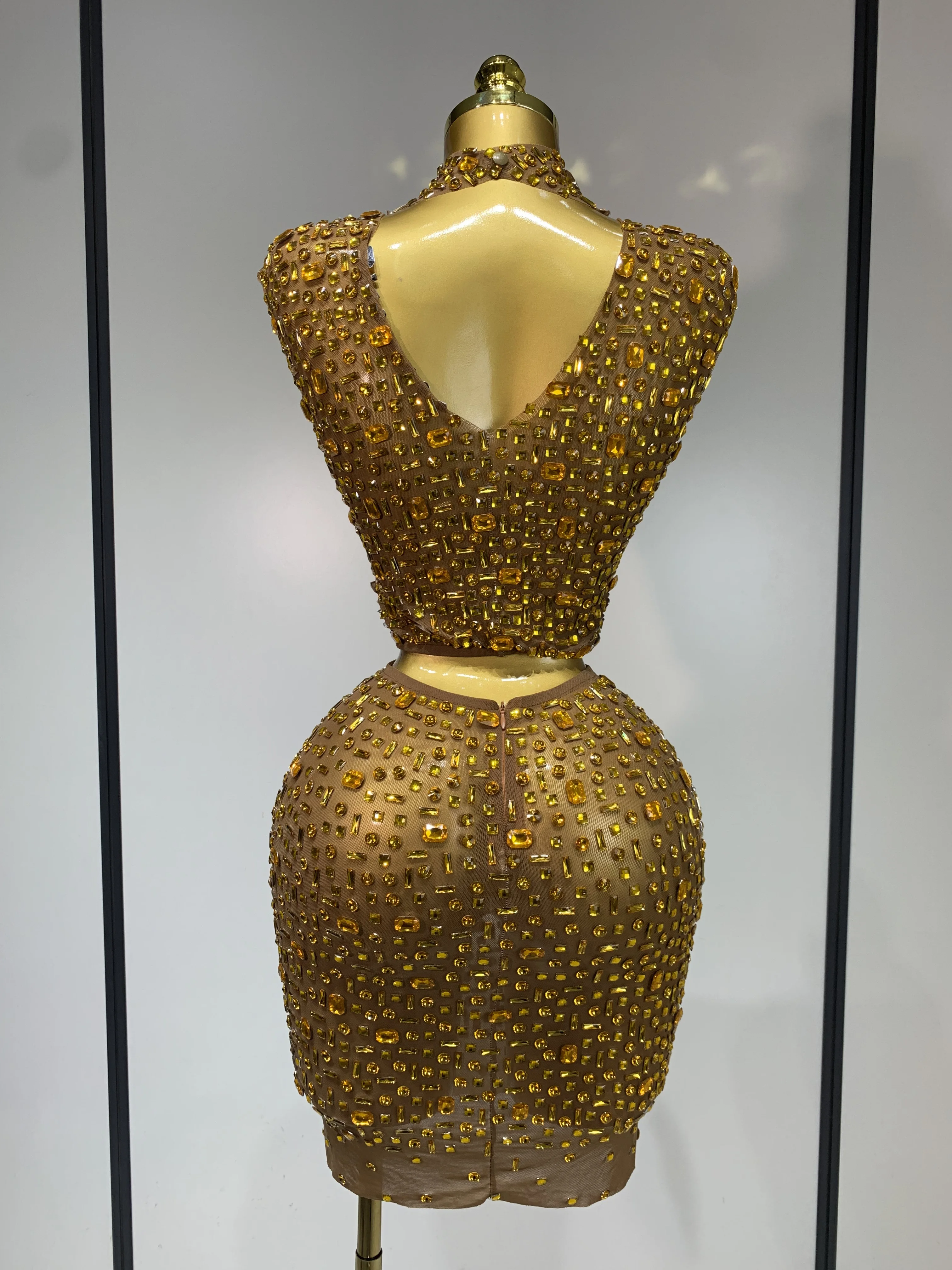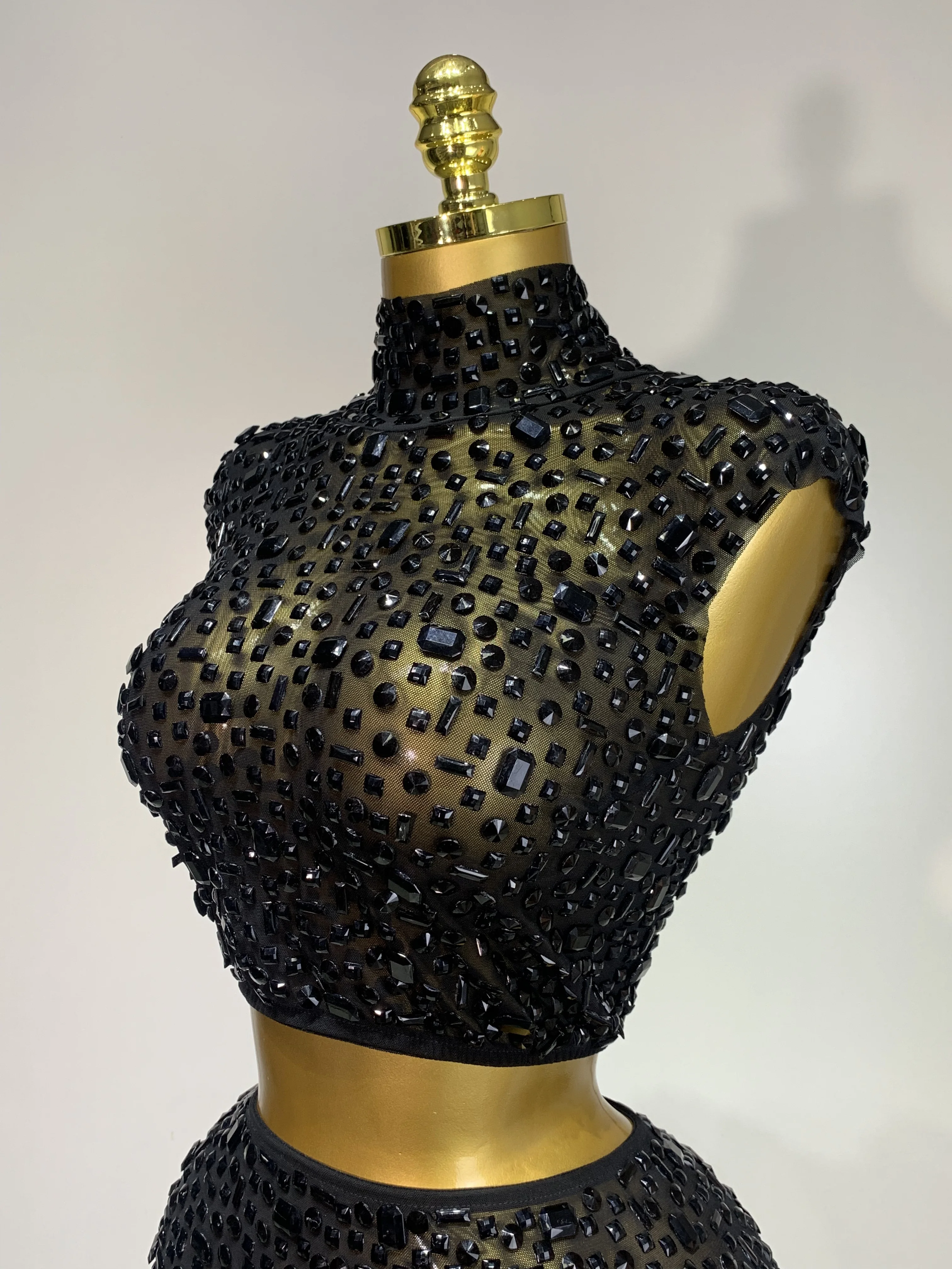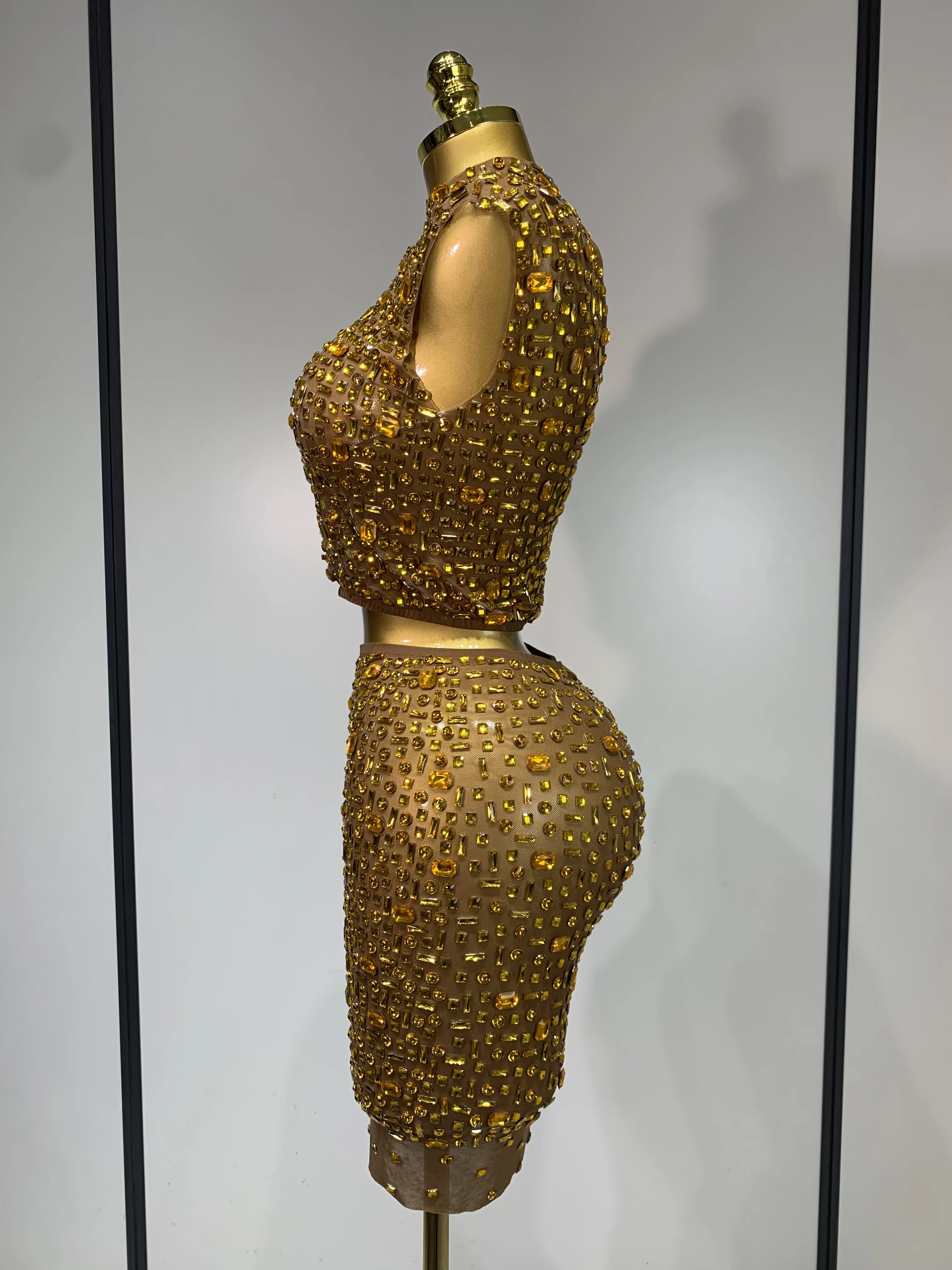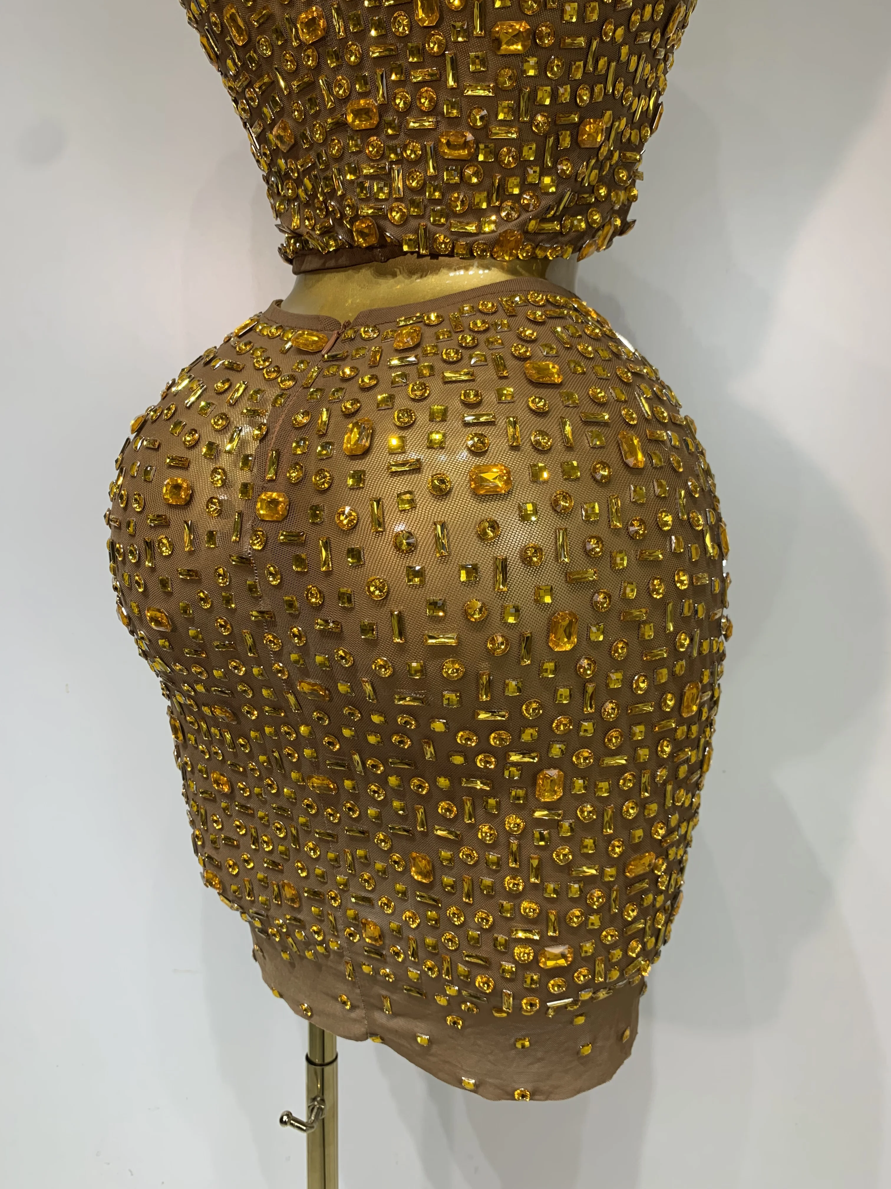Luxo strass malha ver através celebrar aniversário vestido brilhante superior saia curta duas peças define desempenho traje de palco