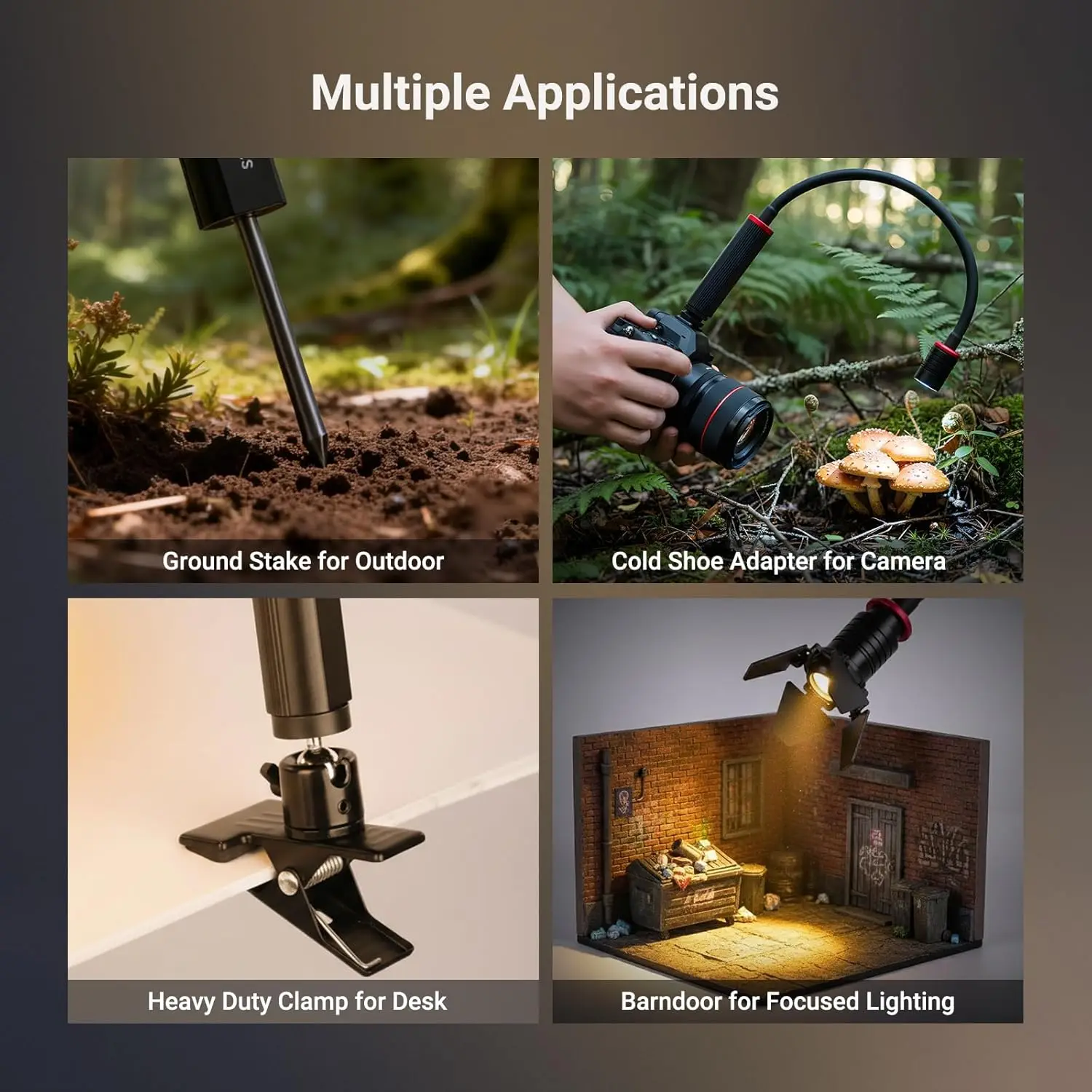 【Métodos de Montagem Versáteis】Tubo macio flexível, porém robusto, de 38 cm suporta 360° Ajuste de ângulo.Ele pode ser conectado a uma câmera por meio do adaptador de sapata fria ou a uma mesa por meio do super clamp.A ponta rosqueada de 1/4" pode estabilizar em qualquer terreno, e a classificação IP54 permite o uso seguro ao ar livre.