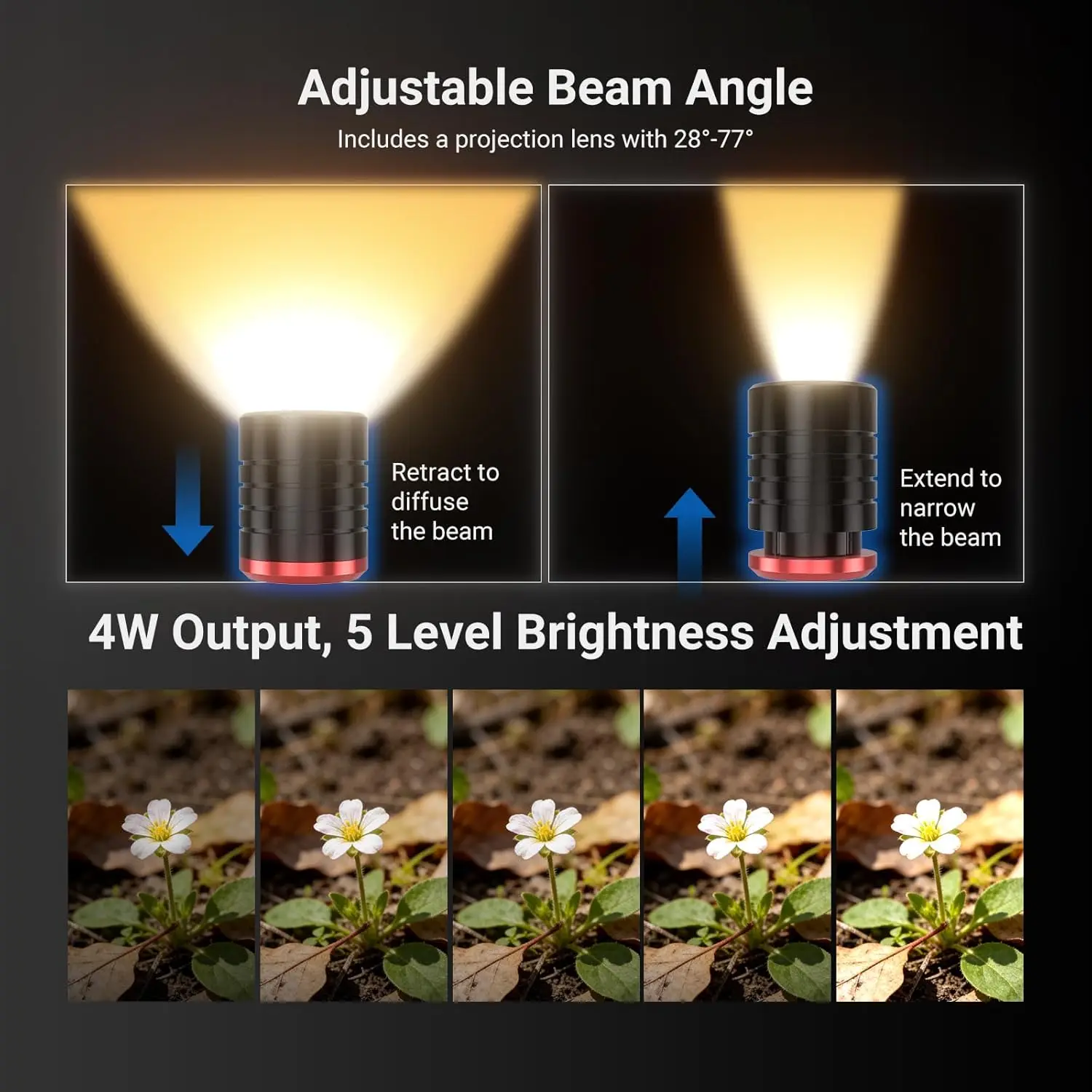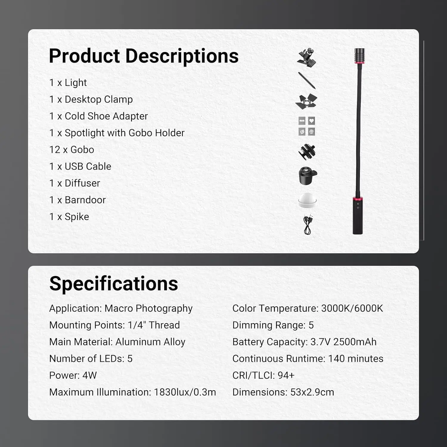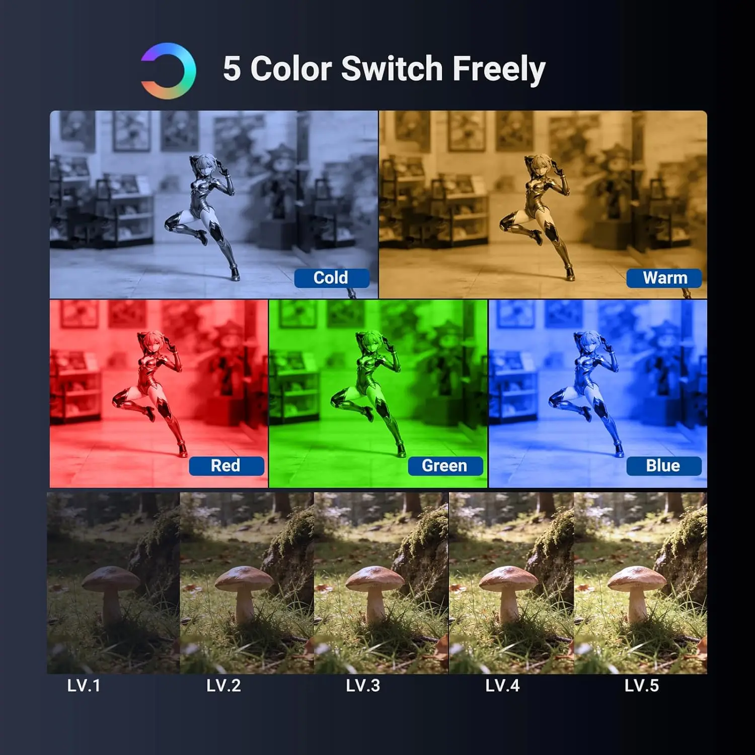 【Iluminação para fotografia macro】Esta iluminação contínua LED de 4W é essencial para criadores de conteúdo e influenciadores para fotografia macro.Possui CRI 95, TLCI 94, iluminância máxima de 1830lux/0,3m, 5 cores (vermelho, verde, azul, branco quente 2700K, branco frio 5600K) e 5 níveis de brilho.