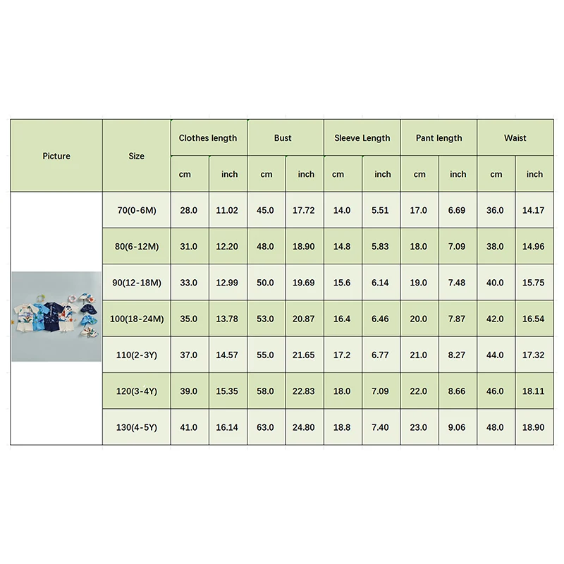 110 Comprimento da parte superior: 14,57 Busto: 21,65 Manga: 6,77 Comprimento da calça: 8,27 Cintura: 17,32 Idade recomendada: 2-3 anos