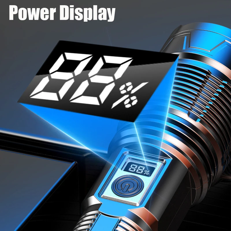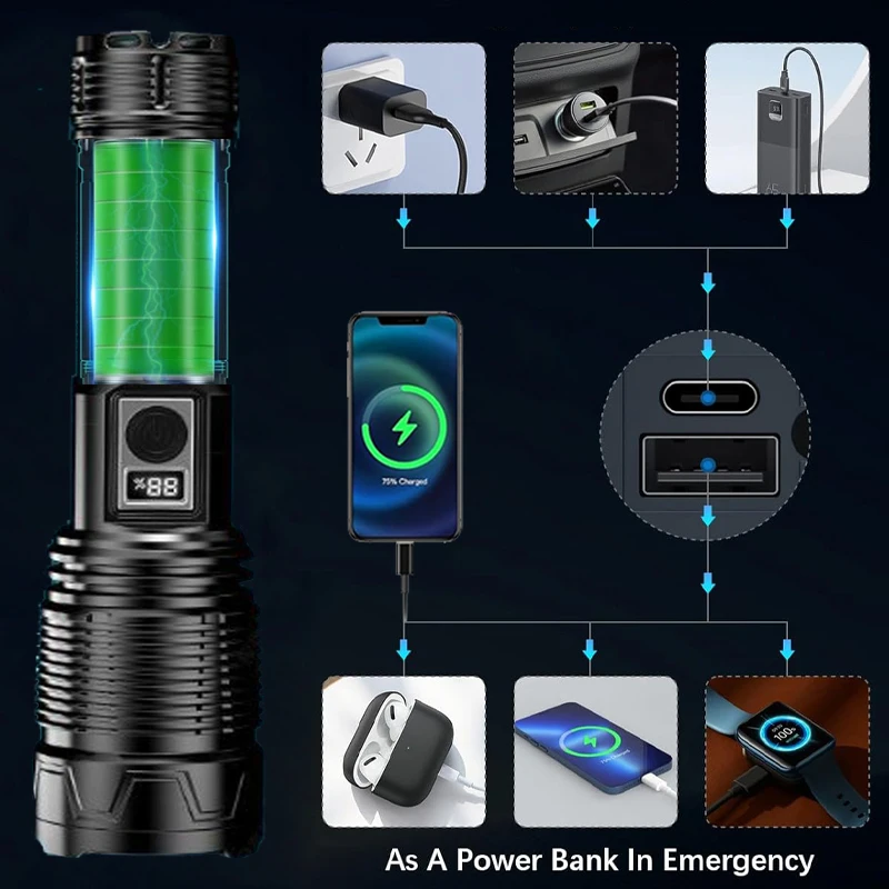 Mais poderosa lanterna led recarregável embutida 18650 bateria de longo alcance tático tocha luz para pesca caça