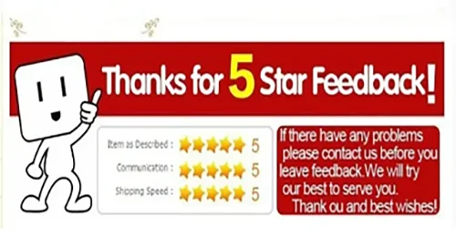 Agradeceremos se você nos deixar um feedback positivo Avaliações completas do vendedor de 5 estrelas. Se você estiver satisfeito com nossos produtos e serviços, deixe-nos uma classificação de cinco estrelas, porque feedback positivo e classificação de cinco estrelas são o que estamos buscando. Se você não estiver satisfeito com sua experiência de compra, entre em contato conosco antes de decidir deixar um feedback neutro ou negativo, faremos o nosso melhor para resolver o problema para você assim