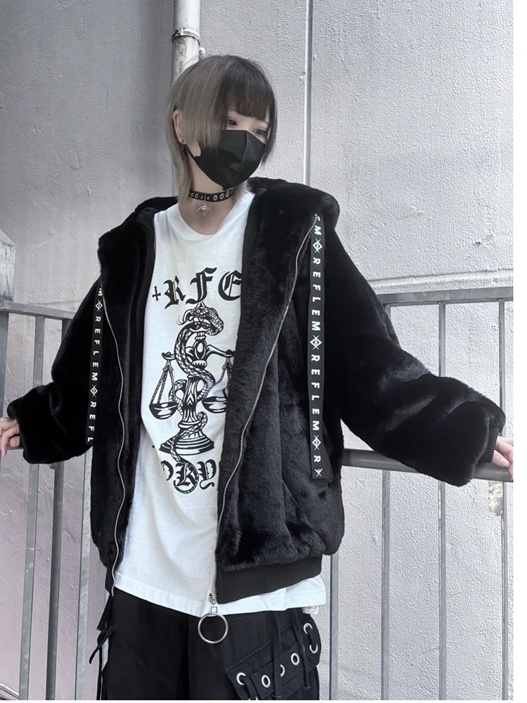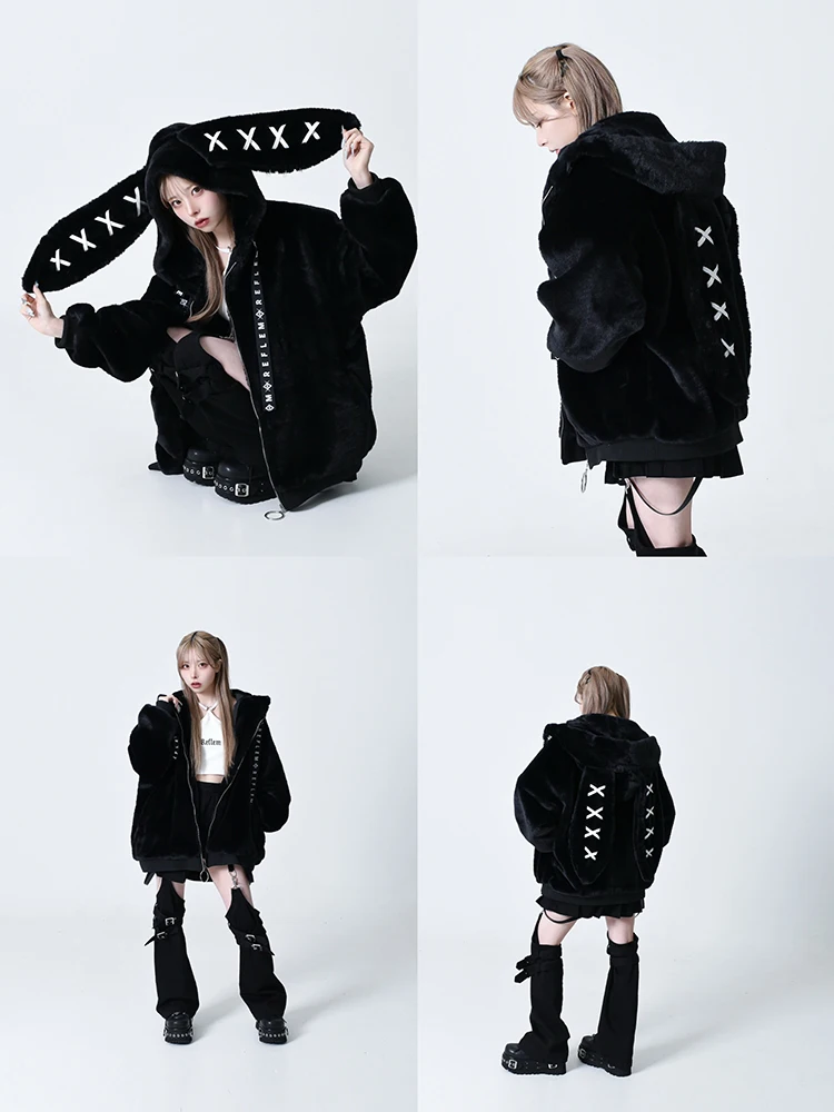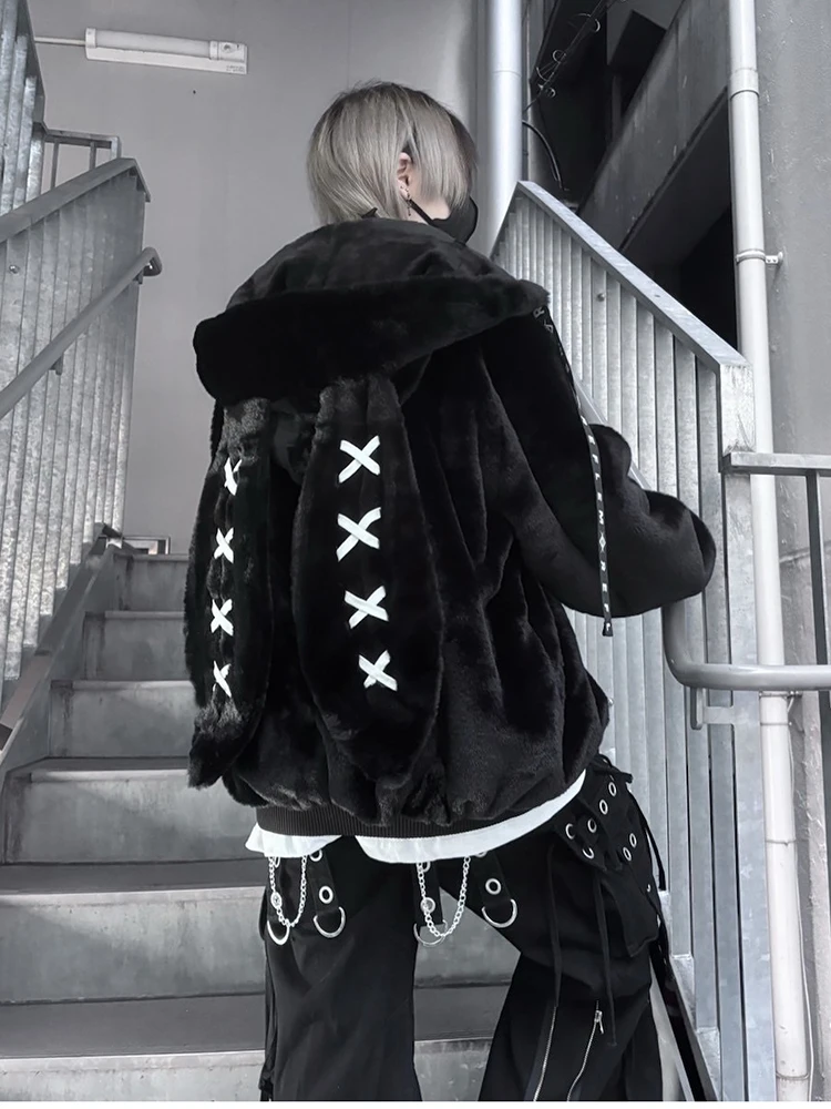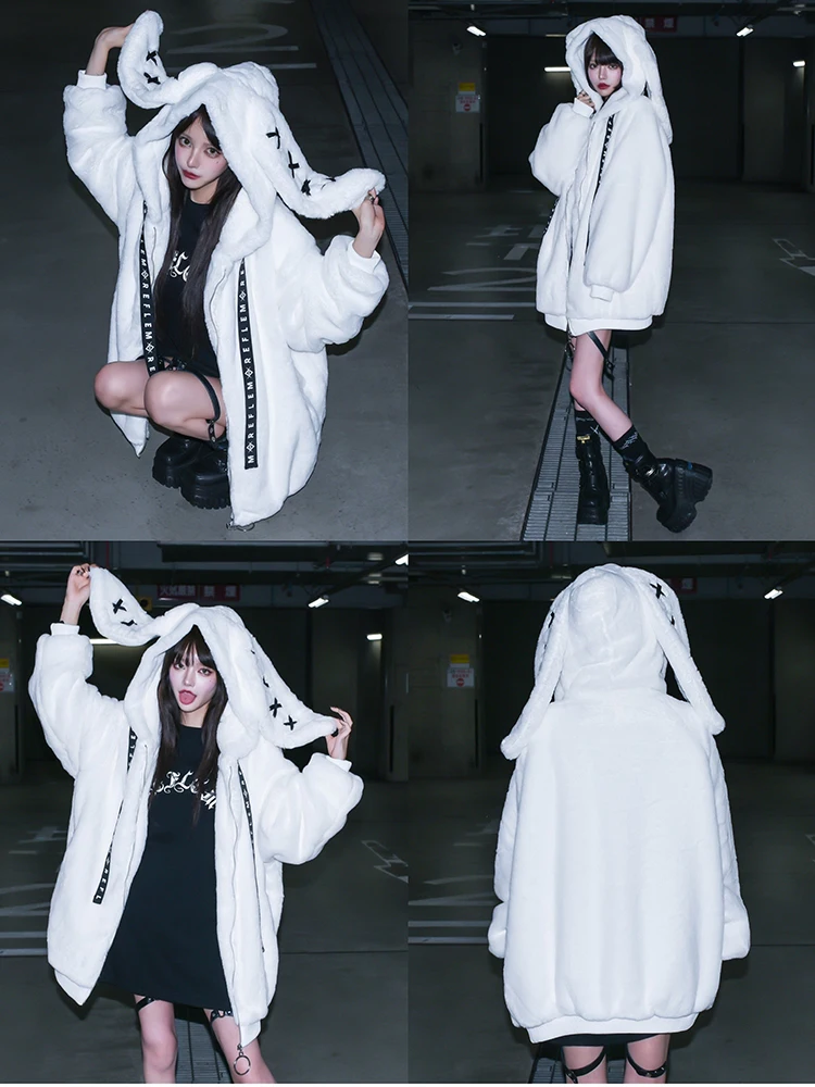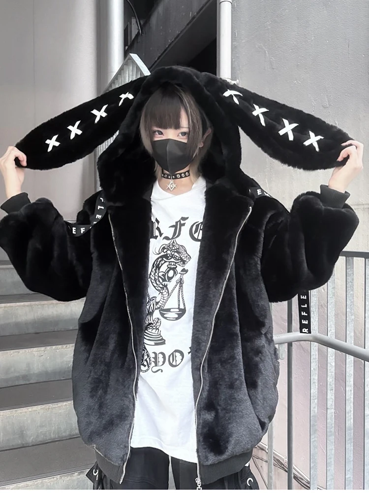 - > Mauroicardi outono inverno doce bonito kawaii macio grosso quente preto casaco de pele do falso feminino com orelhas de coelho bonito fofo jaqueta com capuz