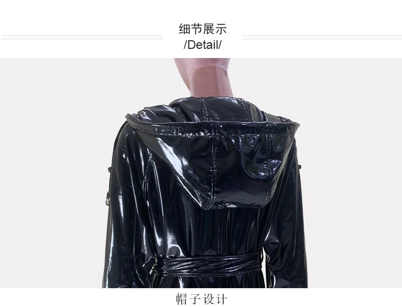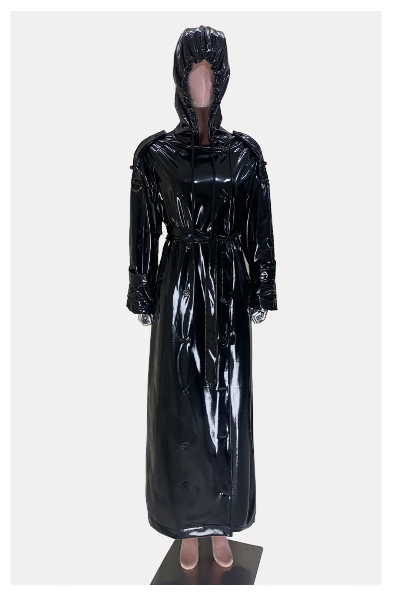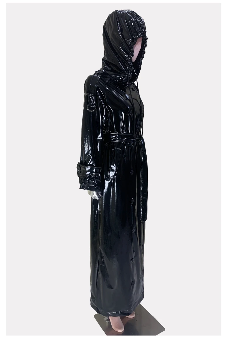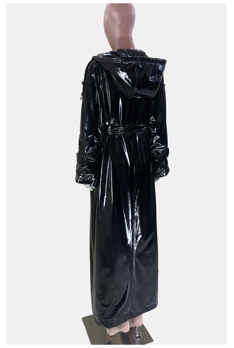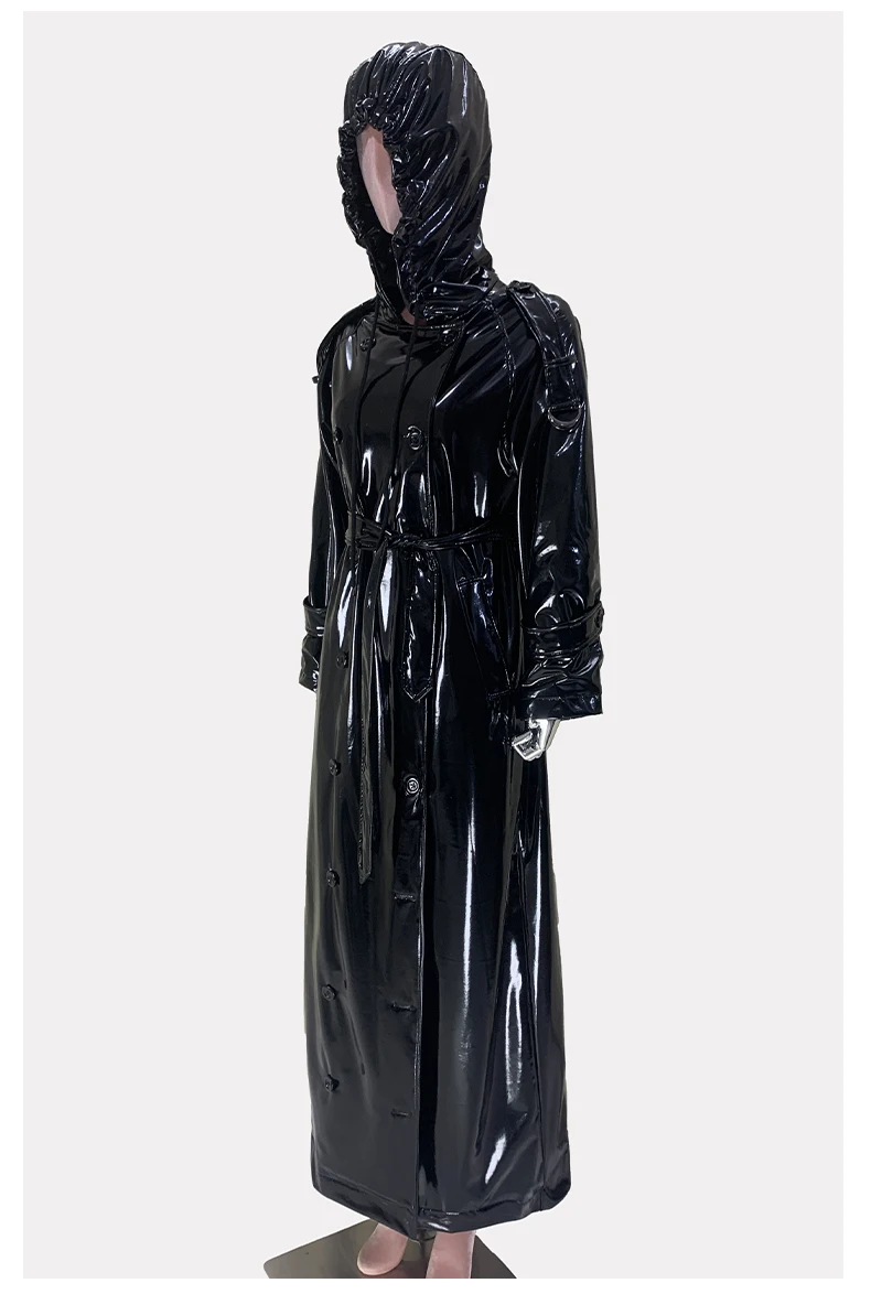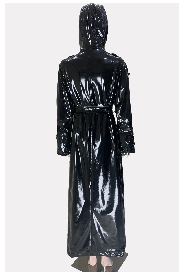 - > Mauroicardi primavera outono legal extra longo brilhante reflexivo impermeável fino preto macio patente casaco de couro falso feminino com capuz
