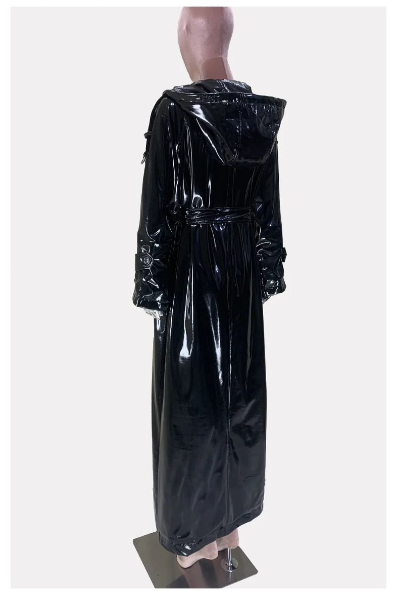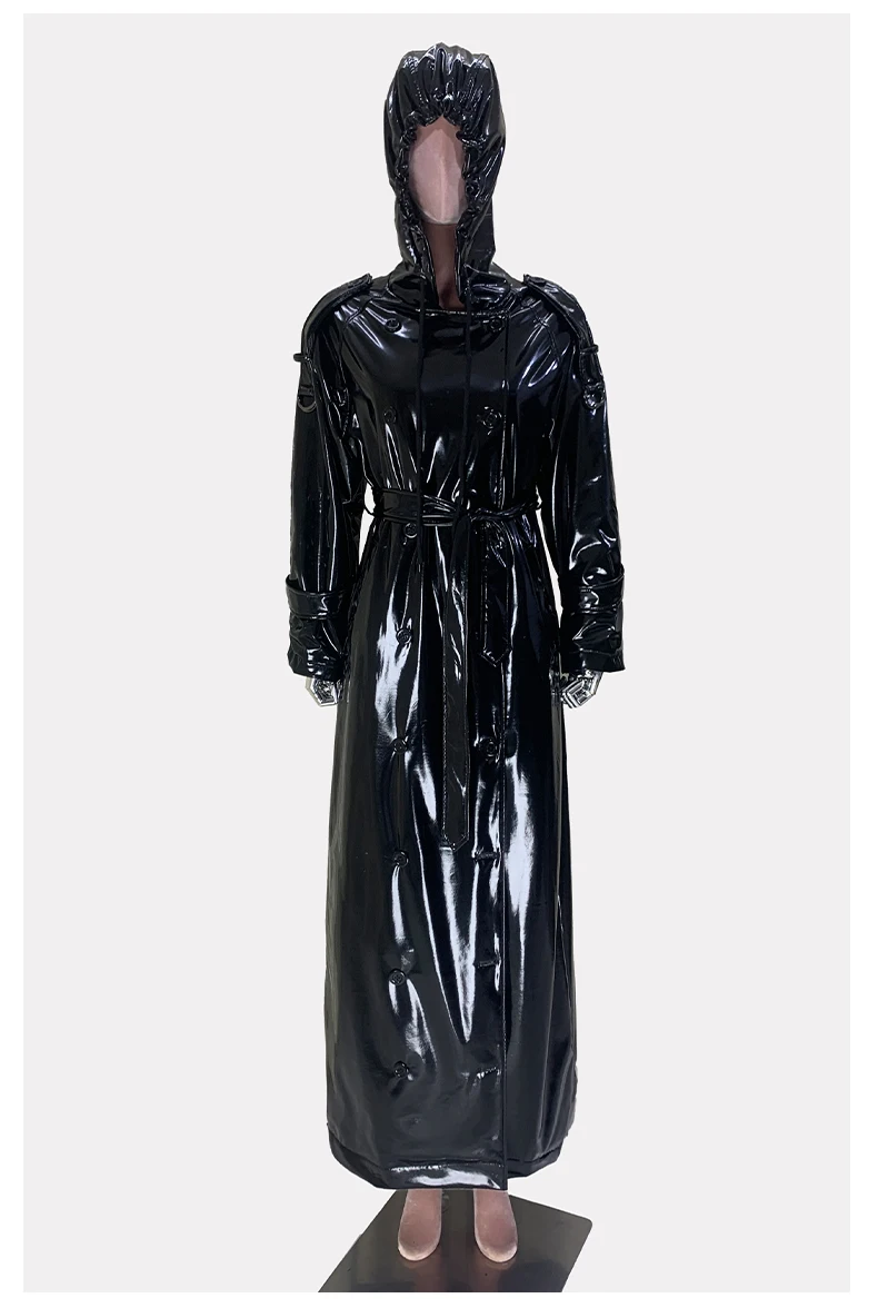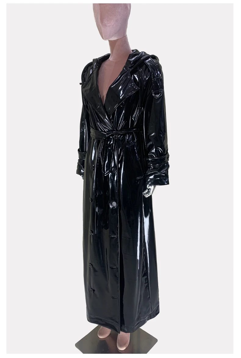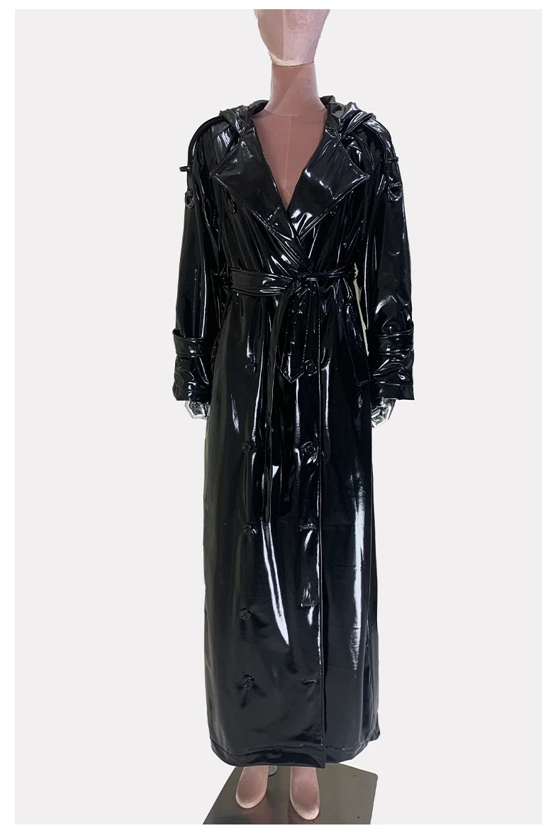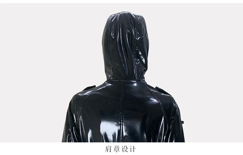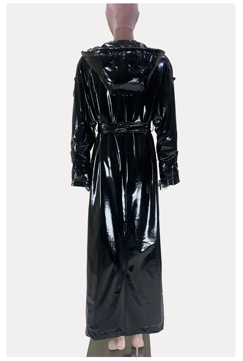 - > Mauroicardi primavera outono legal extra longo brilhante reflexivo impermeável fino preto macio patente casaco de couro falso feminino com capuz