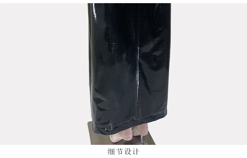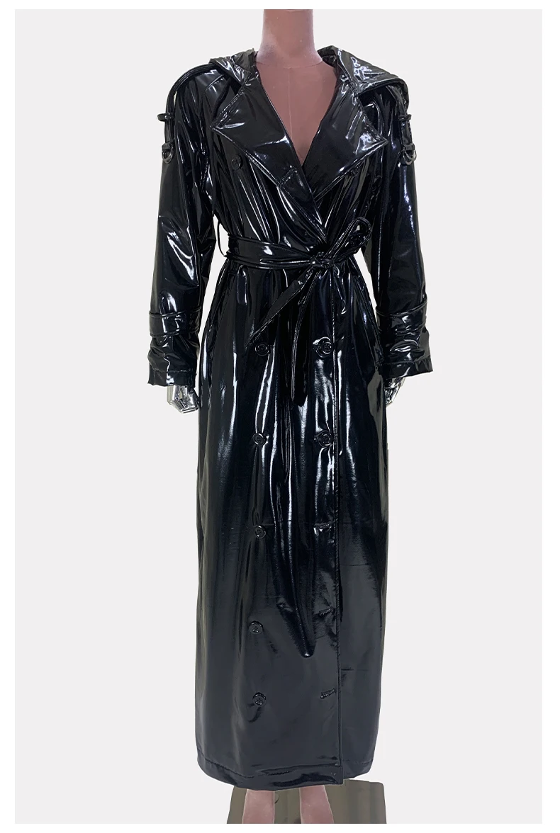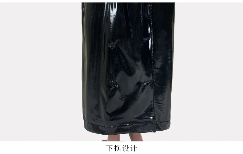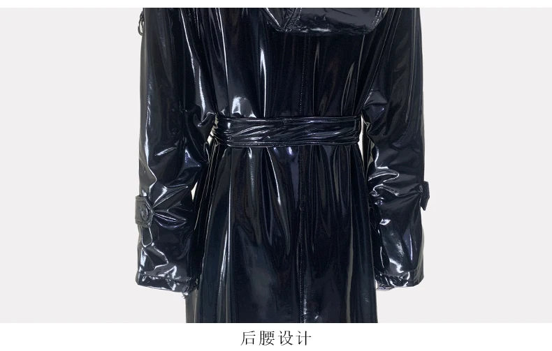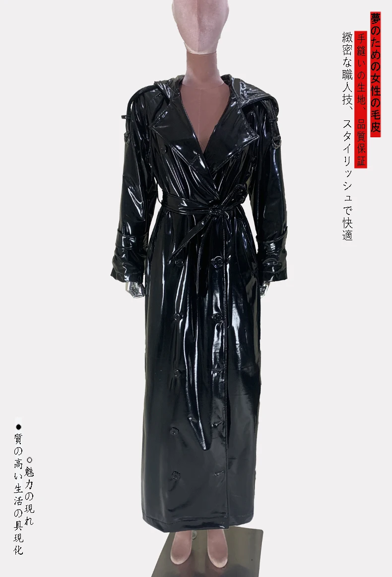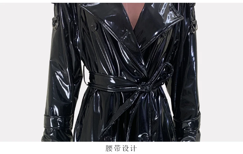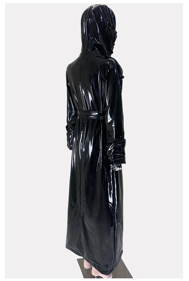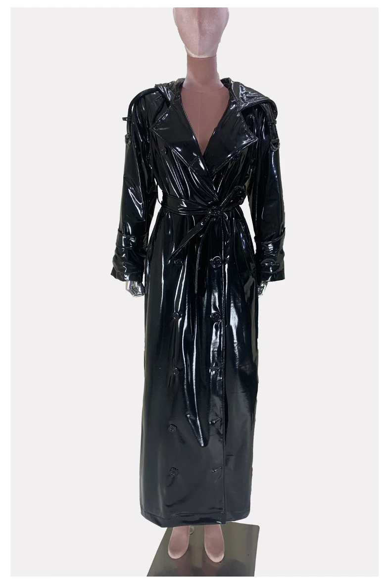 - > Mauroicardi primavera outono legal extra longo brilhante reflexivo impermeável fino preto macio patente casaco de couro falso feminino com capuz