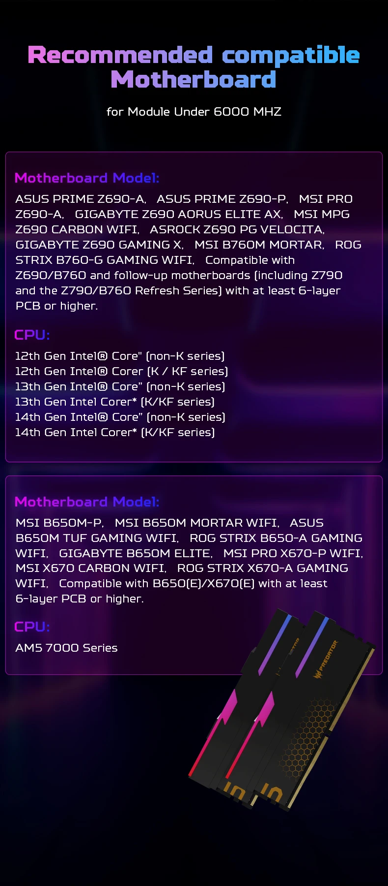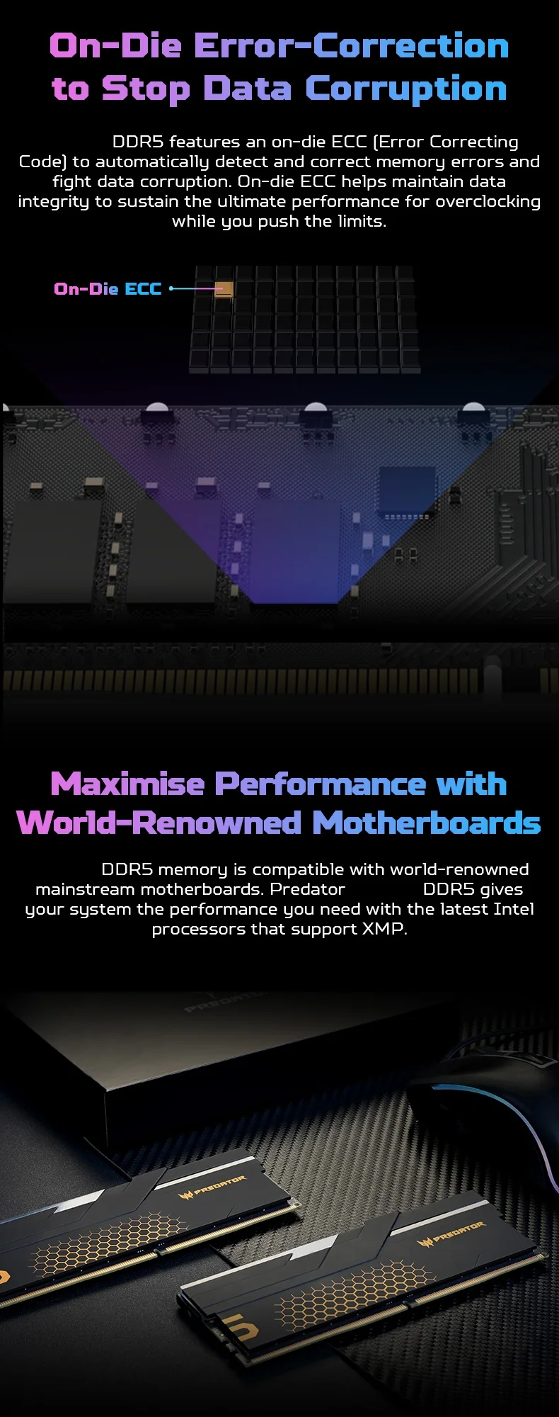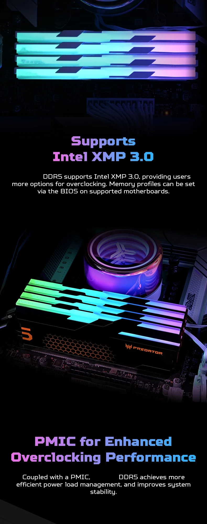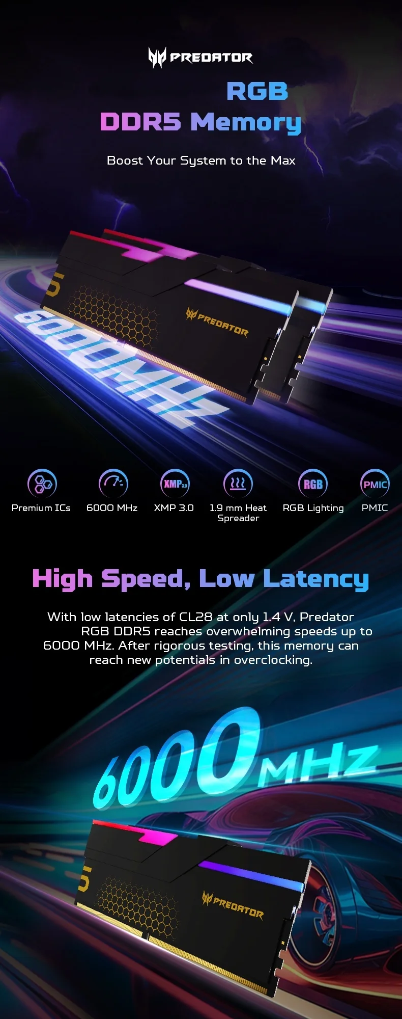 - > Memória RAM ACER PREDATOR RGB DDR5 48GB (2x24GB) 6000MHz, CL28, memória de computador para jogos compatível com XMP 3.0/AMD EXPO