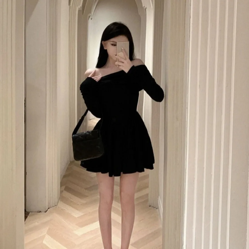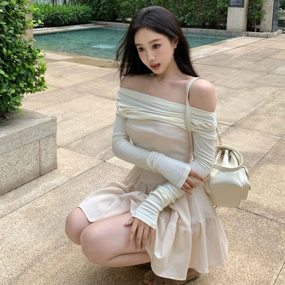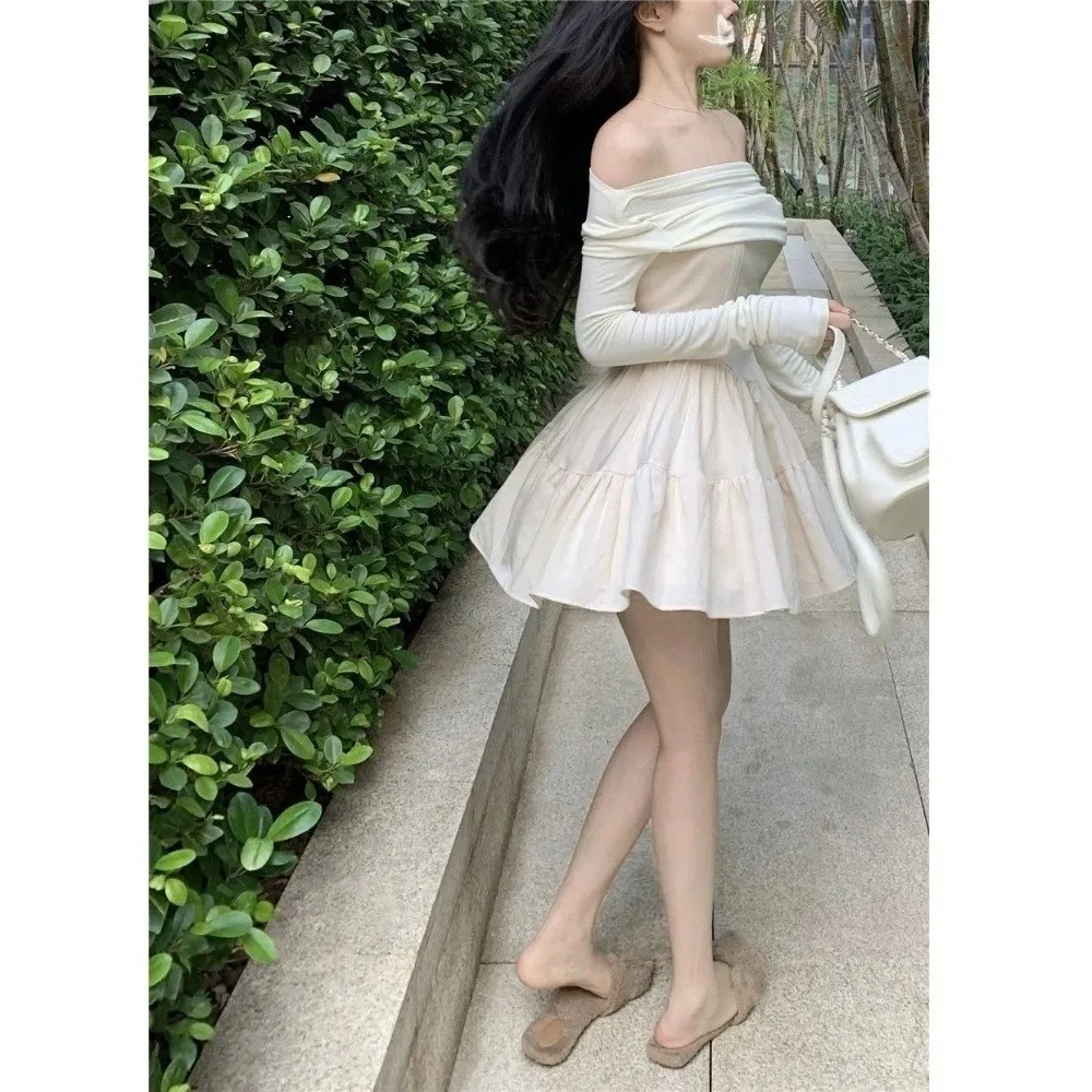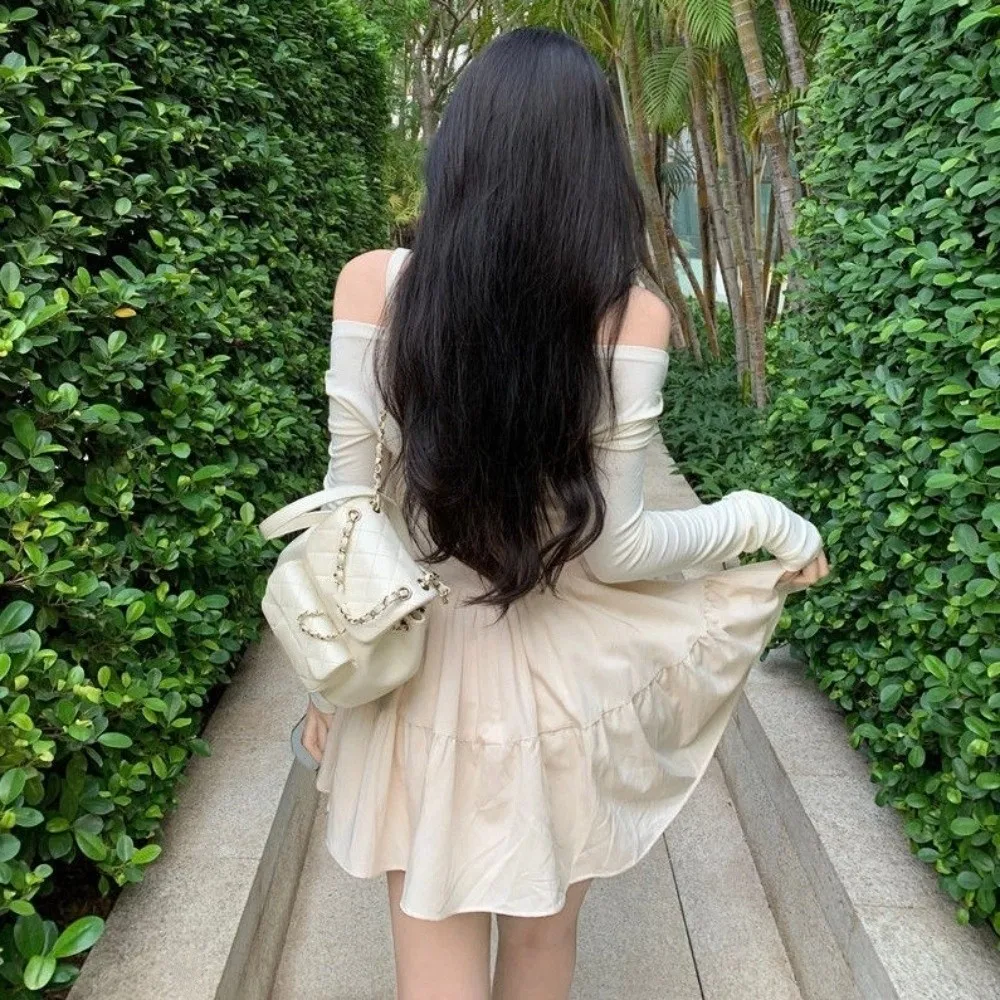 - > Menina picante manga comprida magro saia curta fino ajuste leve um colarinho vestido lazer y2k a linha saia curta viagem