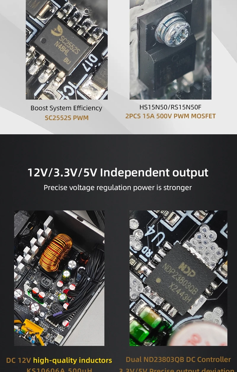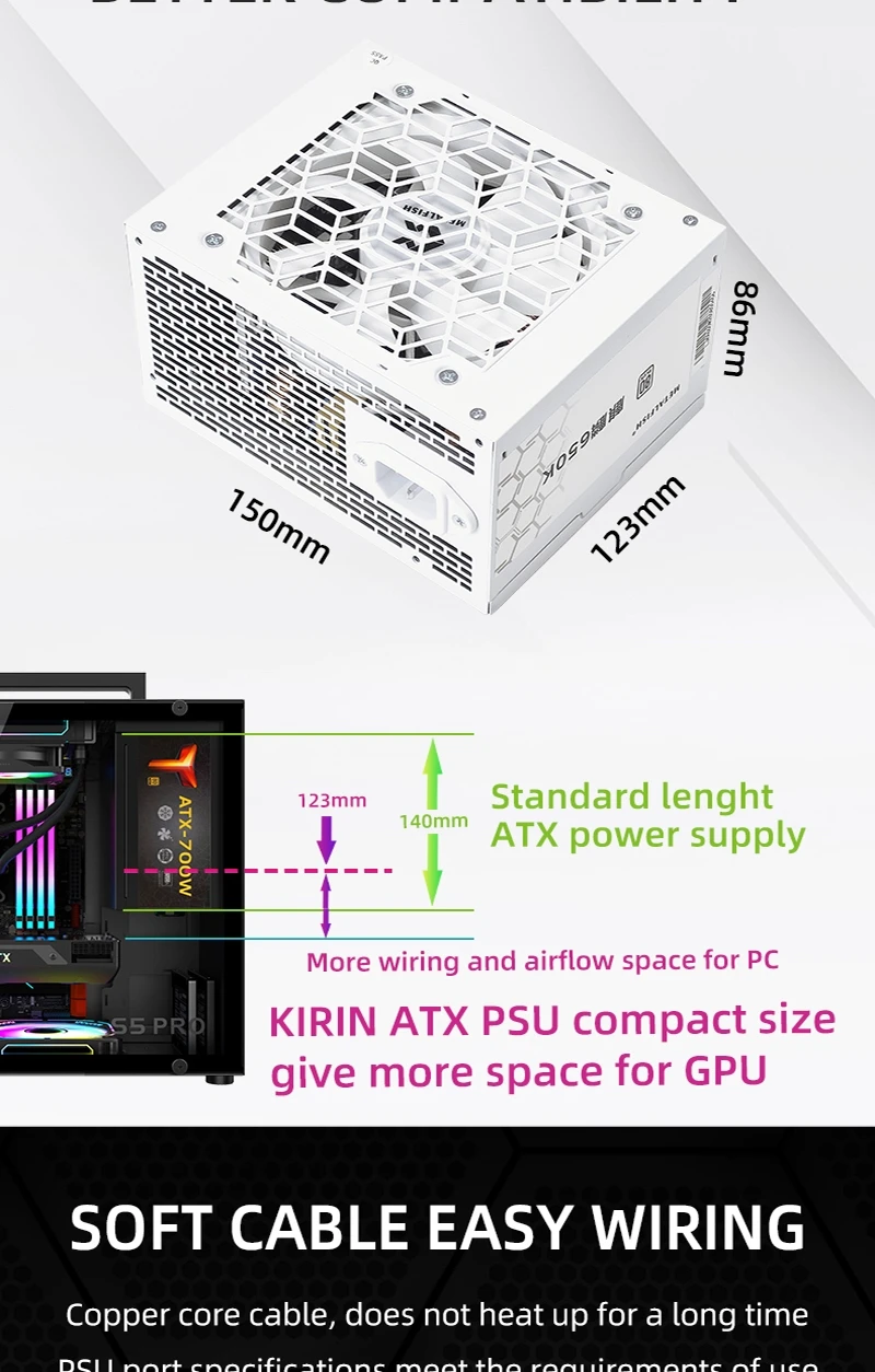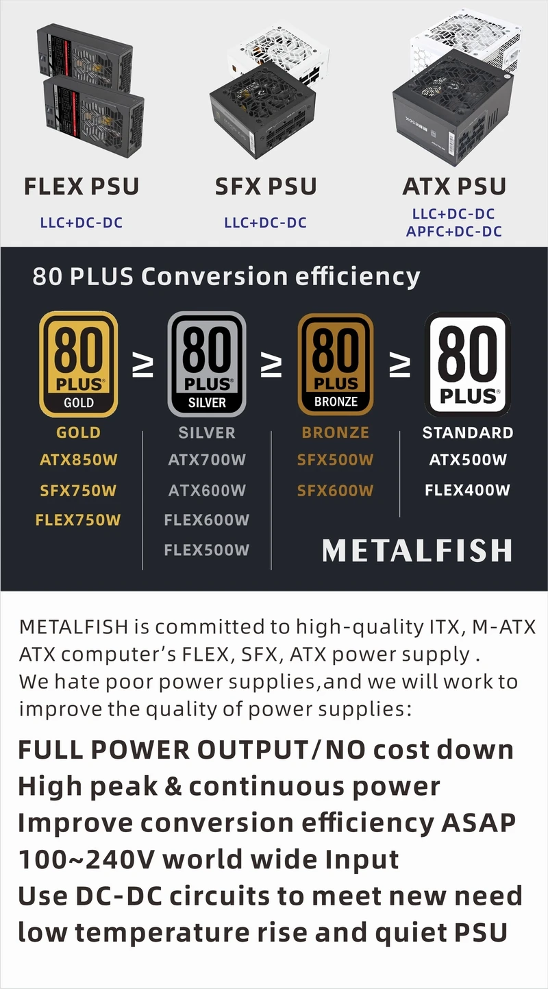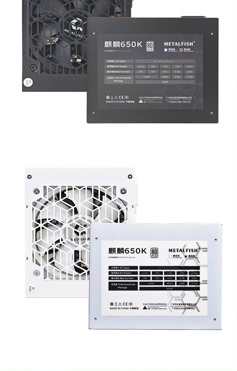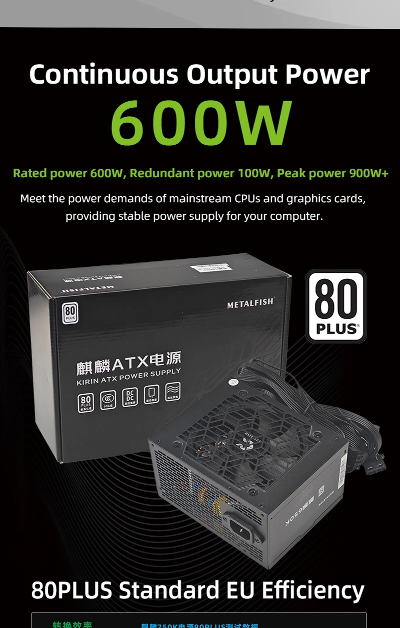 - > METALFISH KIRIN650K Fonte de alimentação de chassi preto ATX-500W 80PLUS PSU para computadores de jogos, docks de placas gráficas (100-240V)