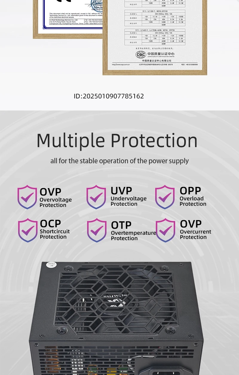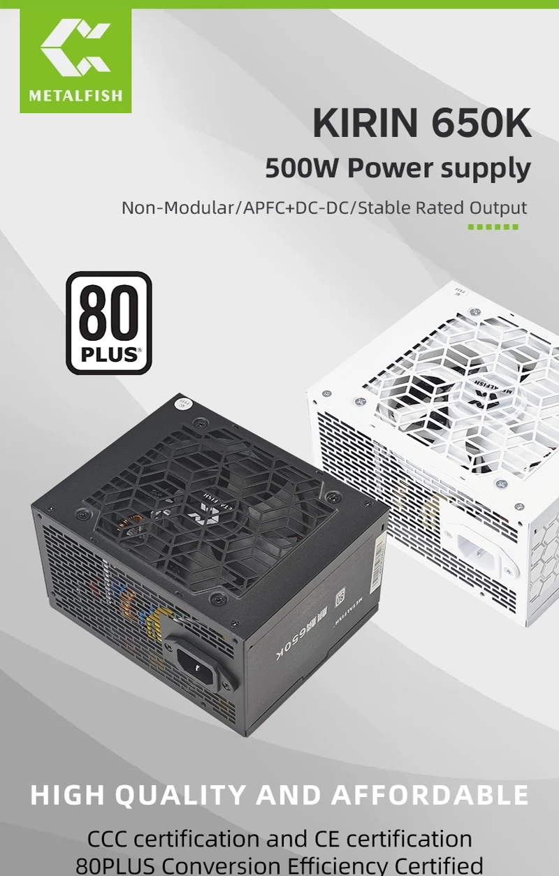 METALFISH KIRIN650K Fonte de alimentação de chassi preto ATX-500W 80PLUS PSU para computadores de jogos, docks de placas gráficas (100-240V)