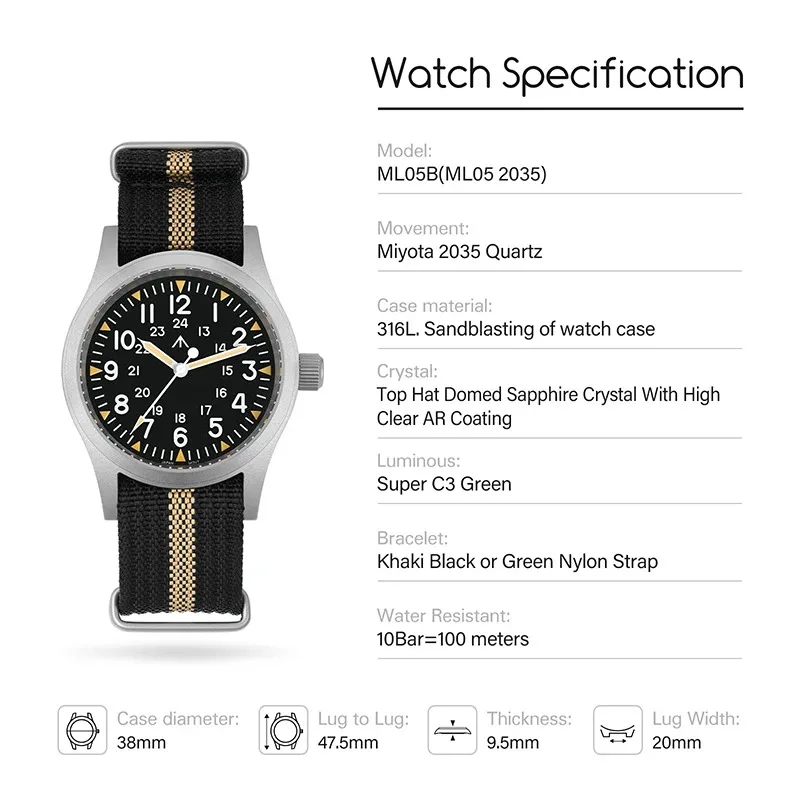 - > Militado ml05 38mm relógio militar miyota 2035 movimento cúpula cristal de safira c3 verde luminoso 10bar relógios vintage à prova dwaterproof água