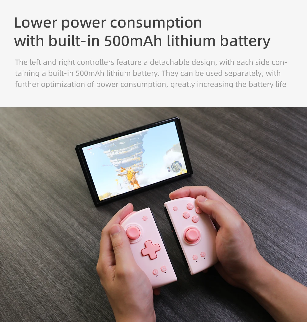O consumo de energia em espera M6 HD é significativamente reduzido, com autoconsumo em 7 microamperes. Em comparação com os 100 microamperes do Joy-Con e os 10 miliamperes do M6, ele minimiza drasticamente o impacto do modo de espera na bateria do console. Cada lado possui uma bateria de 500 miliamperes, proporcionando aproximadamente 17 horas de duração da bateria.