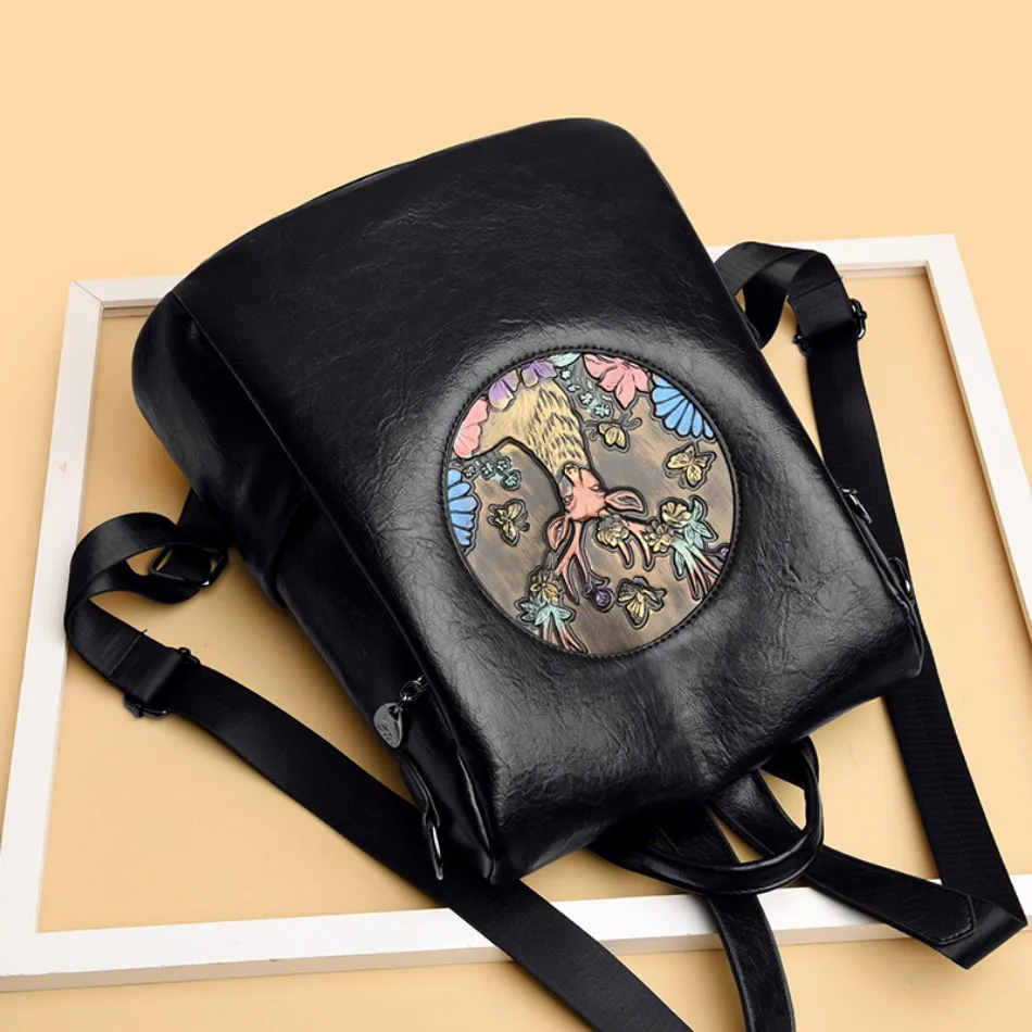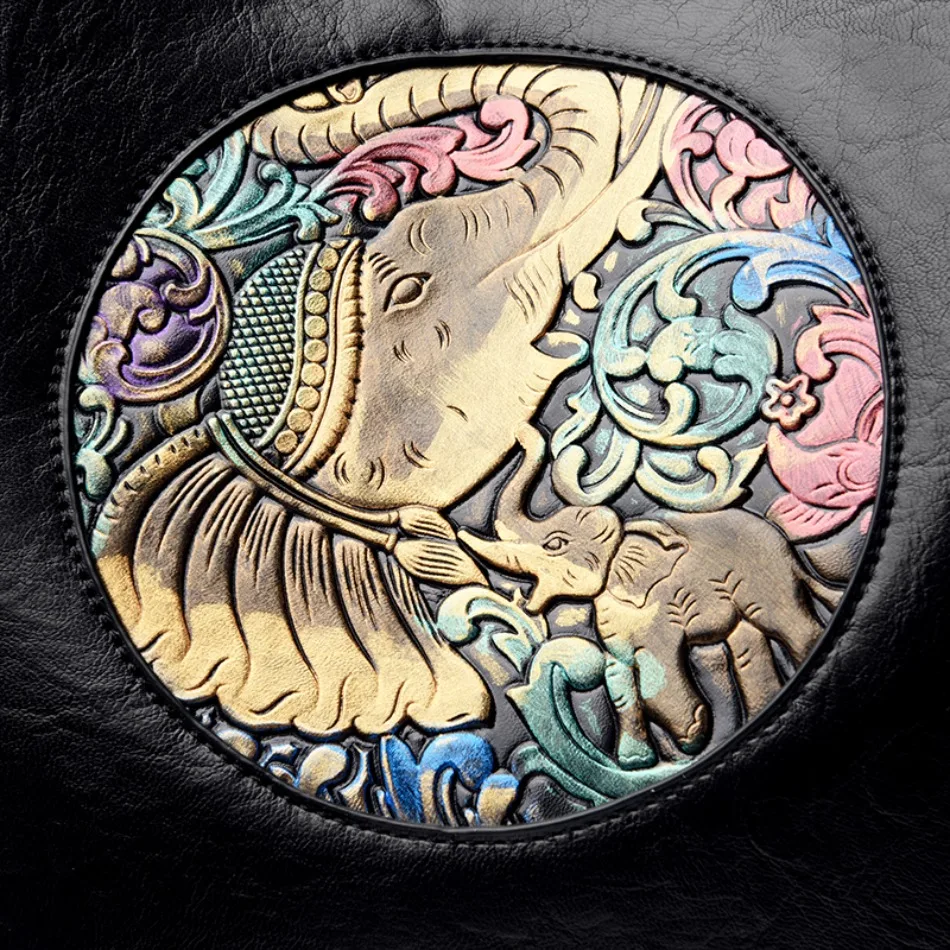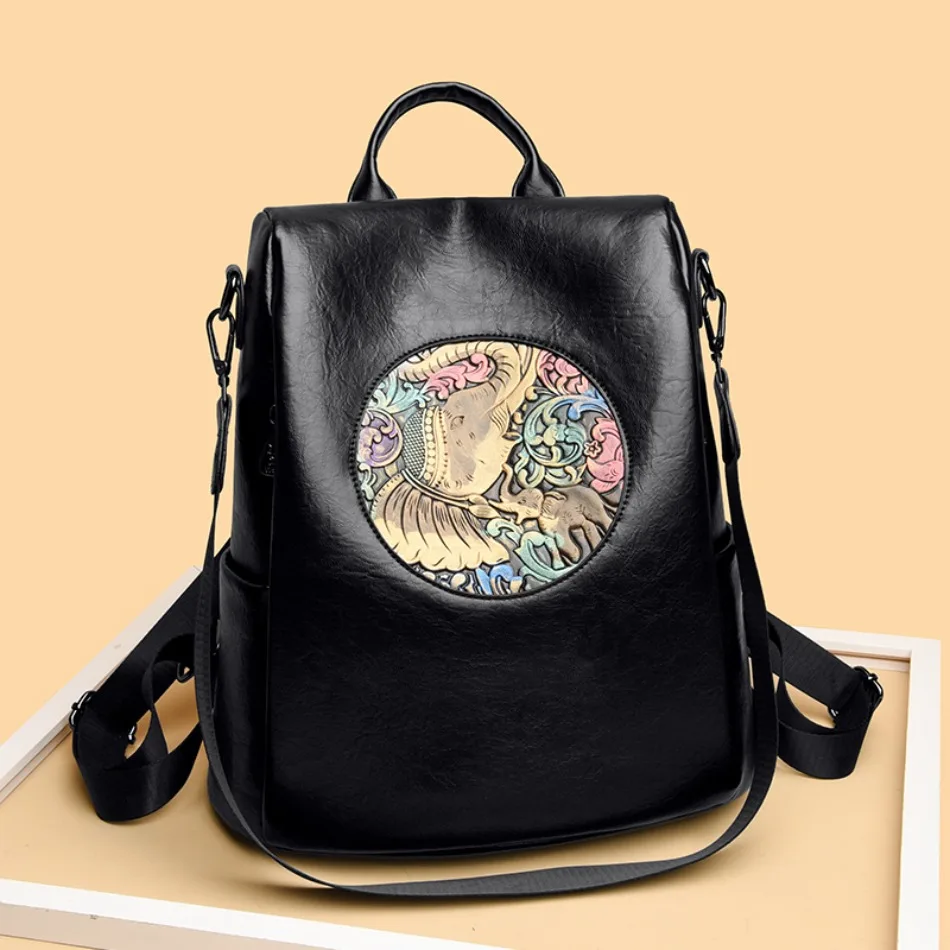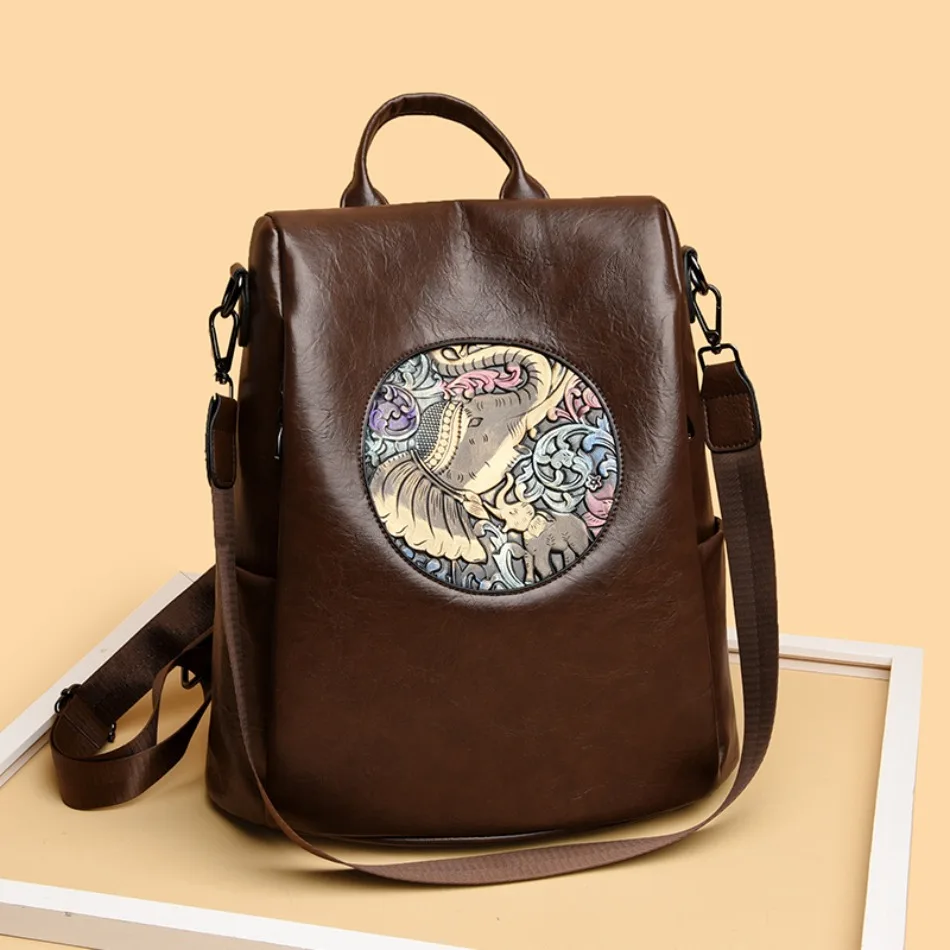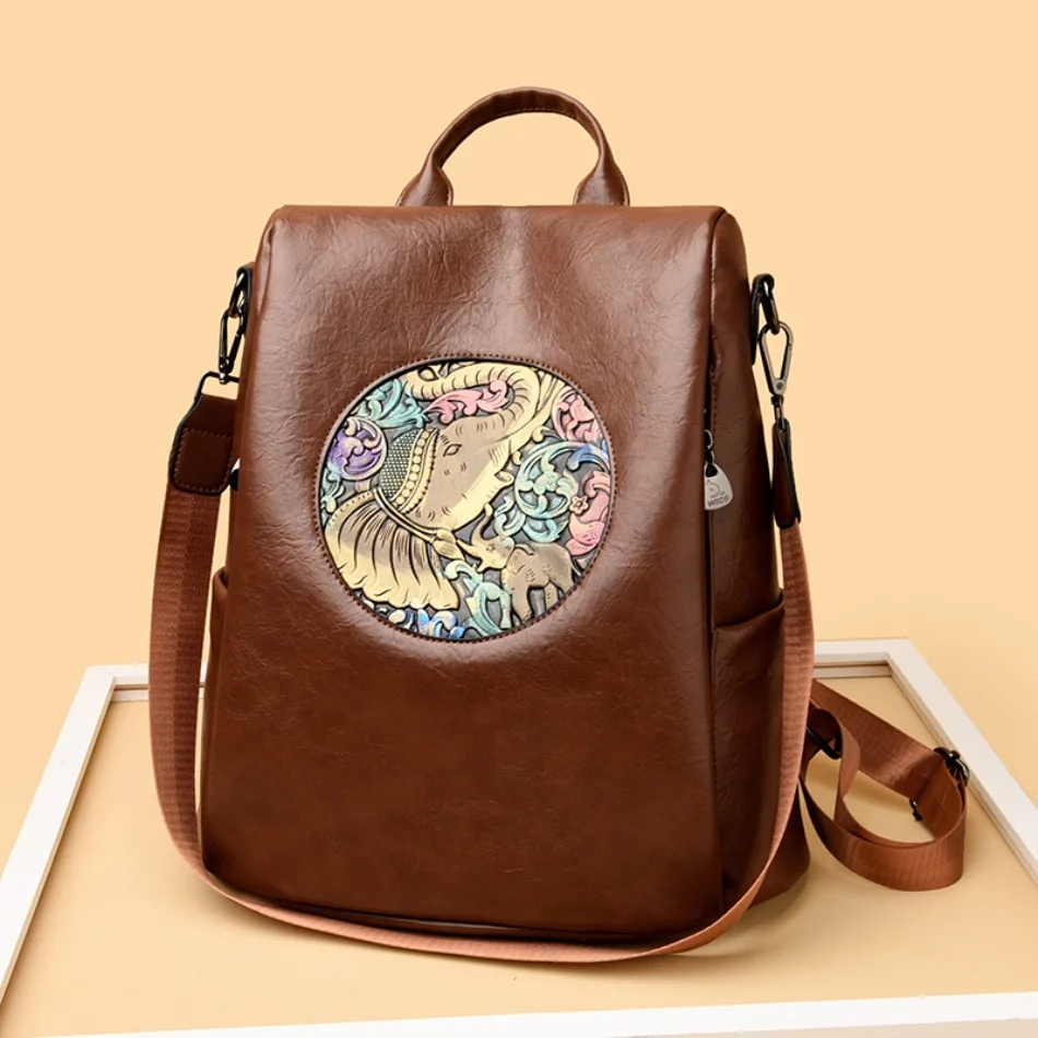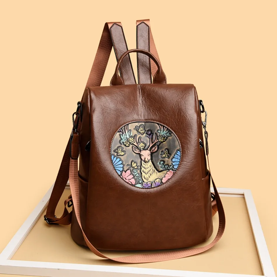 Mochila de Couro Texturizado com Estampa de Elefante e Cervo 3 em 1 Antifurto com Bolsos Laterais com Zíper