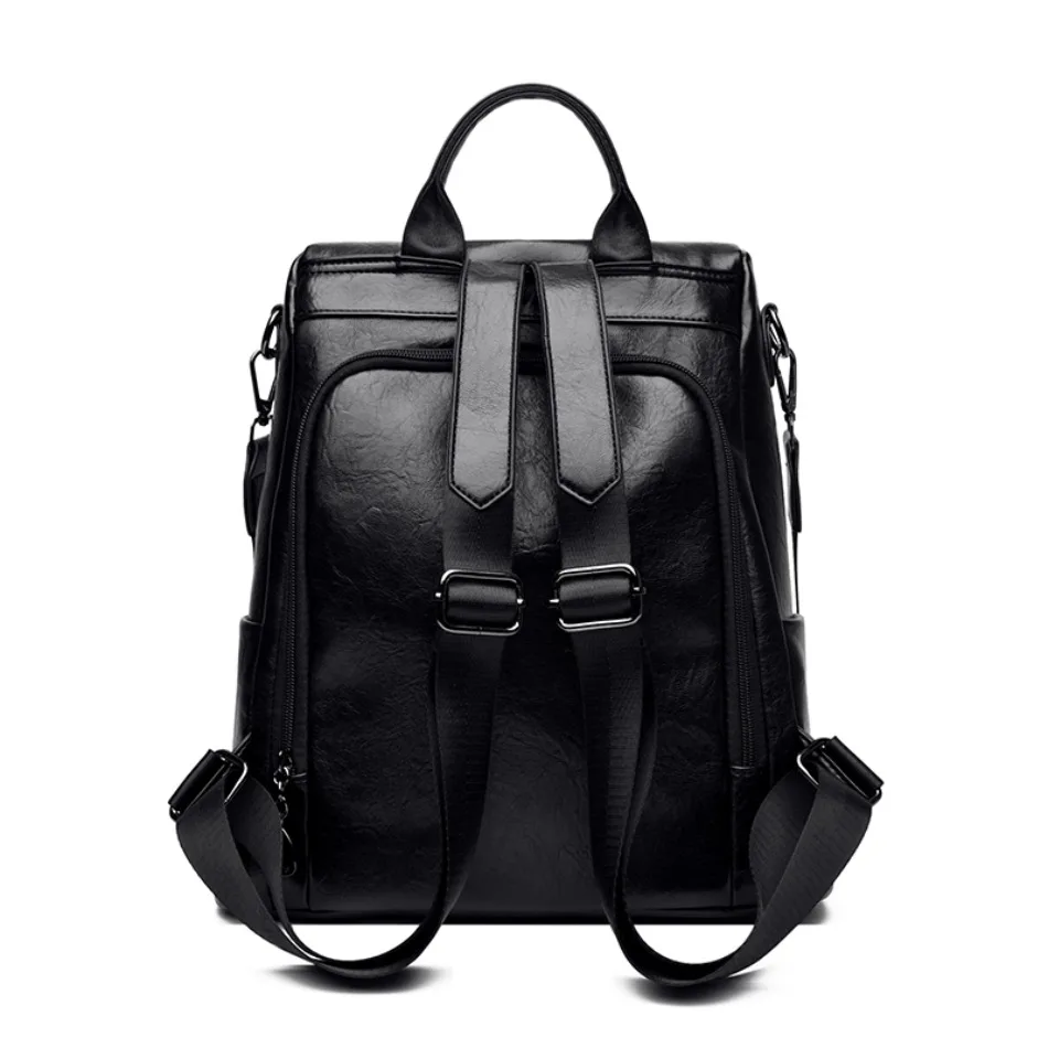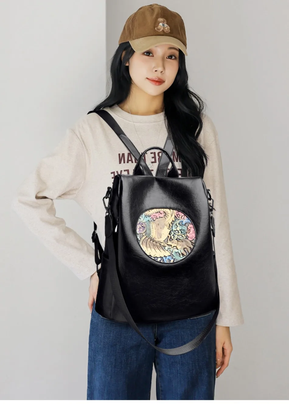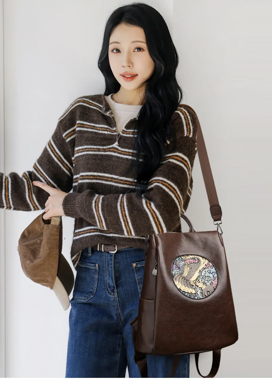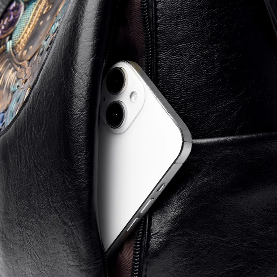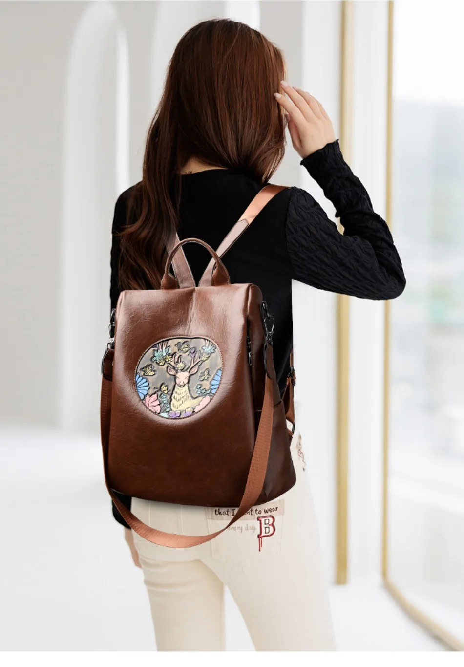 Mochila de Couro Texturizado com Estampa de Elefante e Cervo 3 em 1 Antifurto com Bolsos Laterais com Zíper