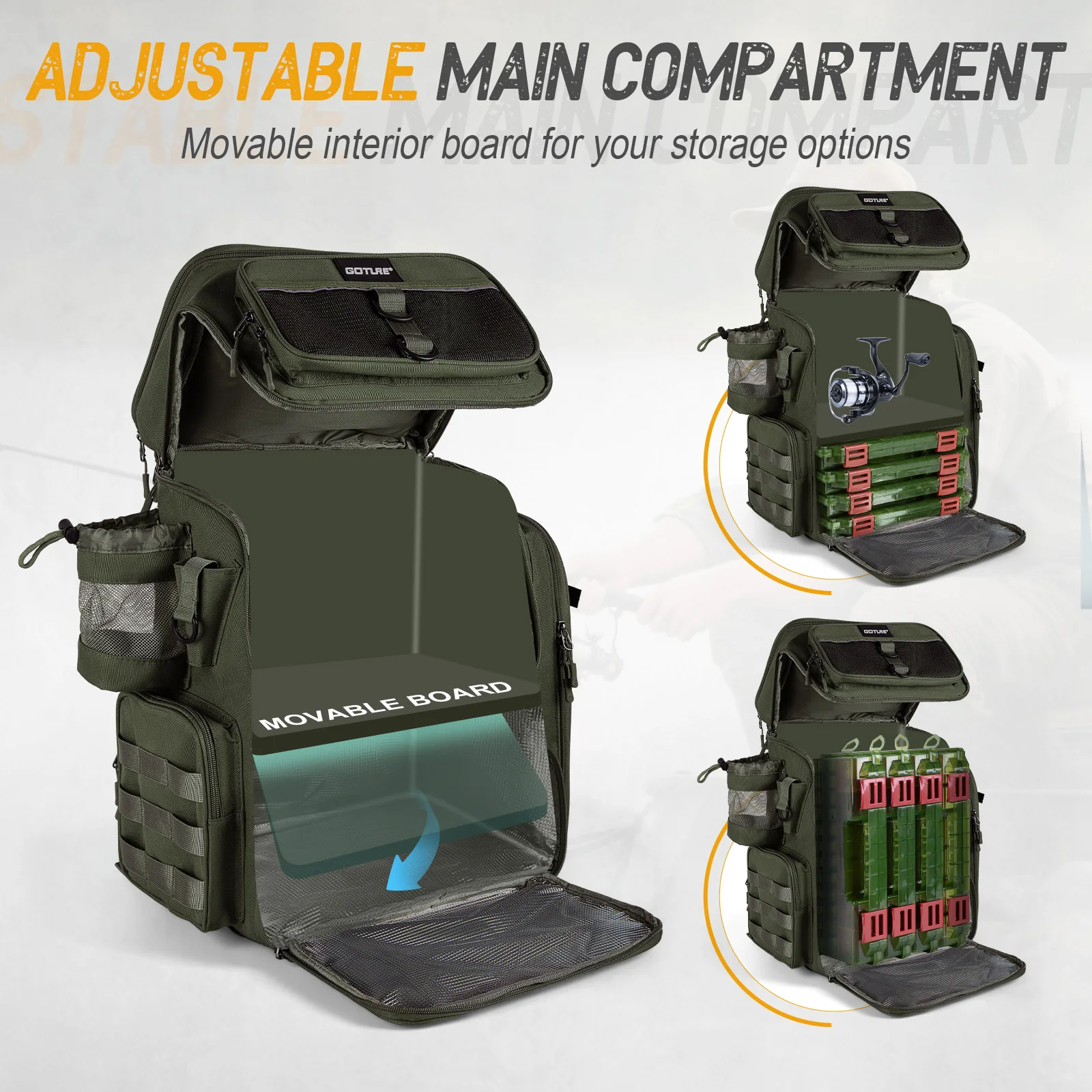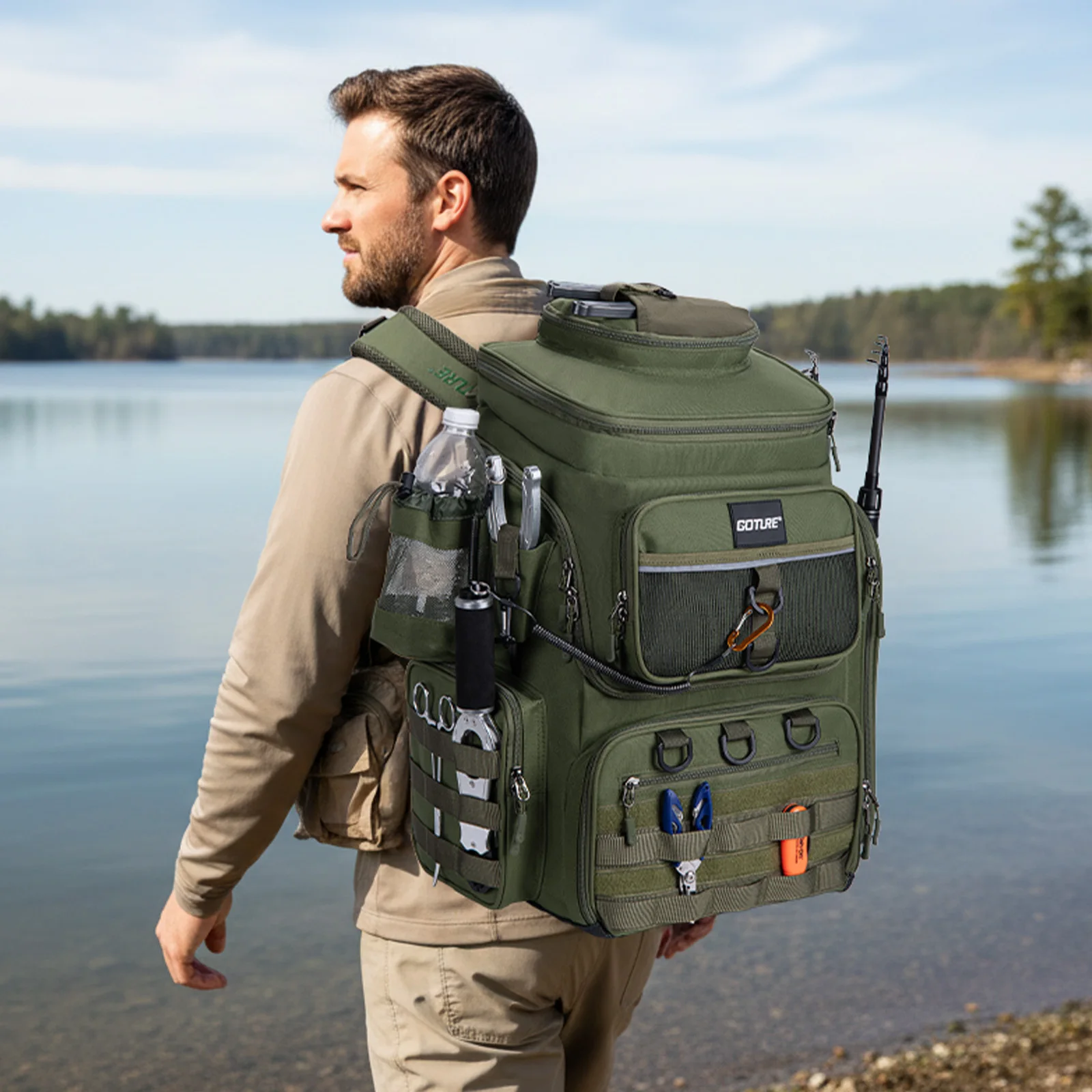- > Mochila de Pesca Impermeável Goture 50x41x21cm em Tecido Oxford 900D com Dois Suportes para Vara e Bolsa para Equipamentos