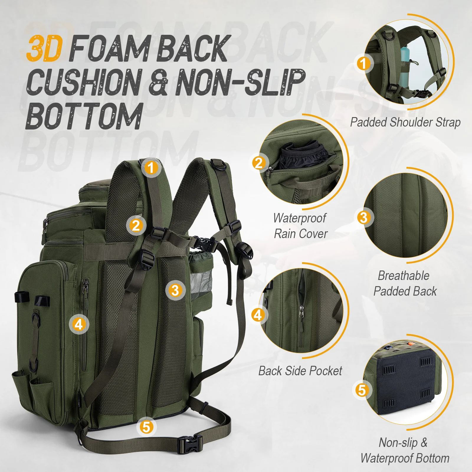 A mochila de pesca Goture é feita de tecido Oxford 900D de alta densidade e é 30% mais resistente a rasgos do que as bolsas tradicionais 600D.Graças à capa protetora contra chuva e às costuras reforçadas, o seu equipamento de pesca permanece seco mesmo em chuvas inesperadas ou salpicos de água salgada.As robustas almofadas de borracha antiderrapantes na parte inferior garantem uma aderência segura em qualquer superfície.