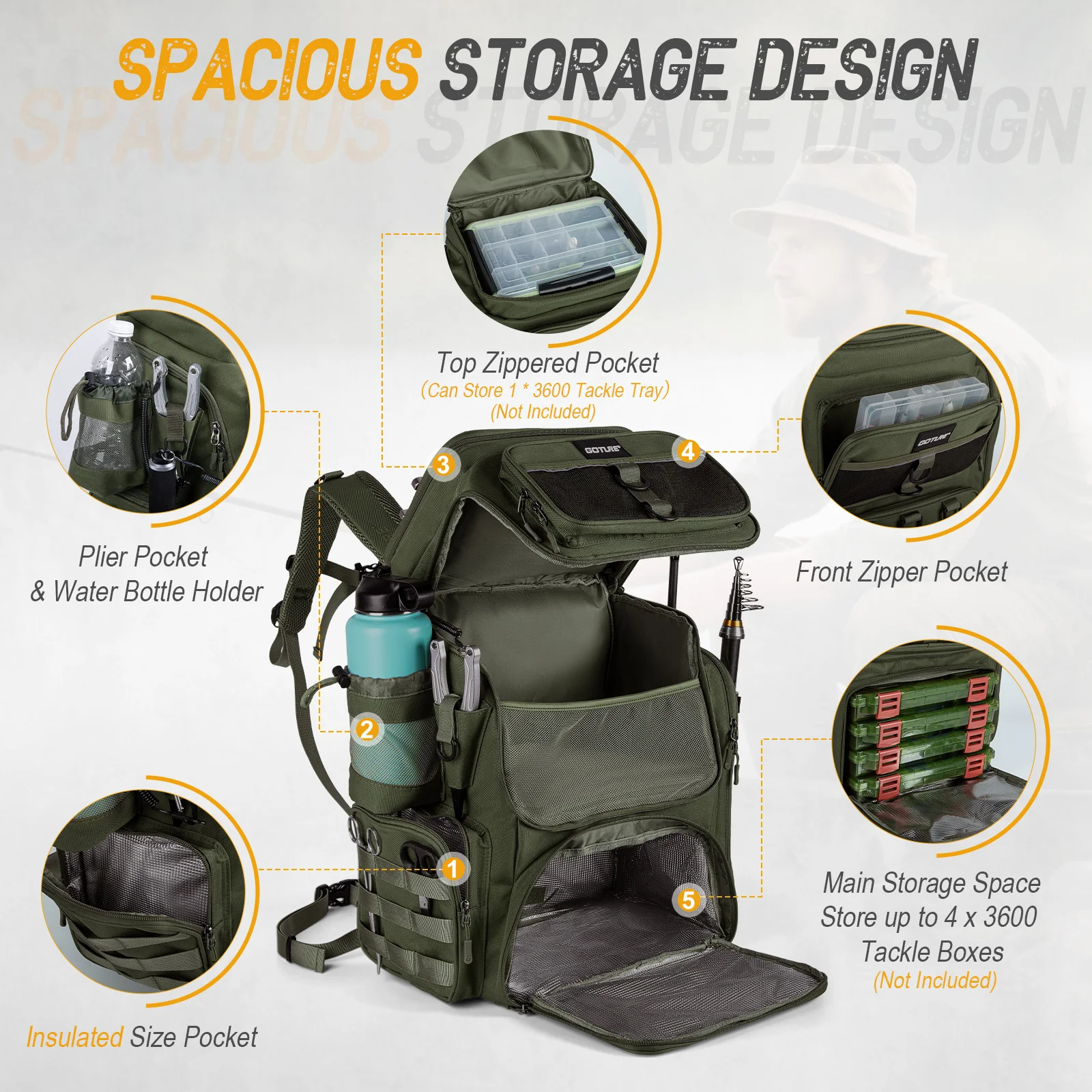 A bolsa de pesca oferece capacidade de 55 litros com um grande compartimento principal para caixas de equipamento, roupas e itens maiores.A mochila de pesca também possui um compartimento superior para óculos de sol, um compartimento para garrafa, dois suportes para varas, dois compartimentos para alicates, um bolso de tela, sistema tático Molle, múltiplos anéis em D e sete bolsos com zíper para organização clara.