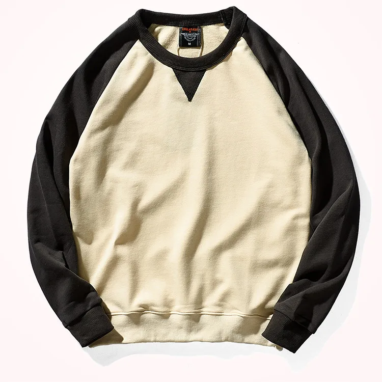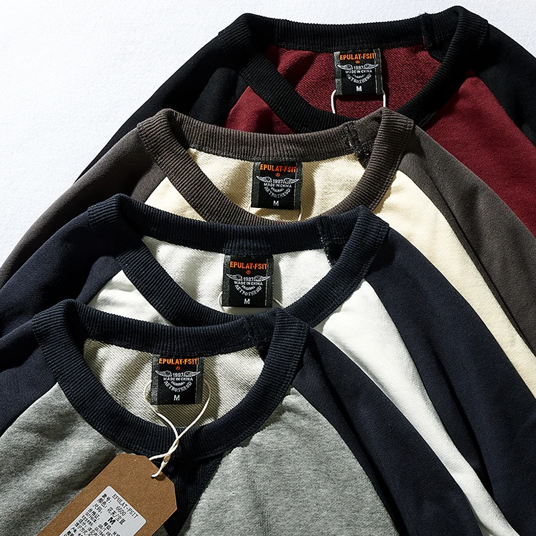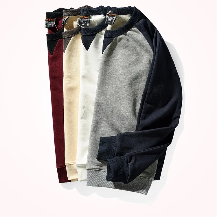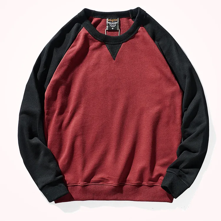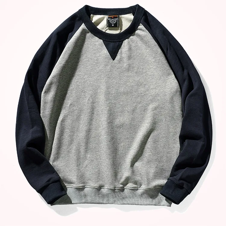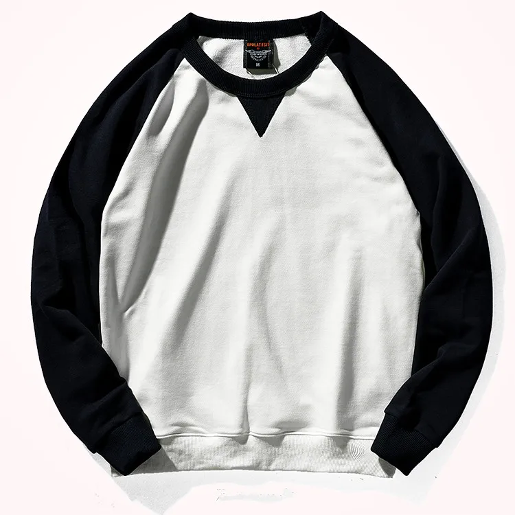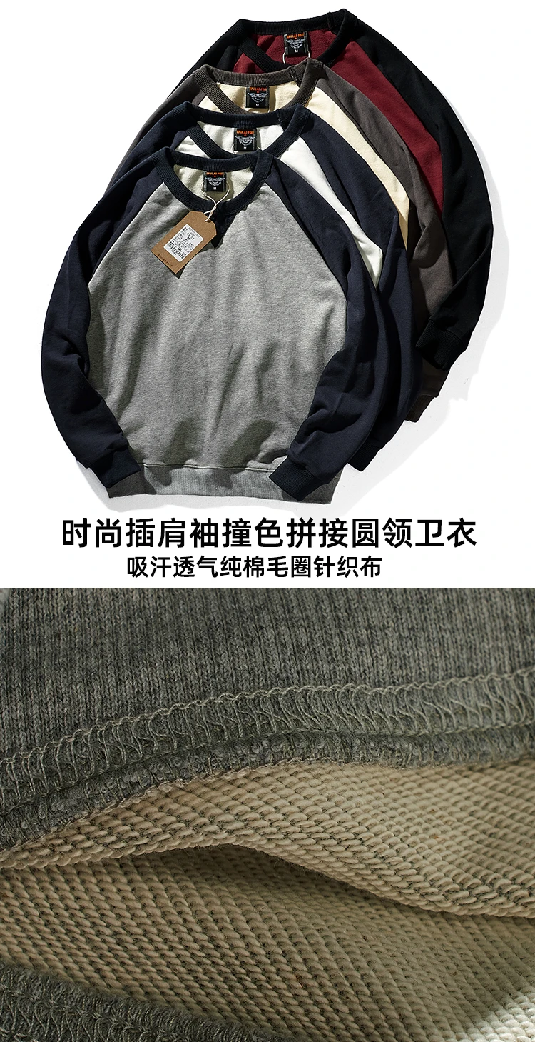 - > Moletons de costura com contraste Terry americano masculino, algodão puro, pulôver lavado com gola O velha, manga raglan de malha, moletons casuais
