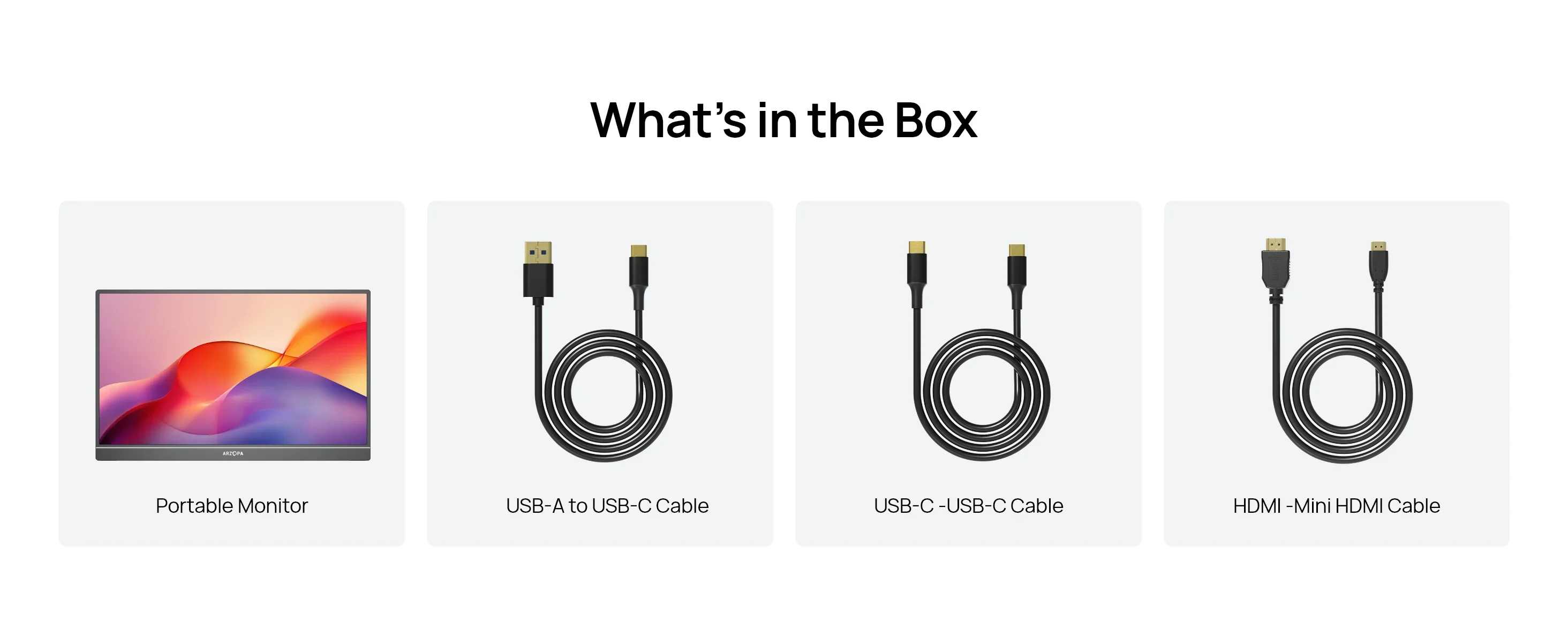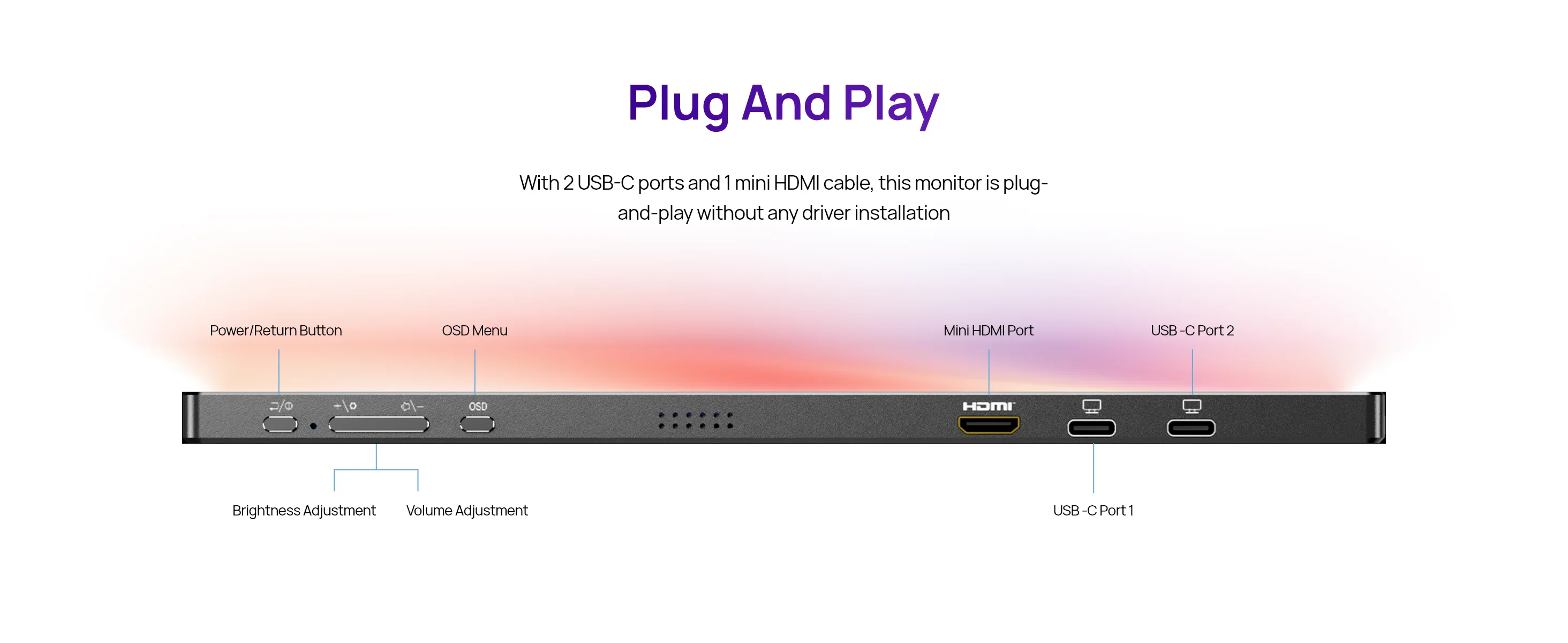 Com 2 portas USB-C e 1 cabo mini HDMI, este monitor é plug-and-play sem qualquer instalação de driver