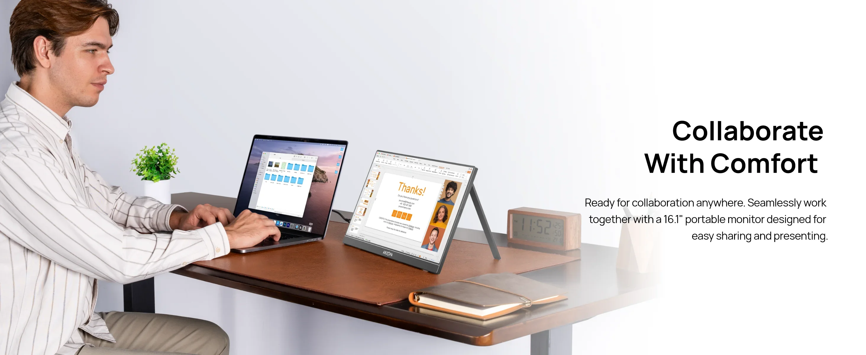 Pronto para colaborar em qualquer lugar.Trabalhe perfeitamente em conjunto com um monitor portátil de 16,1" projetado para fácil compartilhamento e apresentação.