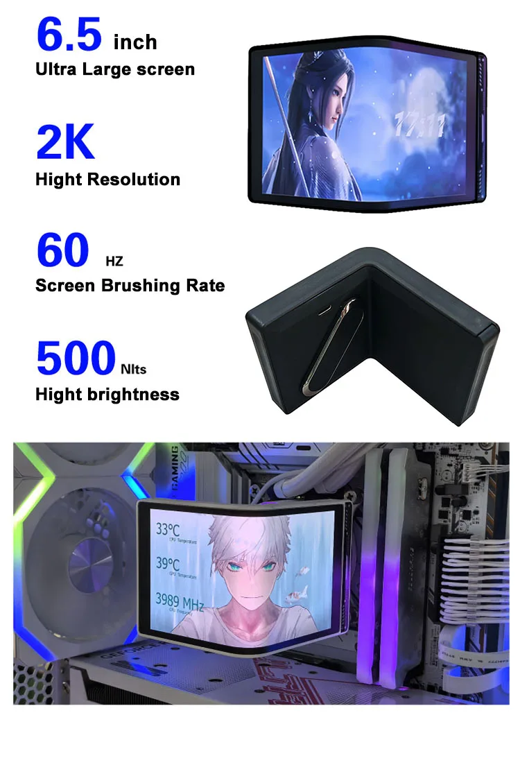 Monitor Secundário de 6,5 Polegadas com Tela Flexível AMOLED, Resfriamento a Água 360, Tela Curva, Monitoramento de Chassi, Vídeo 3D 2K Dobrável