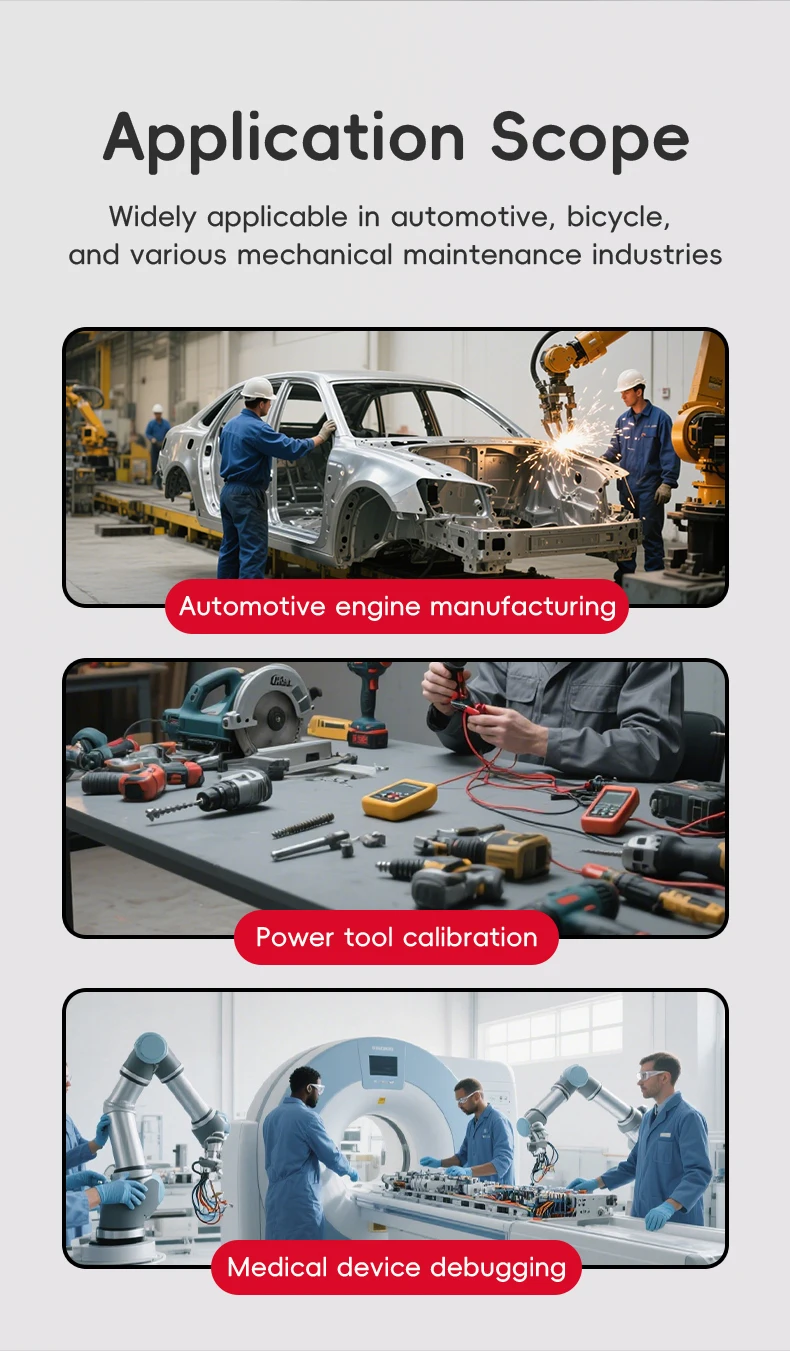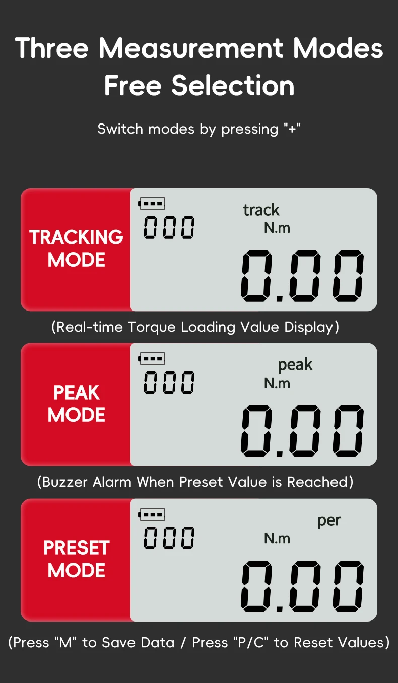 Três modos de trabalho: selecione entre modos em tempo real, pico e predefinidos para adaptar seu monitoramento de torque às suas necessidades específicas.