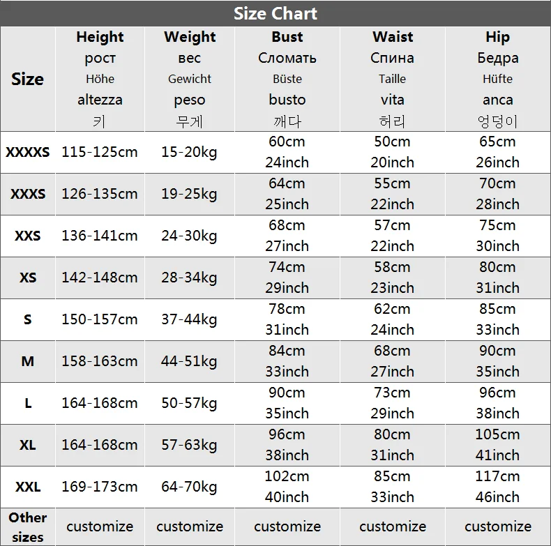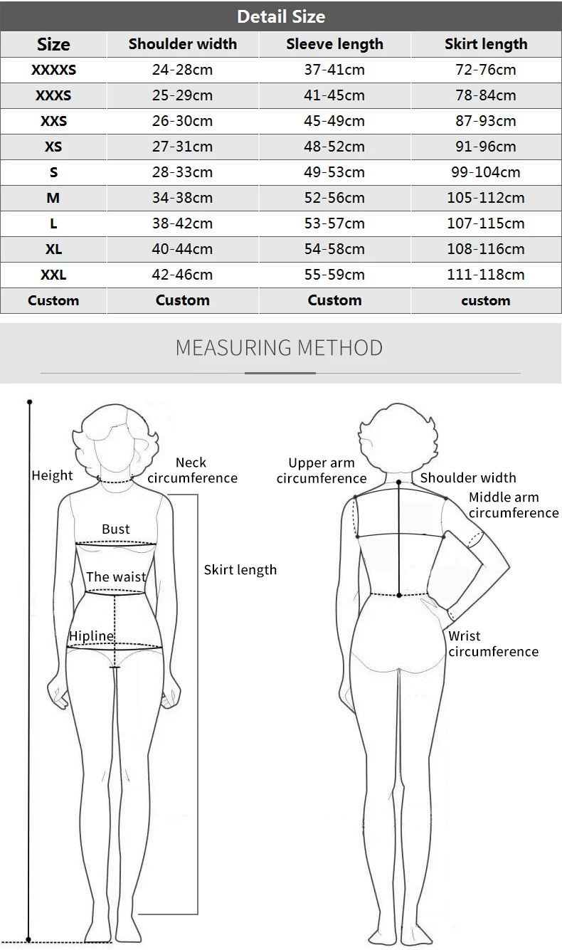 Se os tamanhos acima não forem adequados para você, você pode nos fornecer suas informações de tamanho (altura, peso, busto, cintura, quadril),Personalizaremos as roupas de acordo com o seu tamanho, mas as roupas personalizadas não suportam devoluções ou trocas.