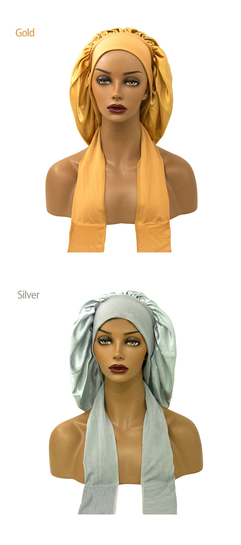 Mulheres cetim ampliado chapéu de sono noite boné de sono com longa streamer cuidados com o cabelo gorro de noite elástico boné de nuit chuveiro turbante