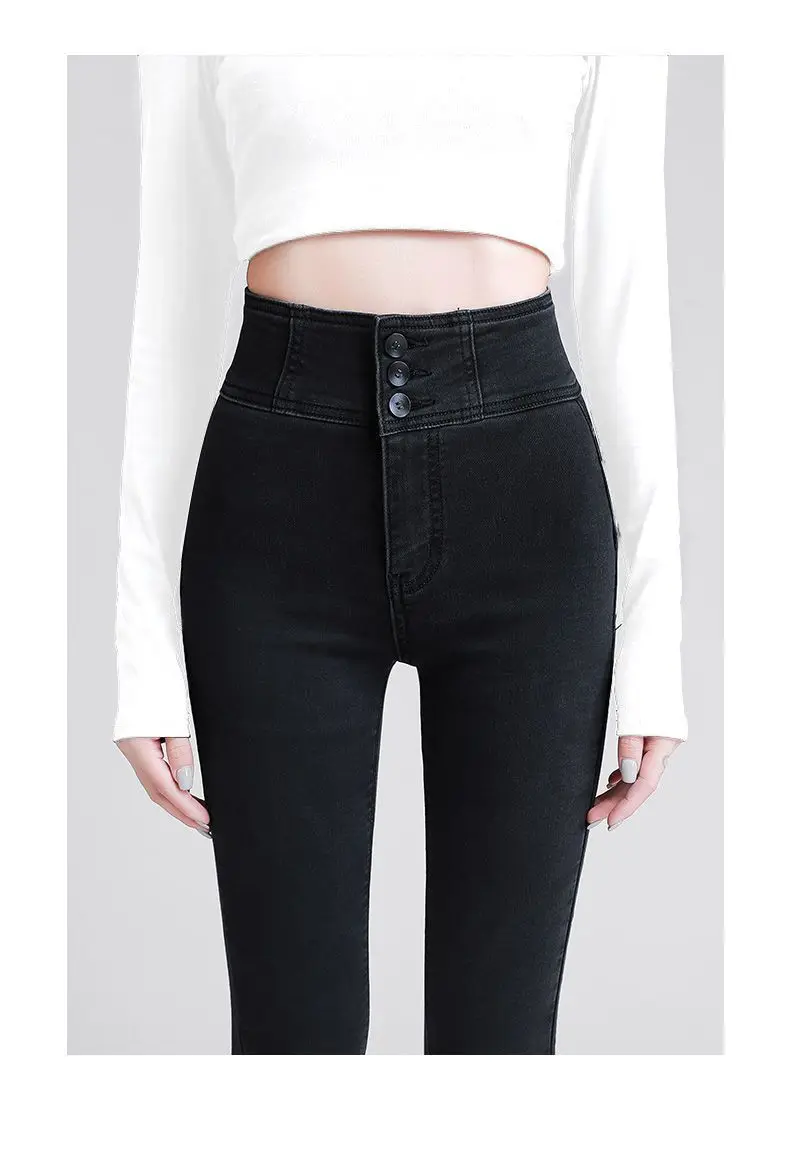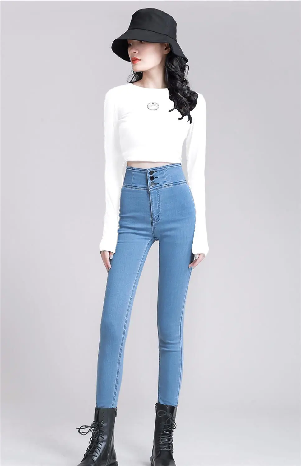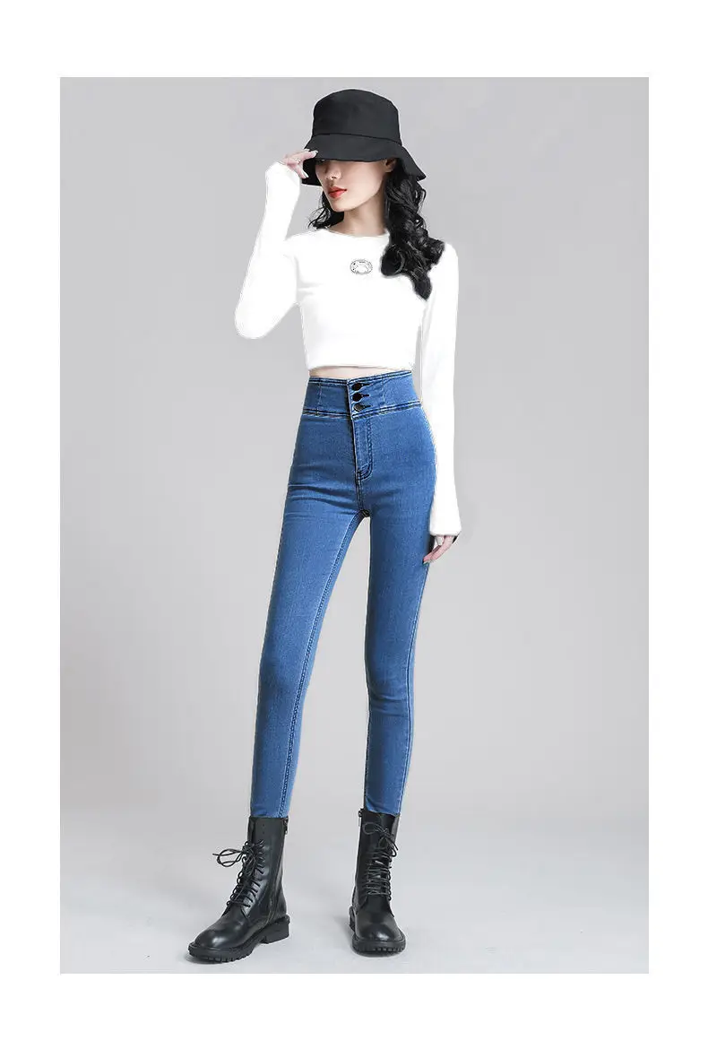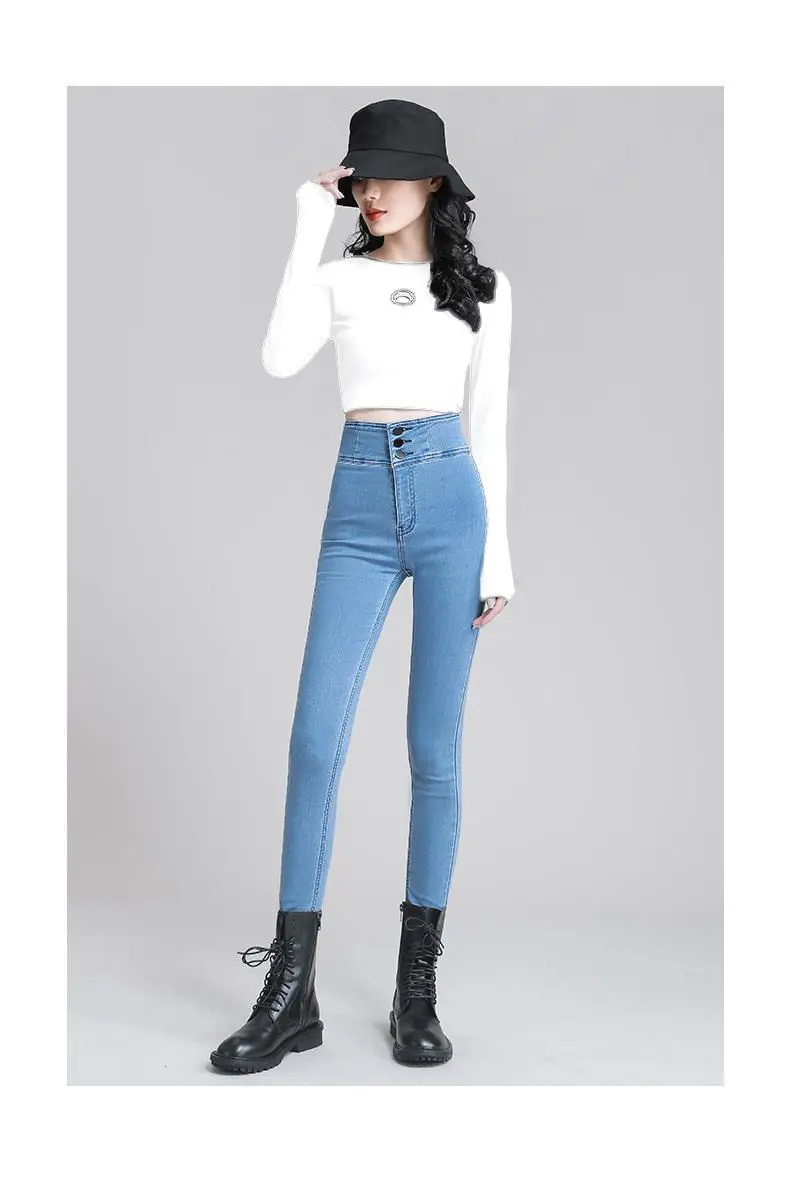 Mulheres coreanas de cintura alta jeans magros primavera outono streetwear moda calças finas denim botão sólido casual lápis calças 2022