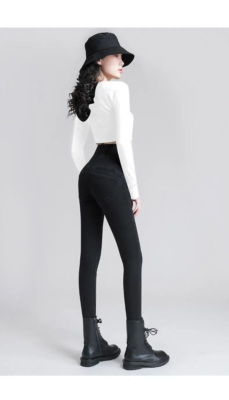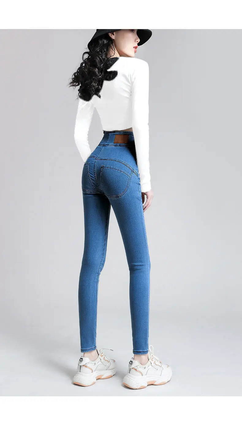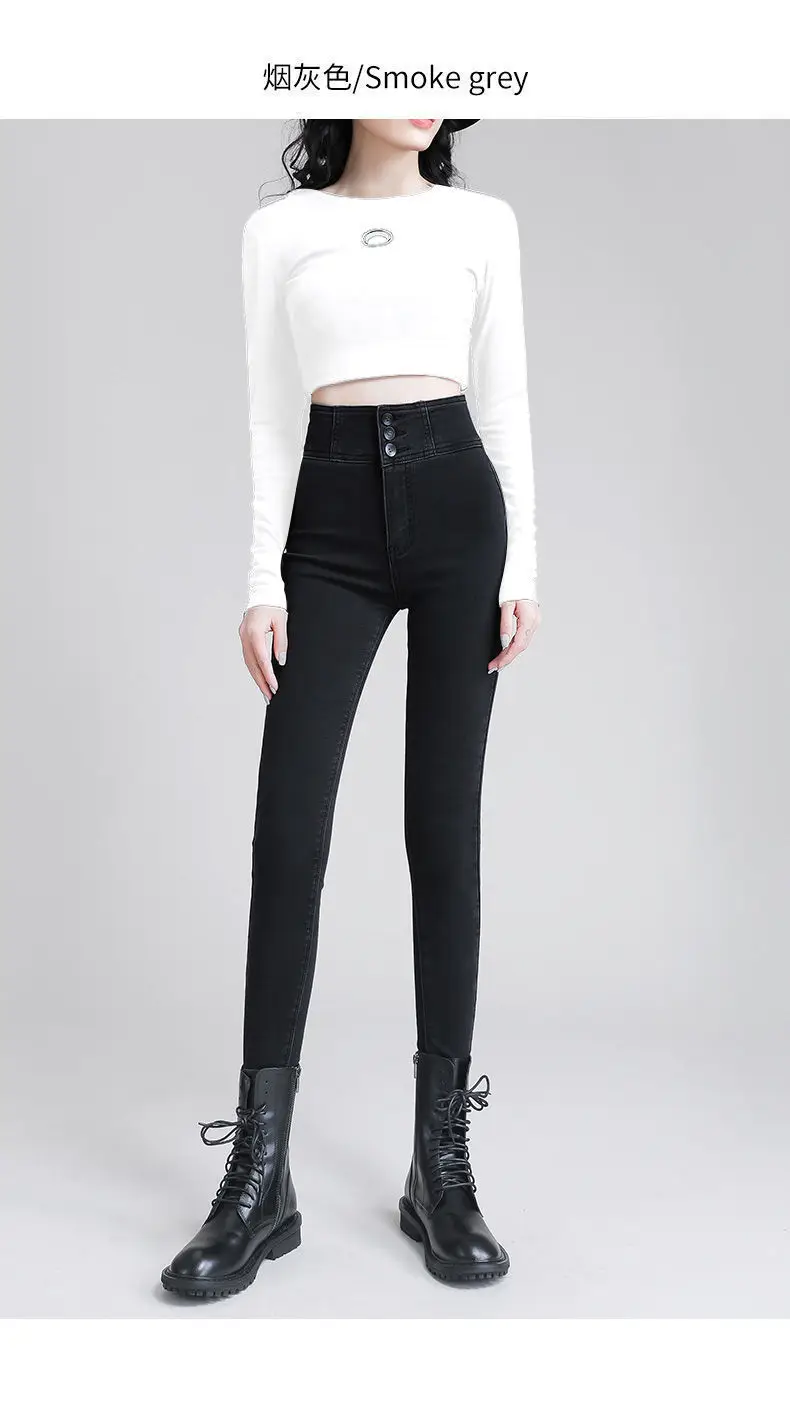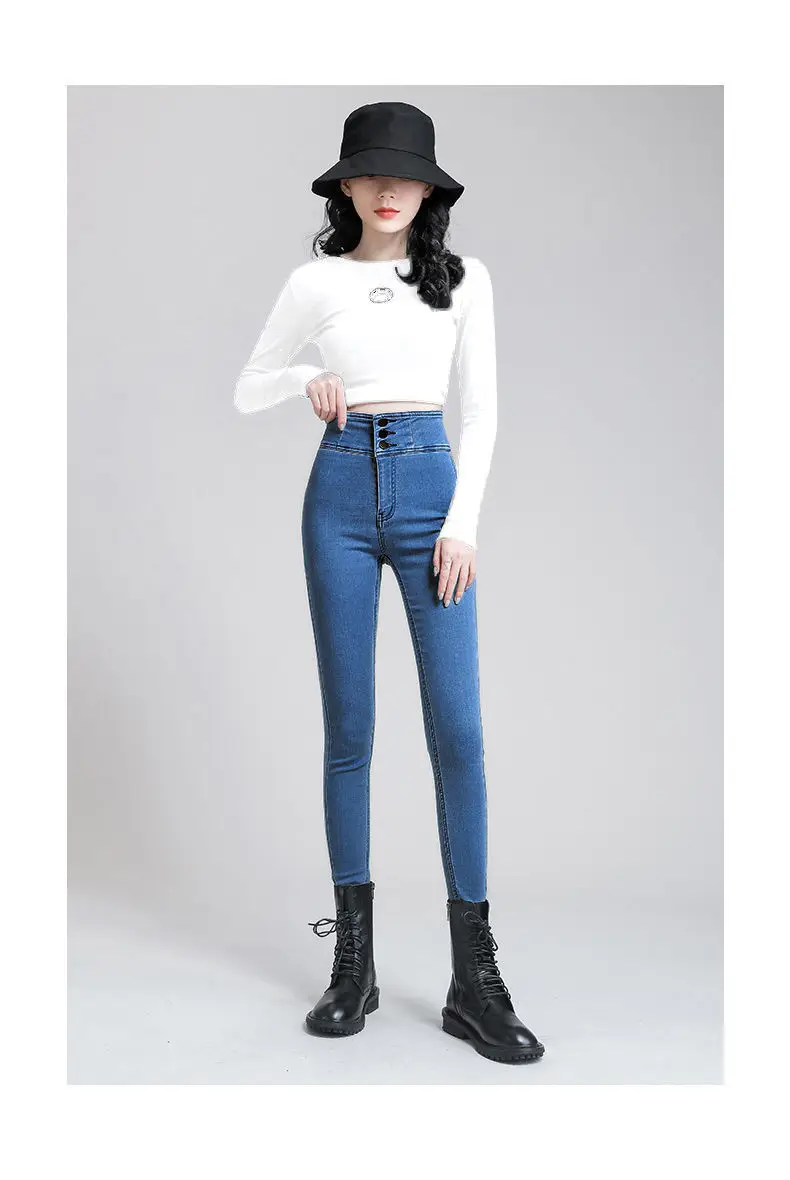 Mulheres coreanas de cintura alta jeans magros primavera outono streetwear moda calças finas denim botão sólido casual lápis calças 2022