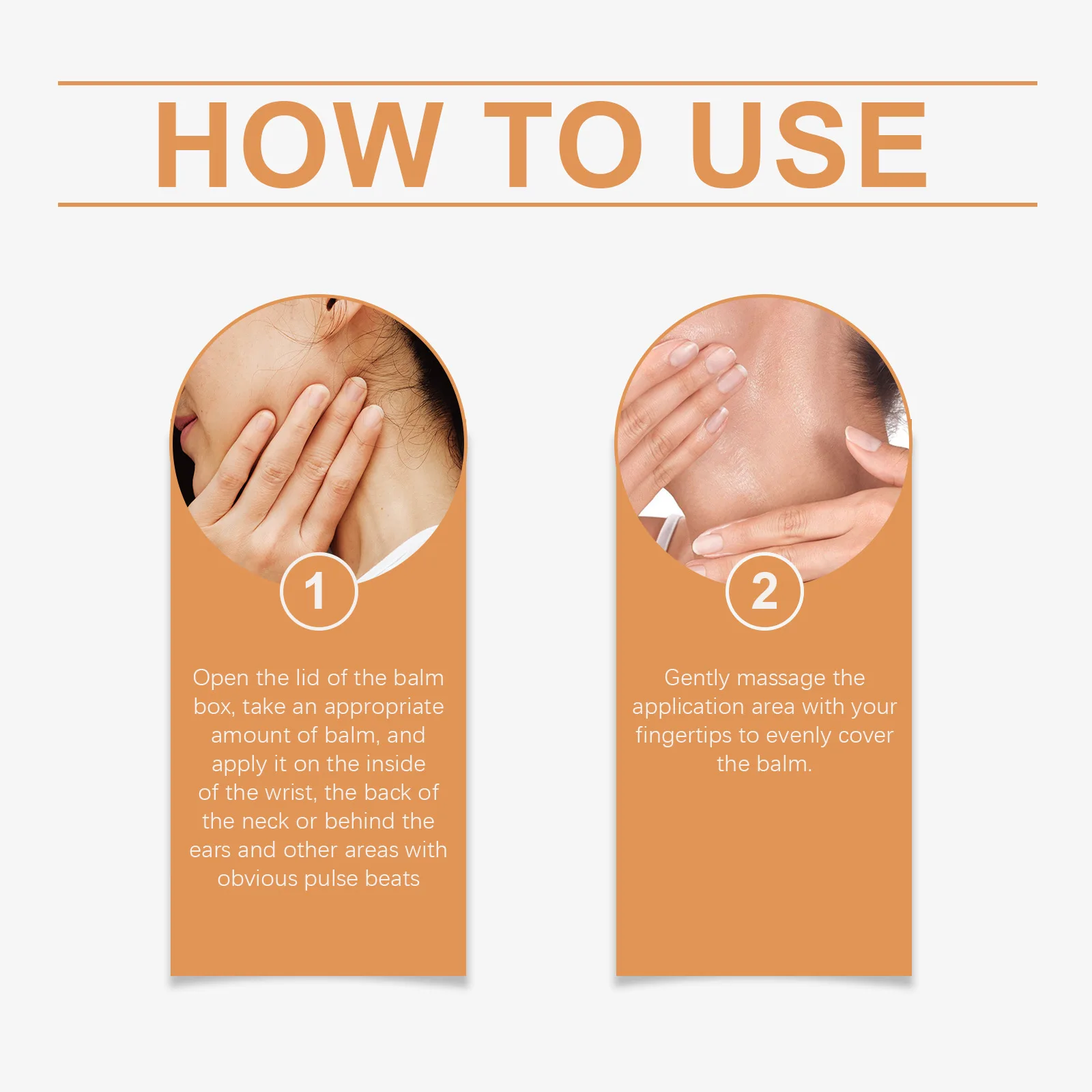 1.Abra a tampa da caixa do bálsamo, pegue uma quantidade adequada de bálsamo e aplique-a na parte interna do pulso, na nuca ou atrás das orelhas e em outras áreas com batidas de pulso óbvias.