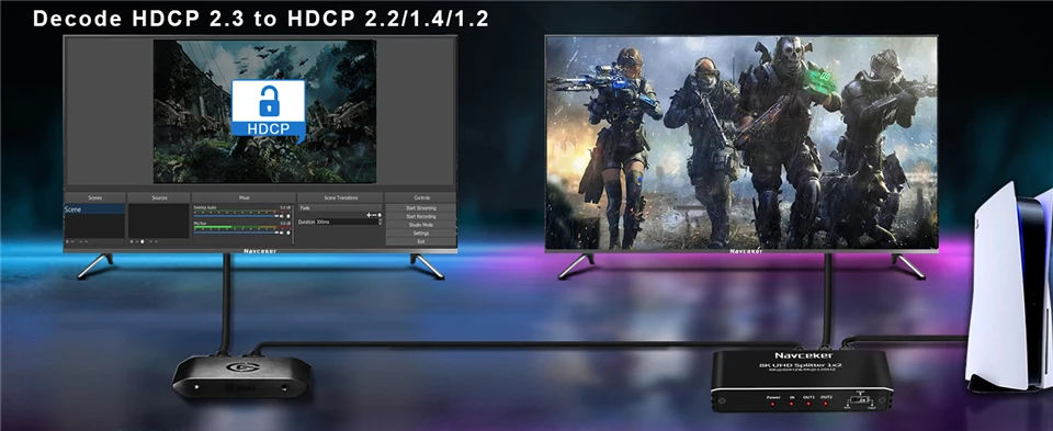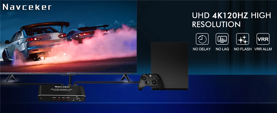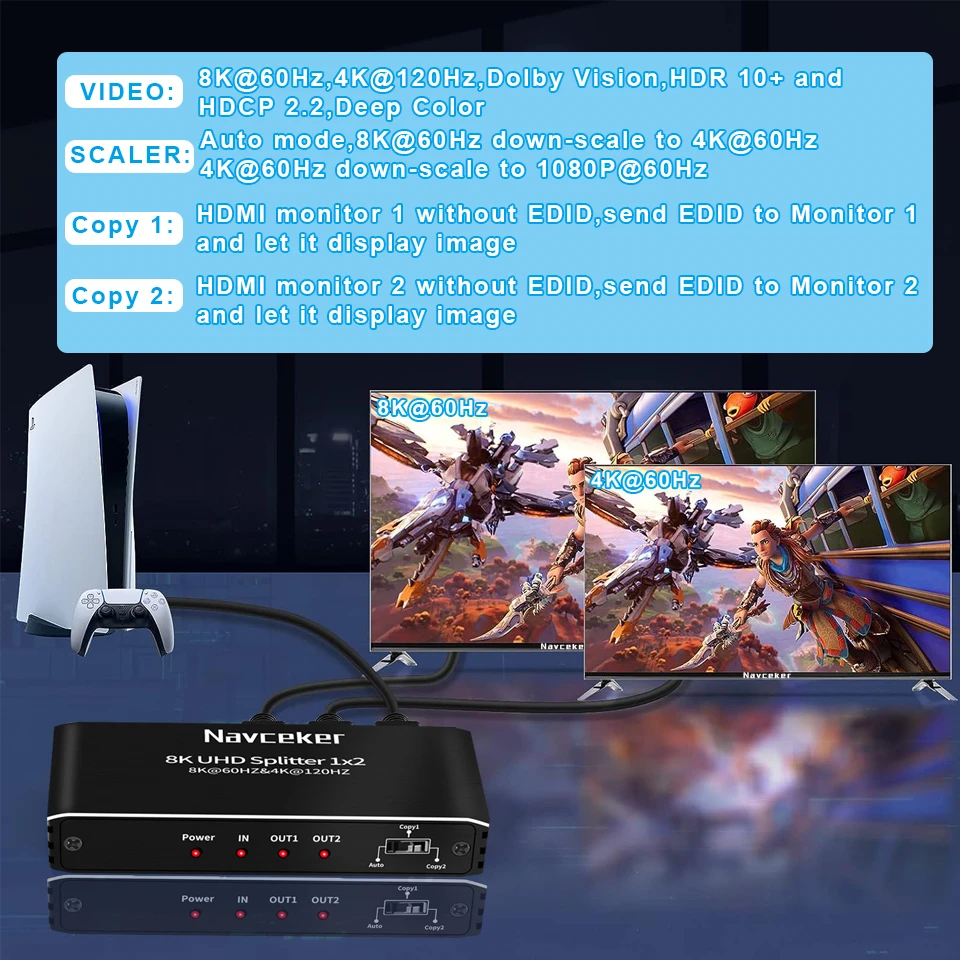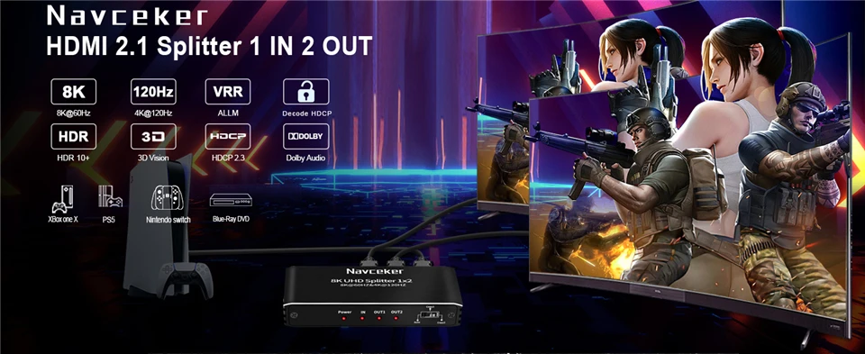 - > Navceker-hdmi divisor 8k 60hz 4k 120hz 1x2 hdmi 2.1 divisor de áudio 1 em 2 out, extensor para ps5 xbox