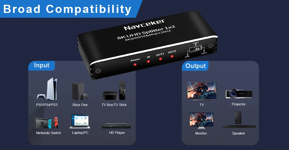 Usando o mais recente chip divisor HDMI, o divisor Navceker 8K HDMI 1 em 2 é compatível com a maioria dos dispositivos com interface HDMI padrão, incluindo: Apple TV, XBox Um, PS5, PS4, PS4 Pro, Fire TV Stick, Blu-Ray DVD player, receptor de satélite, Roku Stick, PC, Laptop, câmera HD e etc.