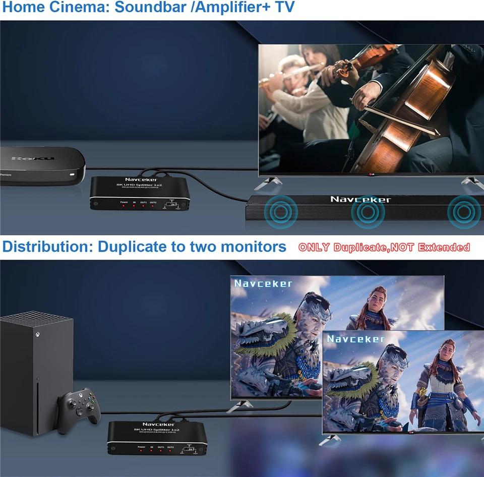 ★【 8K HDMI Splitter 1x2 】 Navceker 4K 120Hz 1x2 HDMI Splitter distribui 1 fonte HDMI duplicada para 2 monitores HDMI diferentes simultaneamente ou um monitor HDMI e uma barra de som. Transfira vídeo e áudio impressionantes e de alta definição sem perda e atraso. (Apenas sinal de entrada duplicado, NÃO suporte Estender)
