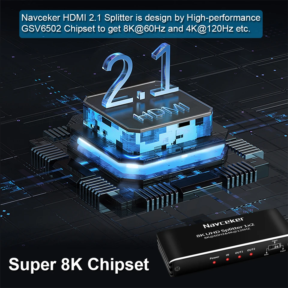 ZY-8K1, Navceker 1x2 HDMI 2.1 Splitter usar uma única fonte HDMI, acessando a várias pias HDMI. Permite que um dispositivo HDMI seja facilmente dividido em 2 monitores, projetores ou barra de som compatíveis com HDMI. Além disso, ele pode ser colocado no final de um cabo HDMI longo para regenerar o sinal HDMI. A resolução deste divisor de HDMI pode ser de até 8K @ 60Hz HDCP 2.3.