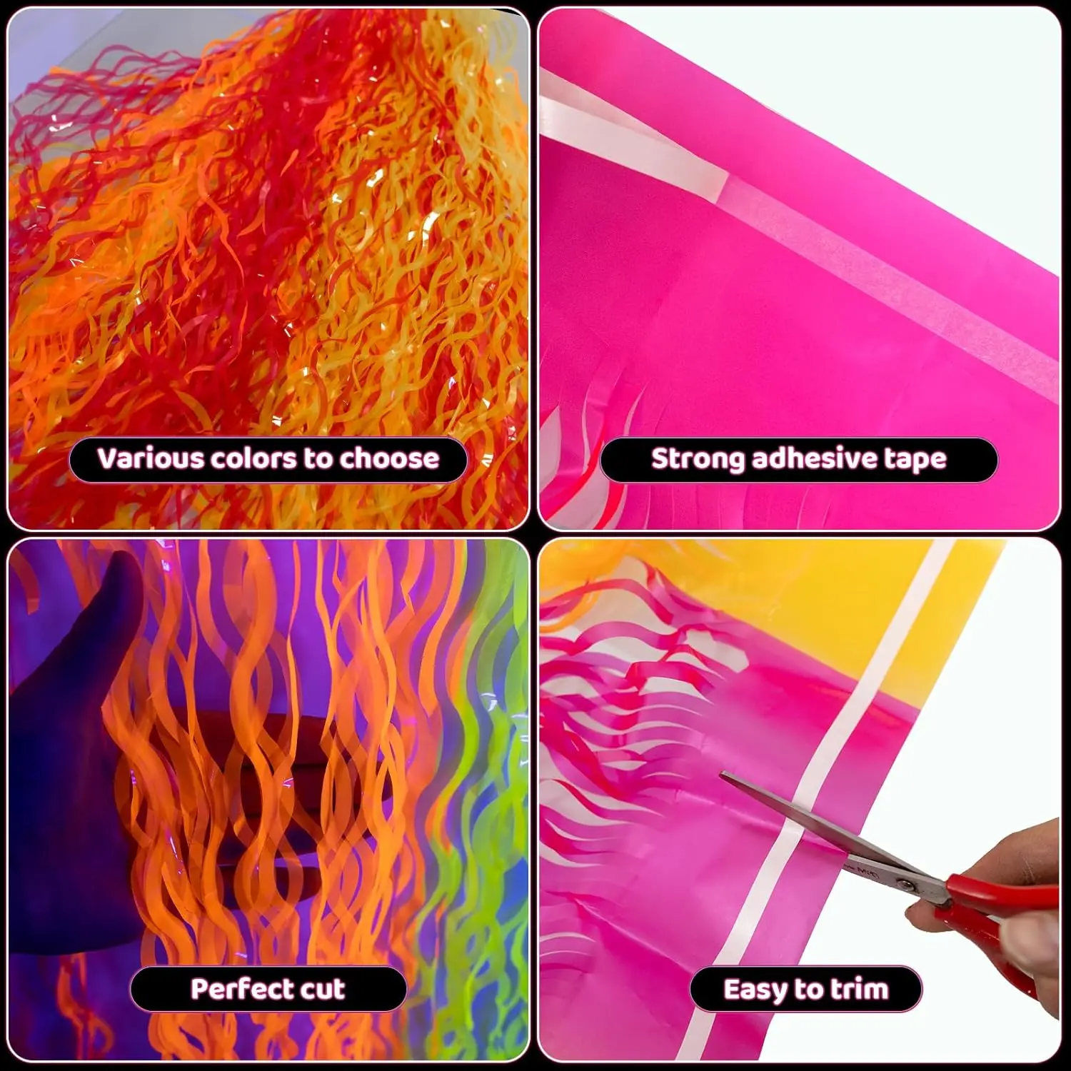 - Decoração de festa versátil – Funciona como saias de mesa, tapeçarias de parede, cenários fotográficos ou decoração de palco.Um item obrigatório para festas luminosas, raves, aniversários, Halloween, eventos de luz negra ou qualquer ocasião que precise de decorações vibrantes reativas UV.\