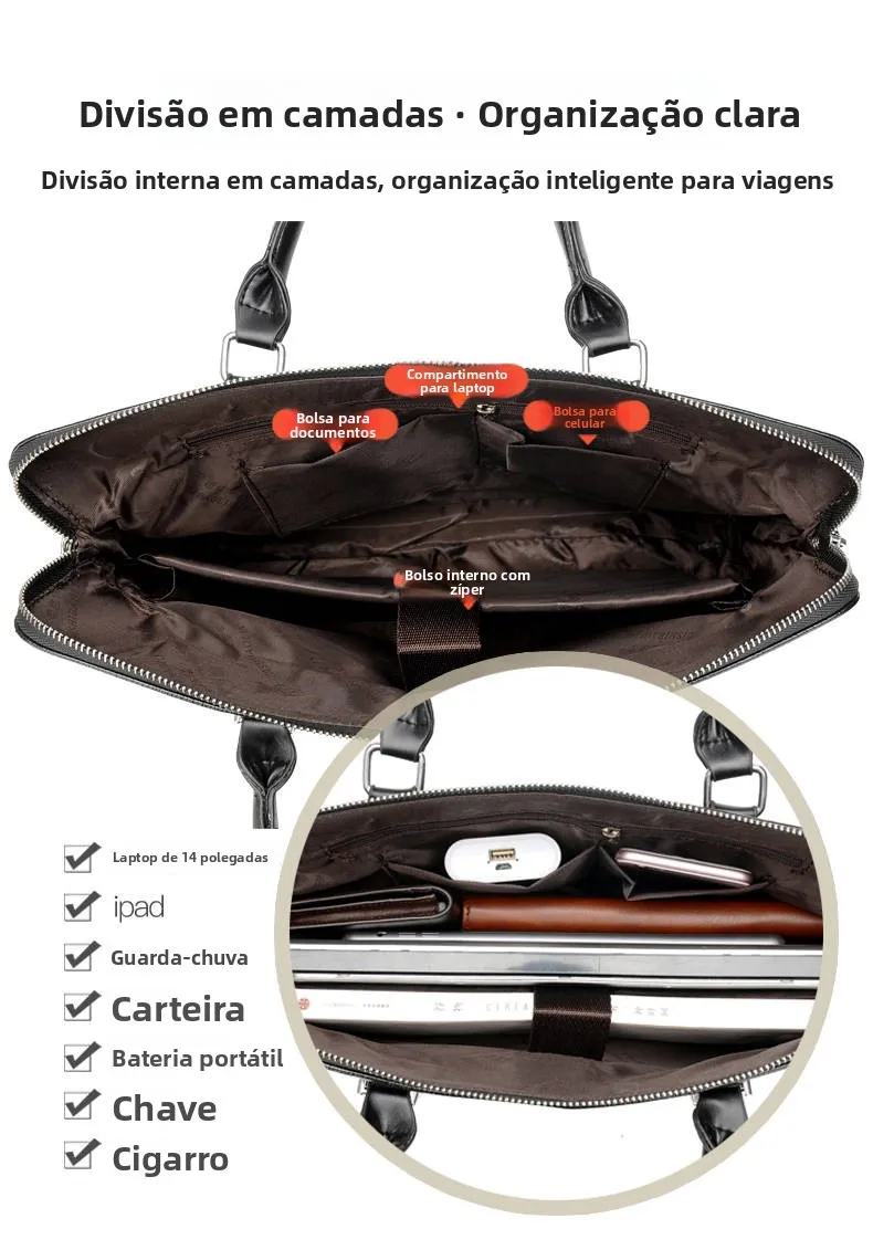 Com um estilo de negócios elegante, este saco é ideal para ambientes profissionais, destacando-se pela sua funcionalidade e design moderno.