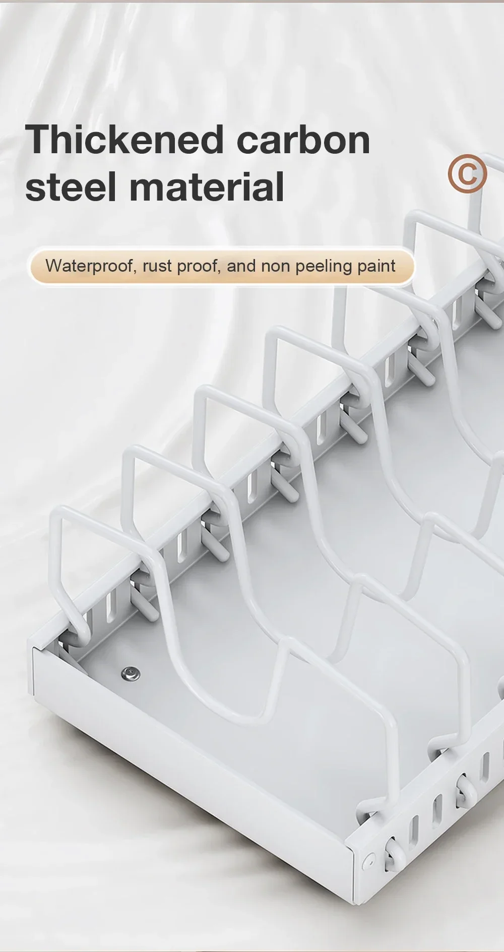 2.O organizador de panelas do armário vem com 8 compartimentos ajustáveis, você pode instalar o organizador de panelas de acordo com o tamanho de panelas e panelas.