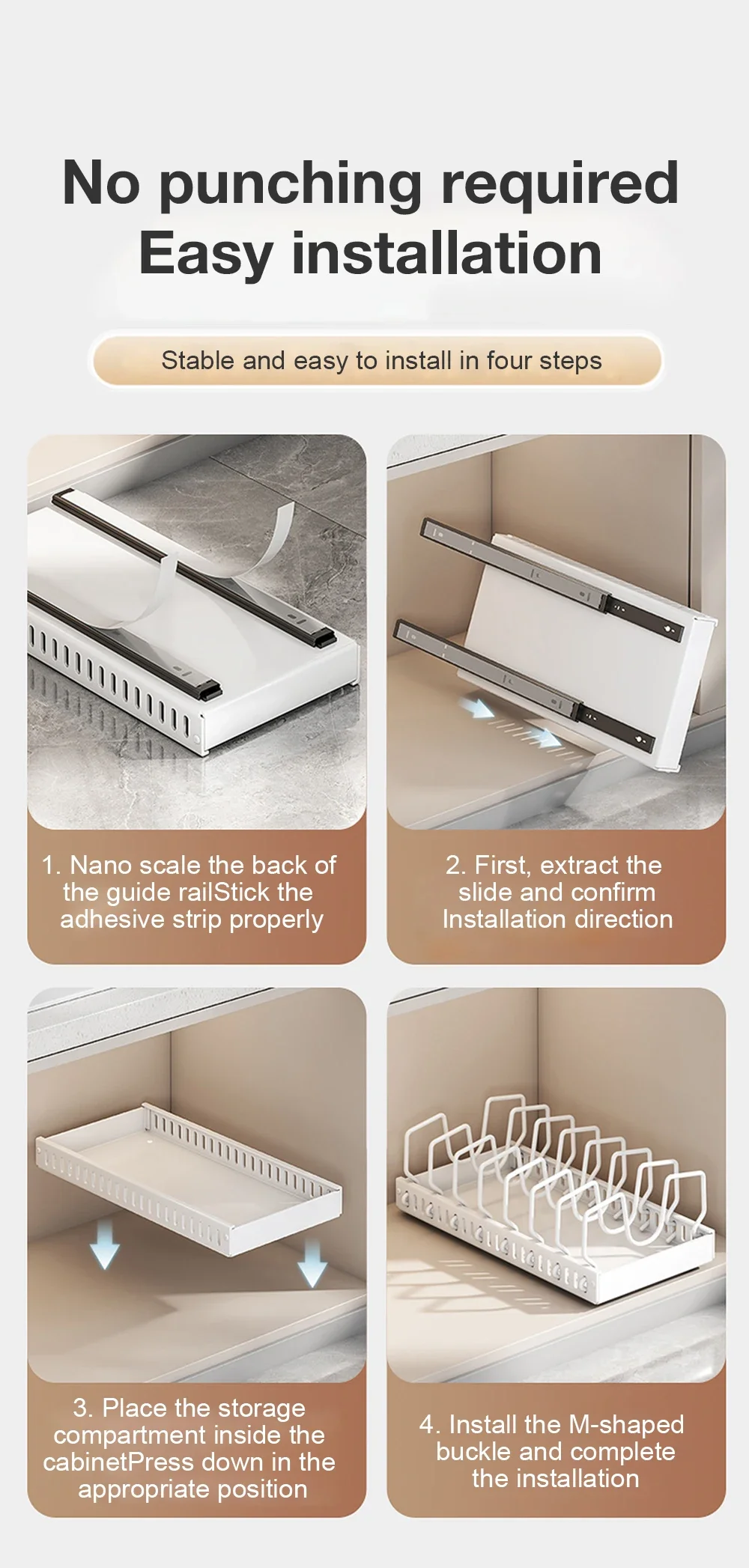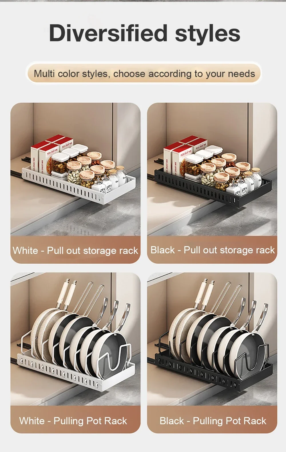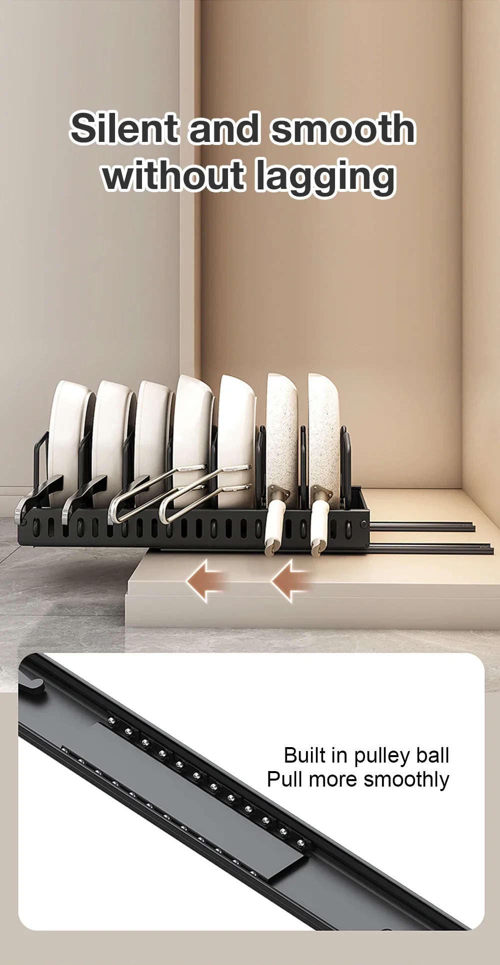 4.Este suporte para panelas é projetado com trilhos deslizantes e bolas de polia embutidas, com apenas um puxão suave, você pode armazenar ou retirar seus utensílios de cozinha, não precisa mais agachar, procurar e organizar seus utensílios de cozinha.
